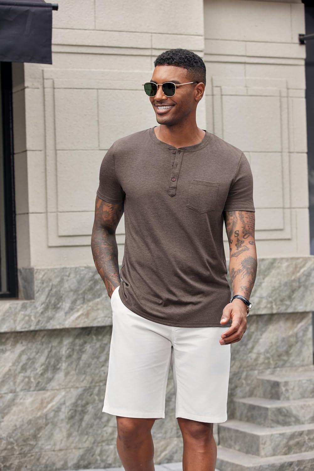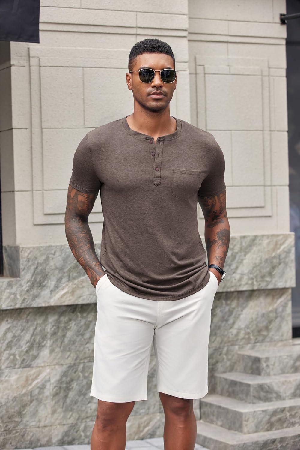 COOFANDY Men’s Soft Henley Short Sleeve T Shirts Casual Basic Shirt with Pocket 3 Button Tees Summer Tops(Brown)