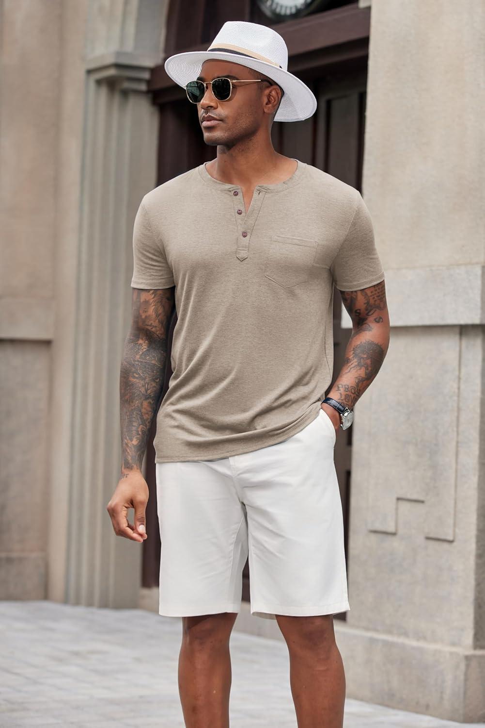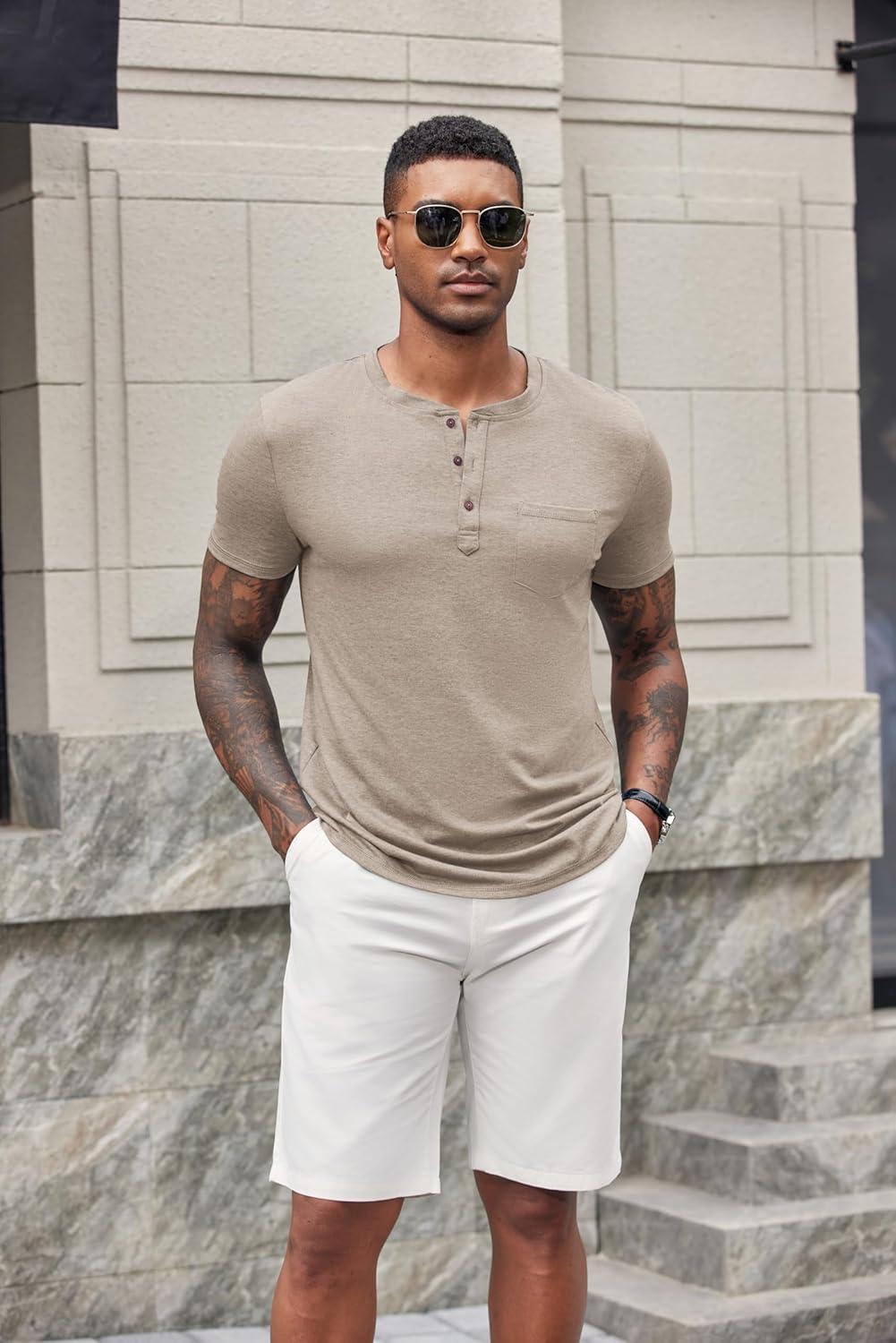COOFANDY Men’s Soft Henley Short Sleeve T Shirts Casual Basic Shirt with Pocket 3 Button Tees Summer Tops(Dark Khaki)