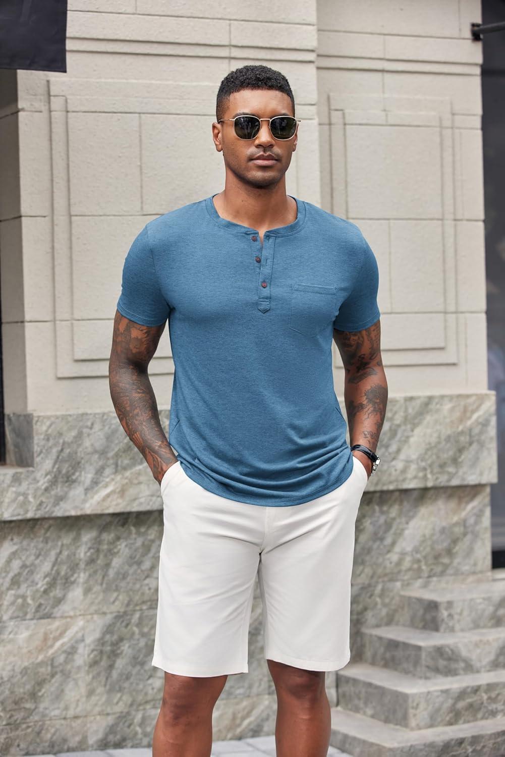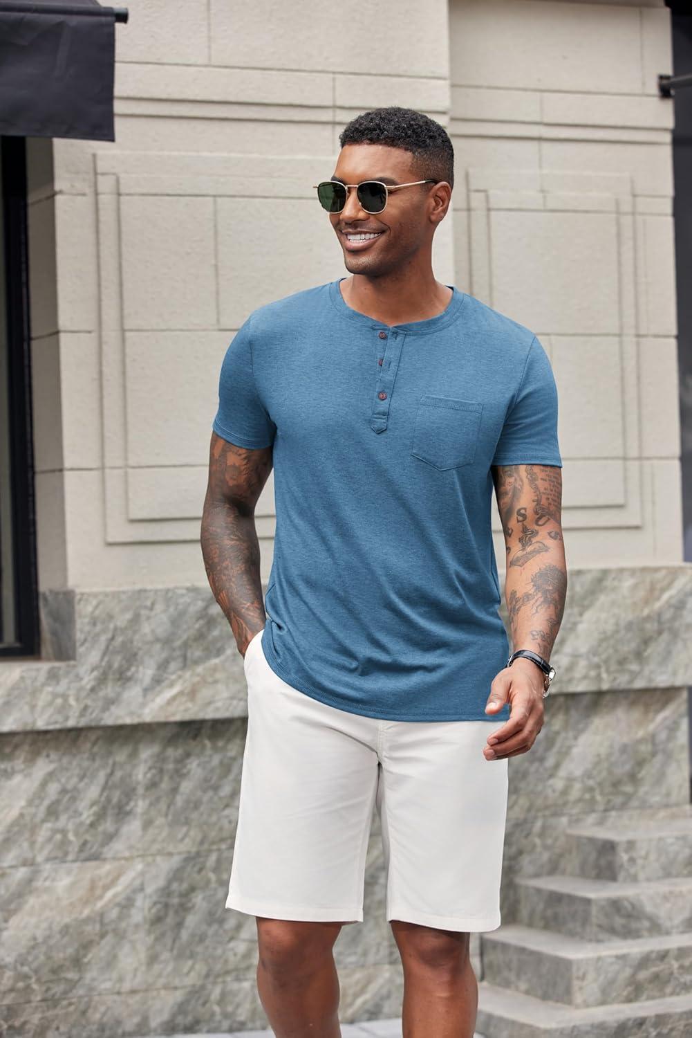 COOFANDY Men's Soft Henley Short Sleeve T Shirts Casual Basic Shirt with Pocket 3 Button Tees Summer Tops(Demin Blue)