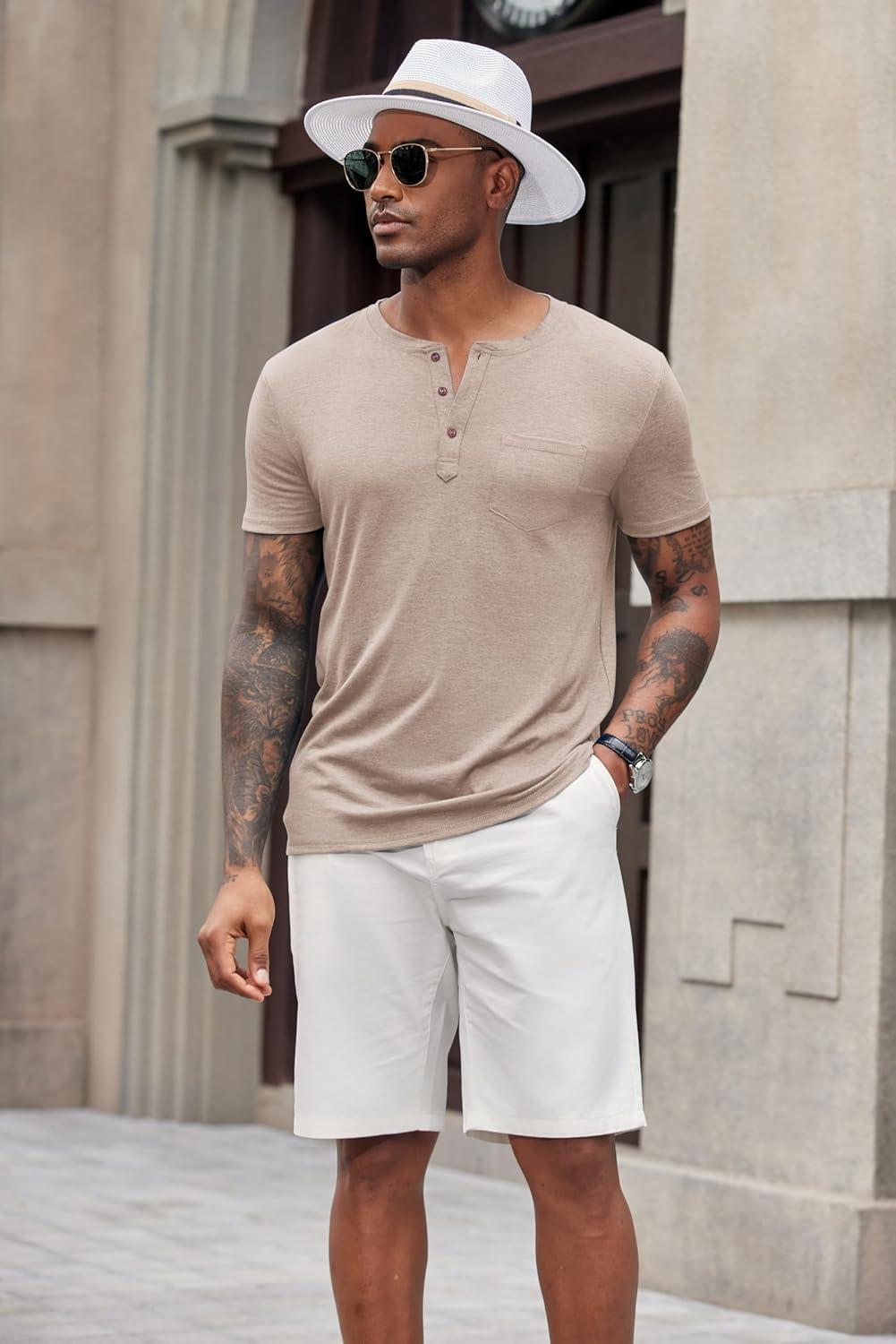 COOFANDY Men’s Soft Henley Short Sleeve T Shirts Casual Basic Shirt with Pocket 3 Button Tees Summer Tops(Khaki)