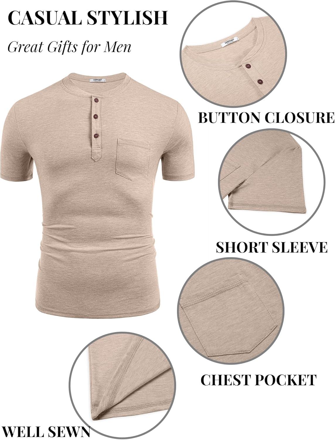 COOFANDY Men's Soft Henley Short Sleeve T Shirts Casual Basic Shirt with Pocket 3 Button Tees Summer Tops(Khaki)