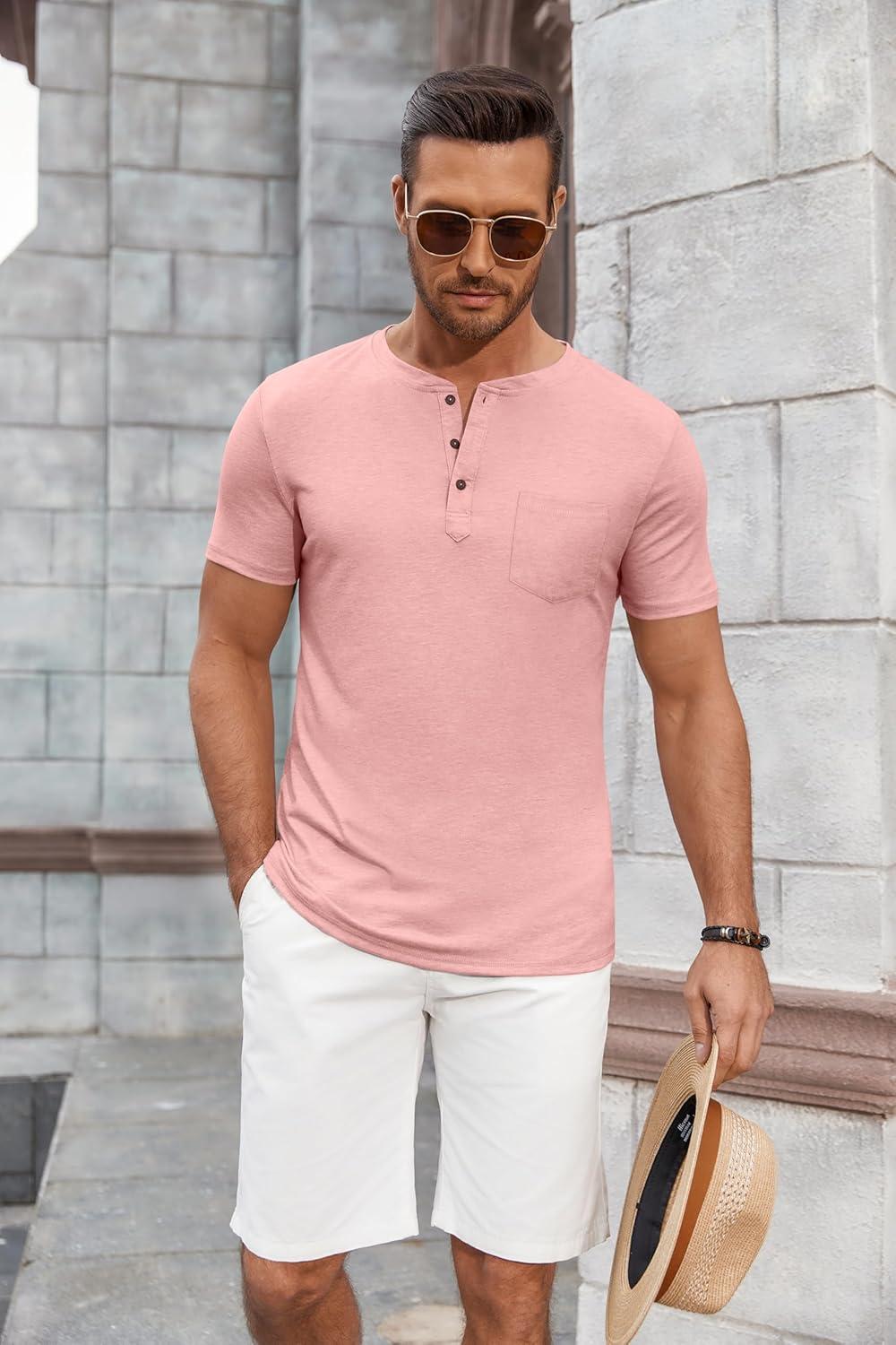 COOFANDY Men’s Soft Henley Short Sleeve T Shirts Casual Basic Shirt with Pocket 3 Button Tees Summer Tops(Pink)