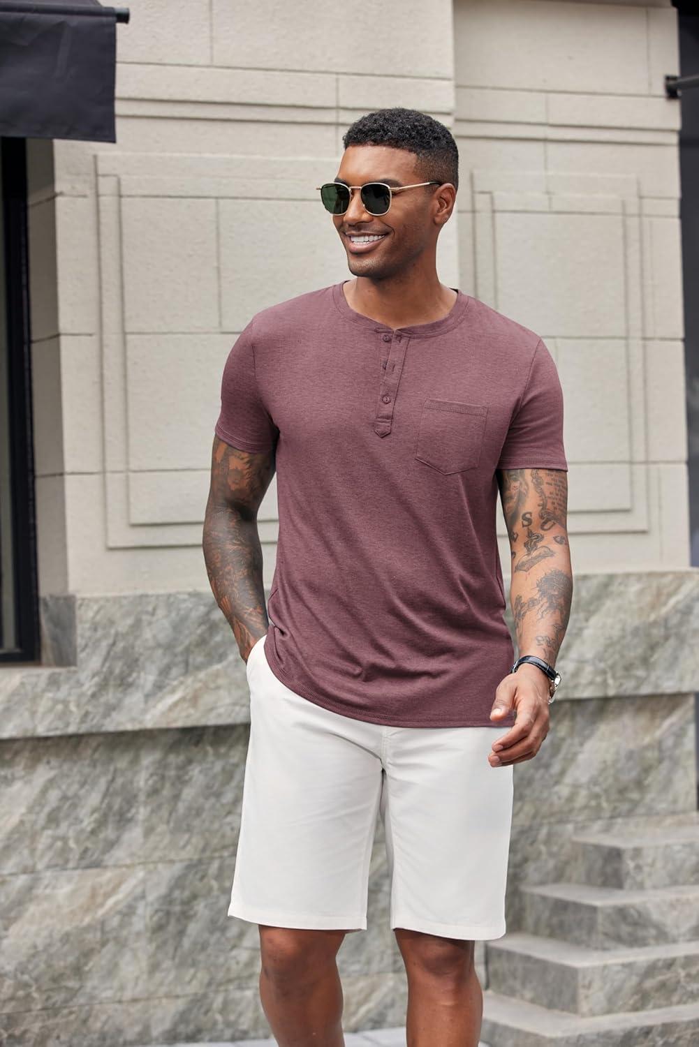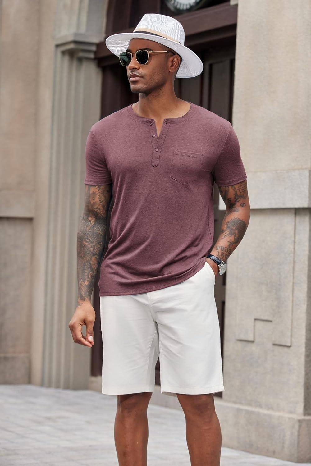 COOFANDY Men’s Soft Henley Short Sleeve T Shirts Casual Basic Shirt with Pocket 3 Button Tees Summer Tops(Wine Red)