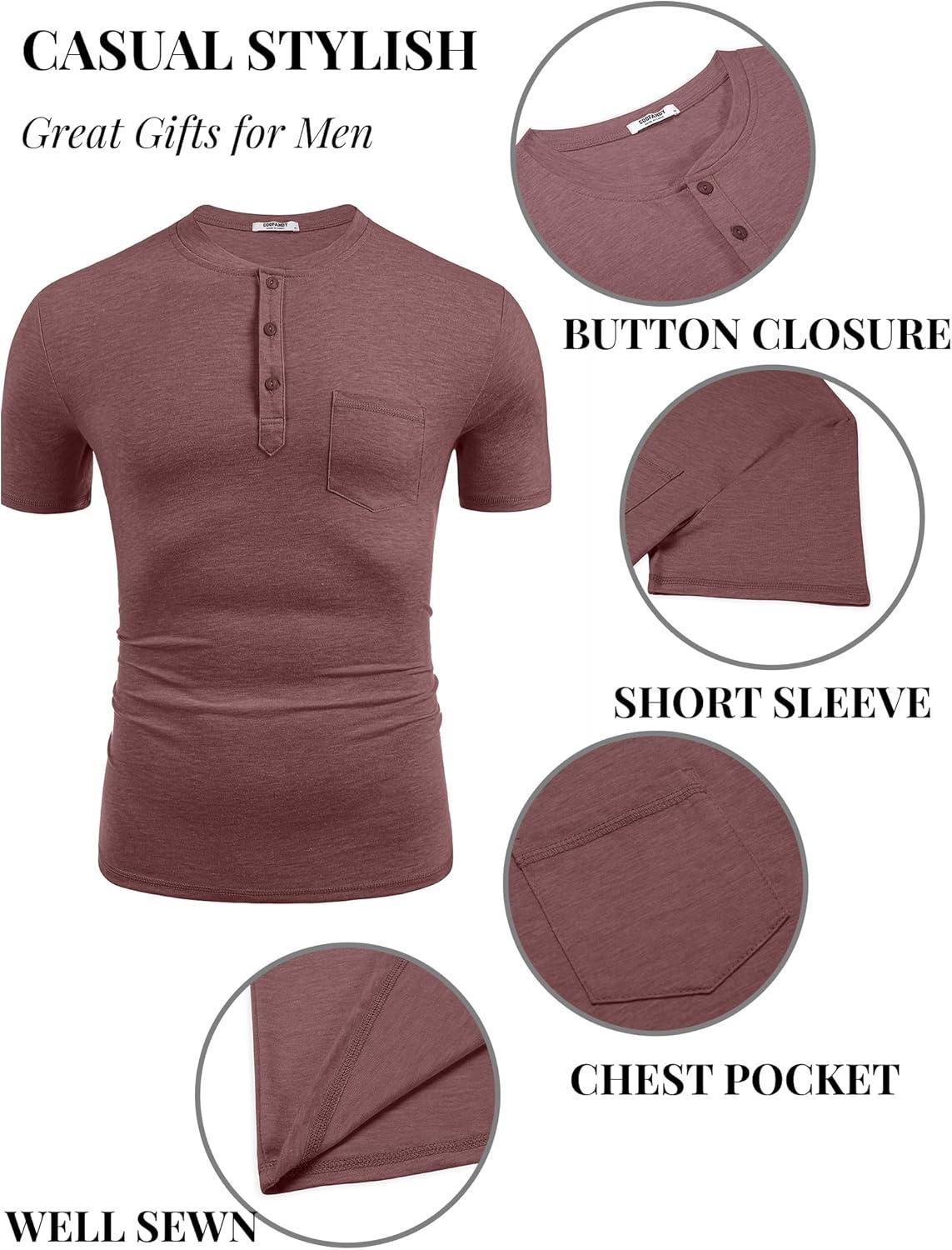 COOFANDY Men's Soft Henley Short Sleeve T Shirts Casual Basic Shirt with Pocket 3 Button Tees Summer Tops(Wine Red)