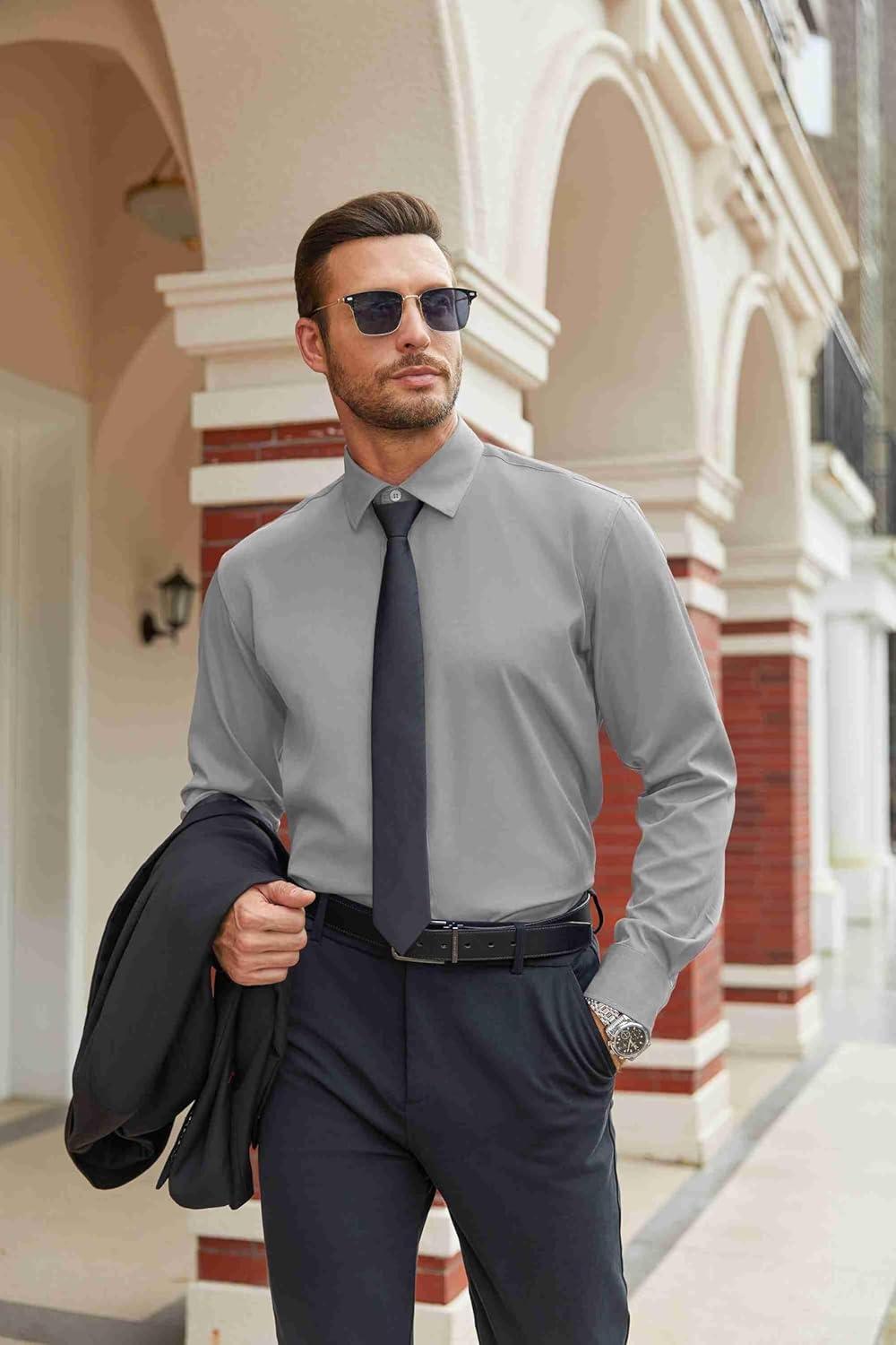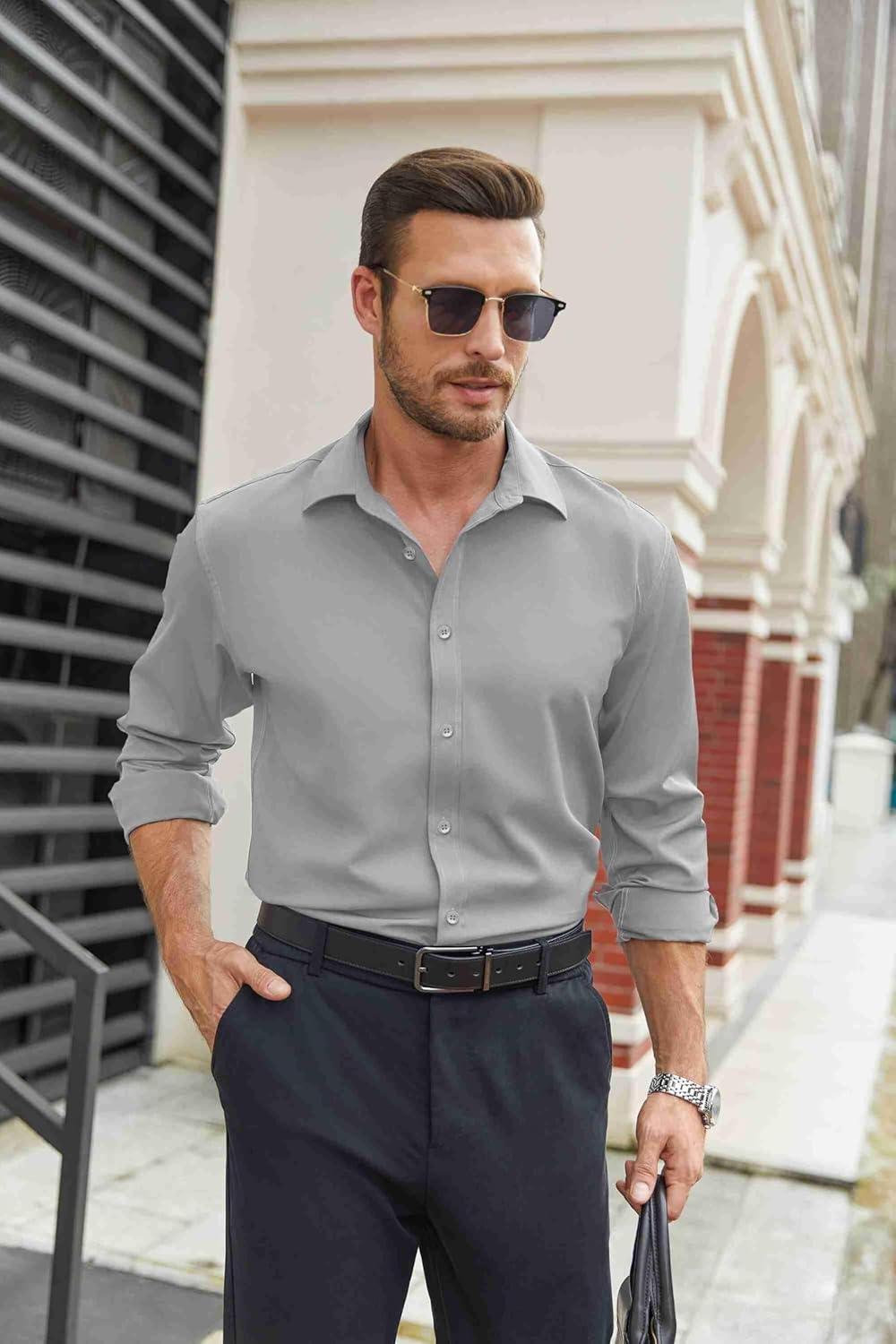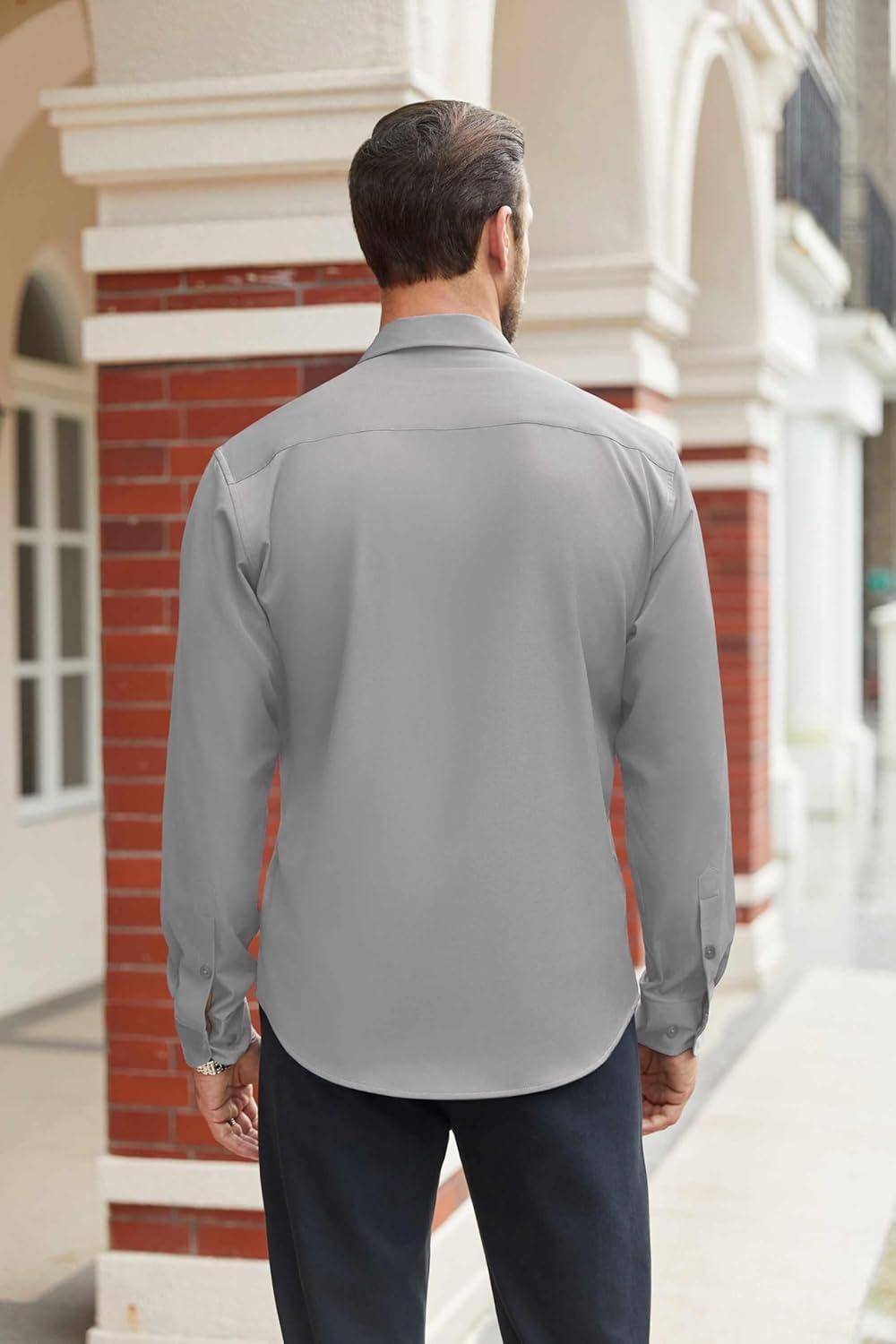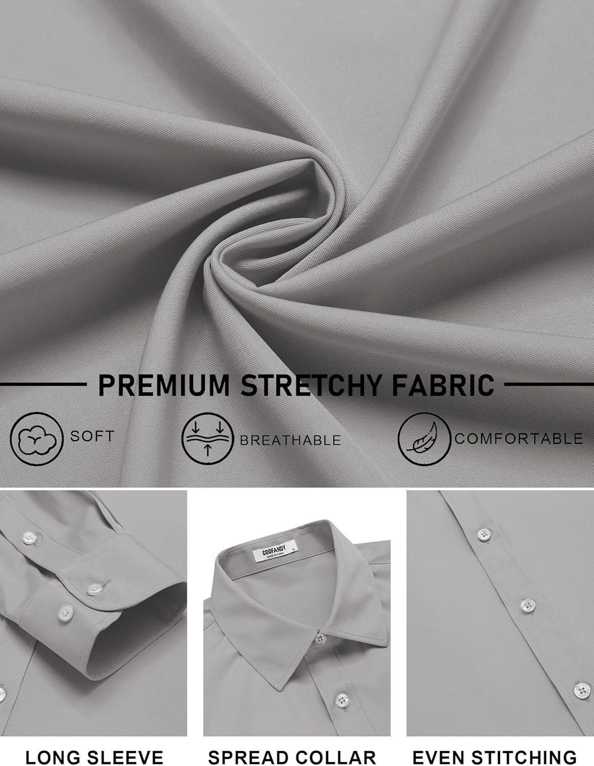 COOFANDY Mens Stretch Dress Shirts Long Sleeve Button Down Shirt Regular Fit Formal Business Shirts(Light Grey)