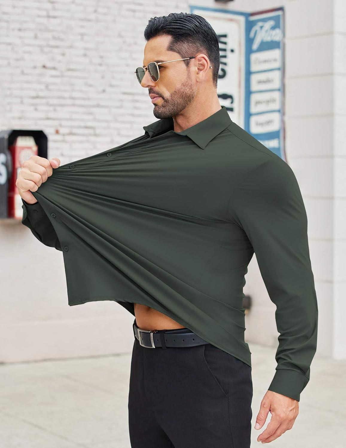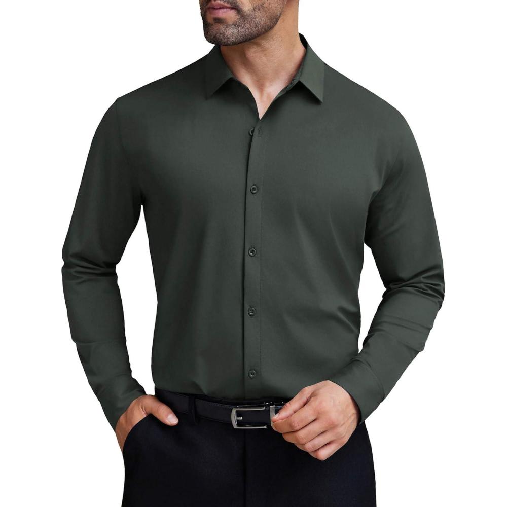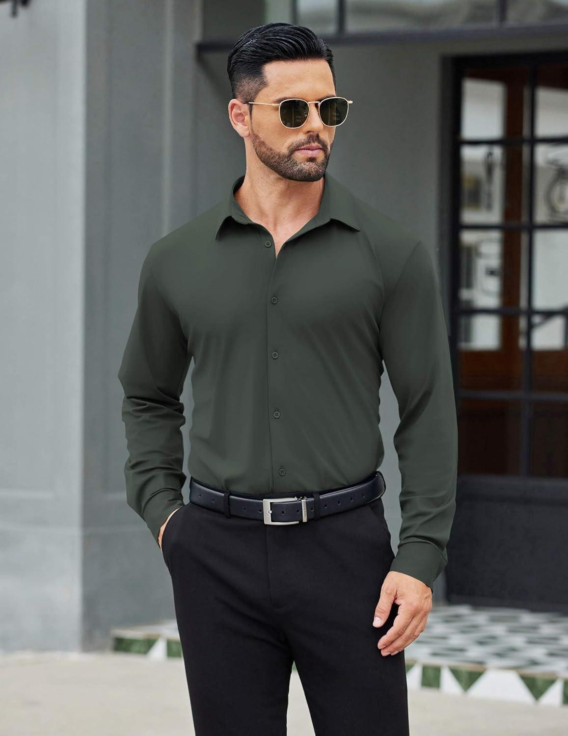 COOFANDY Mens Stretch Dress Shirts Long Sleeve Button Down Shirt Wrinkle Free Formal Business Shirts(Dark Army Green)
