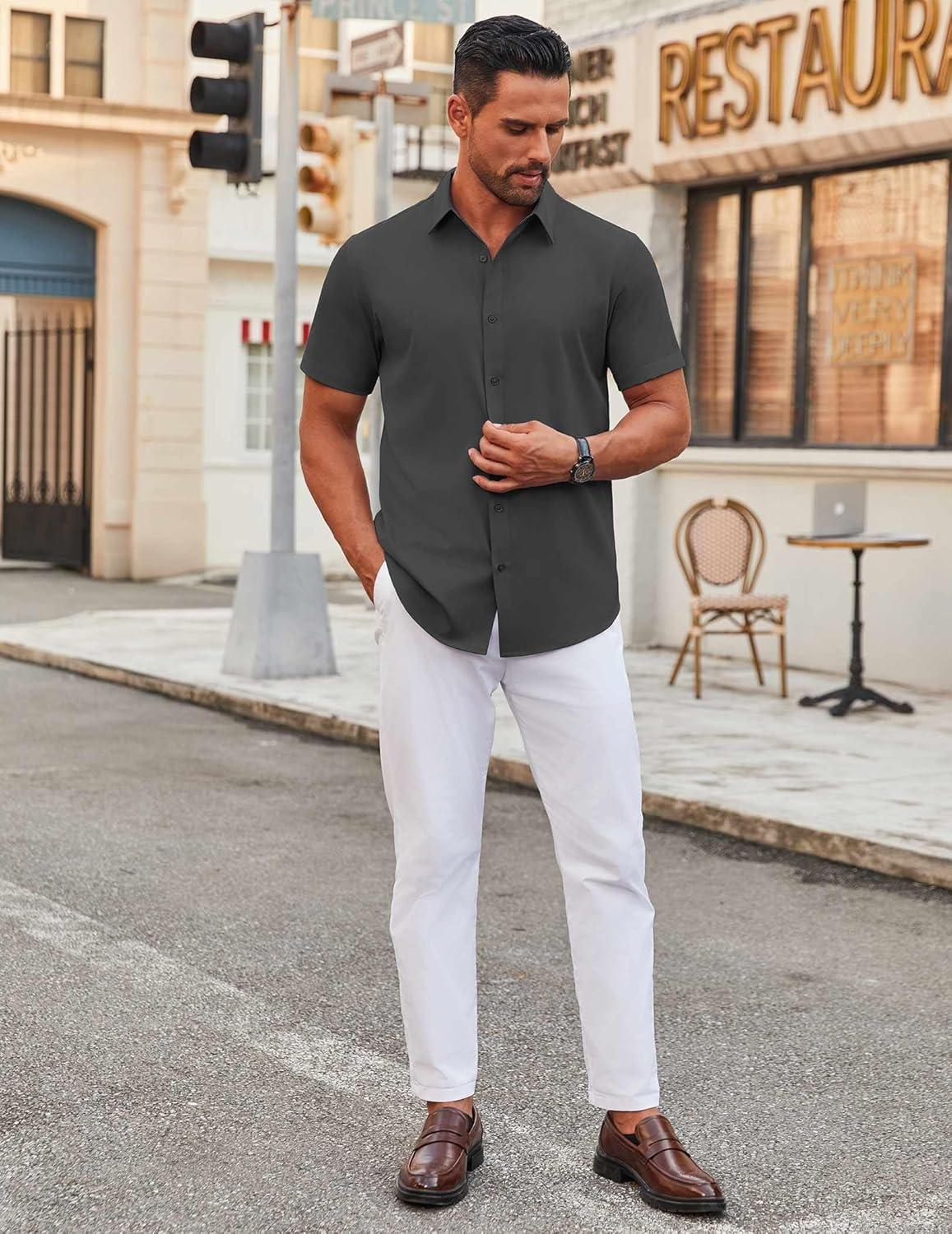 COOFANDY Men’s Stretch Dress Shirts Short Sleeve Wrinkle Free Casual Button Down Shirts(Dark Grey)