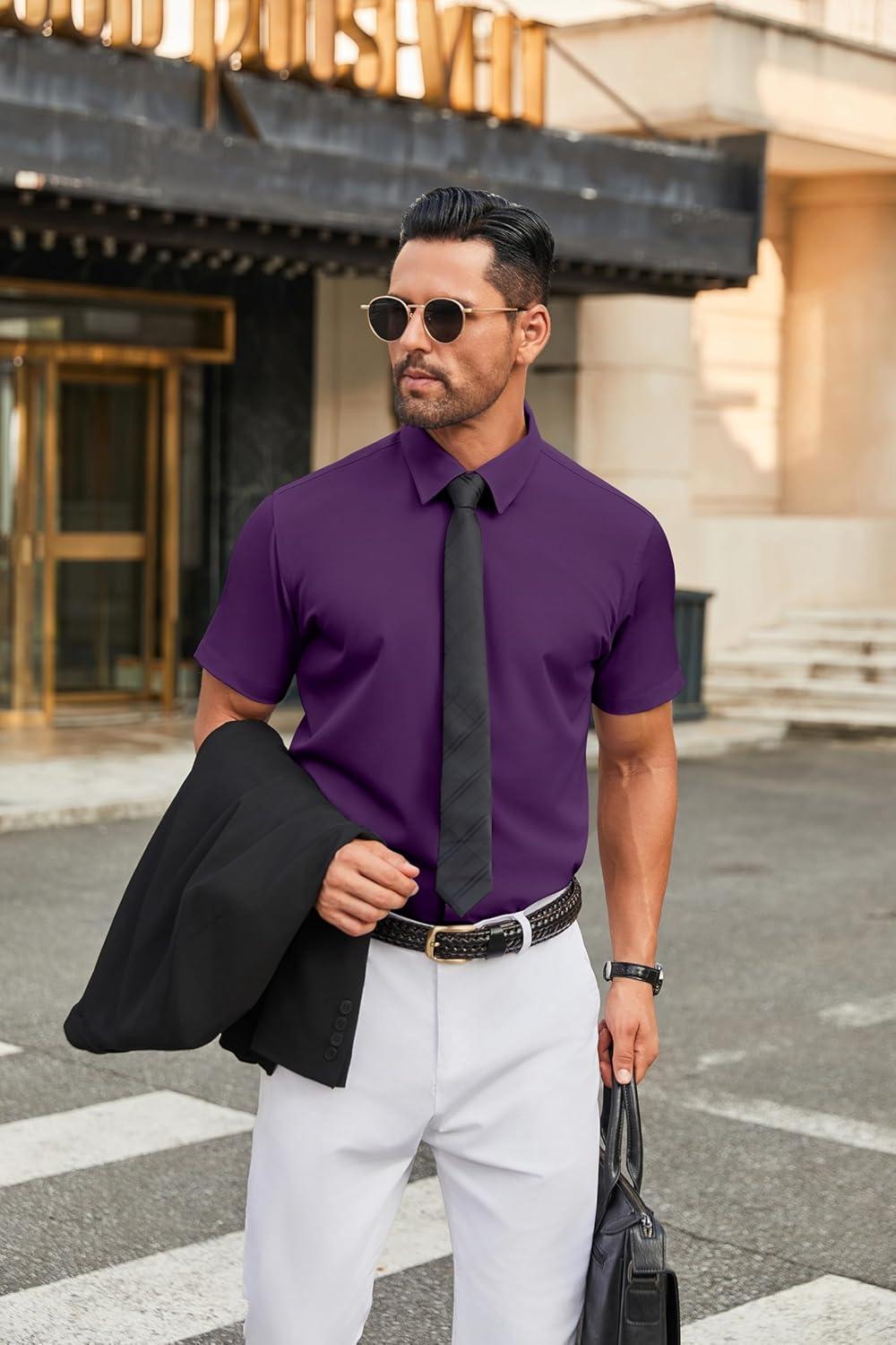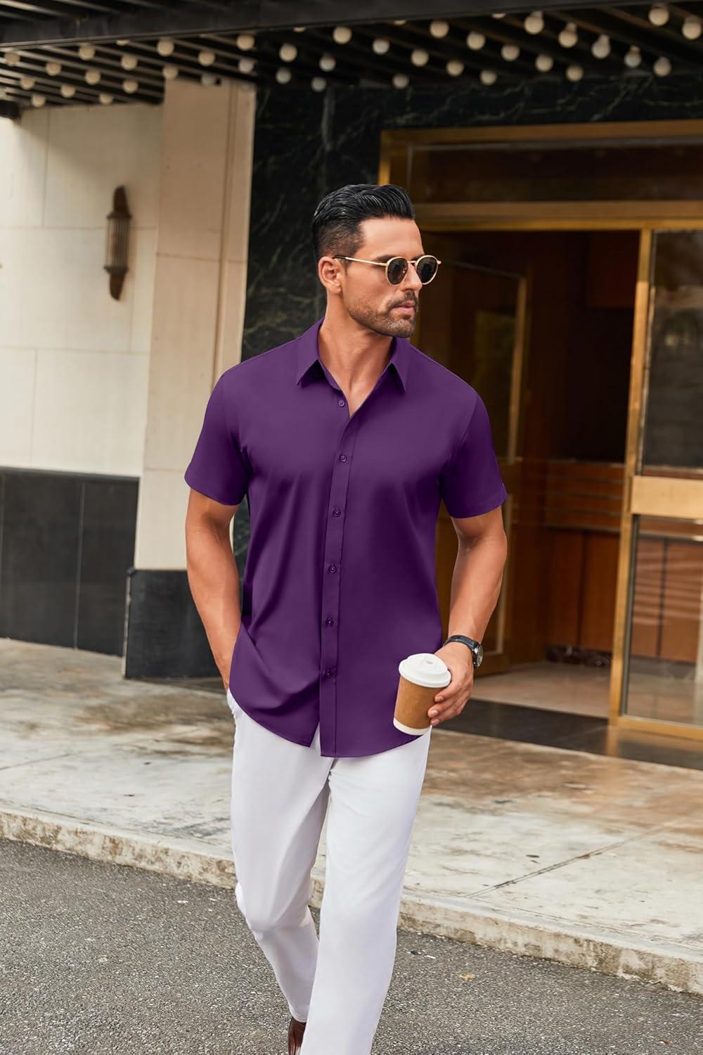 COOFANDY Men's Stretch Dress Shirts Short Sleeve Wrinkle Free Casual Button Down Shirts(Purple)