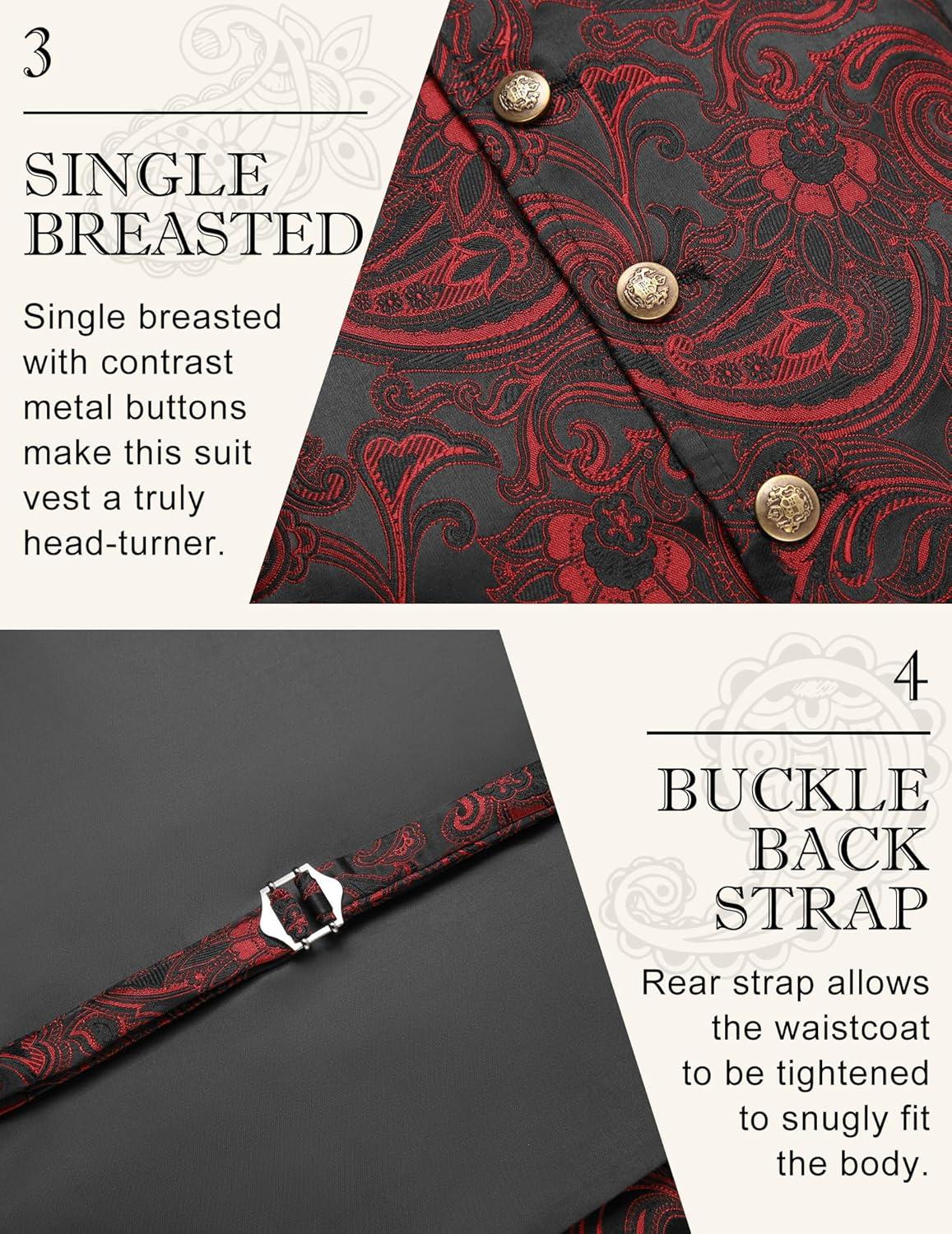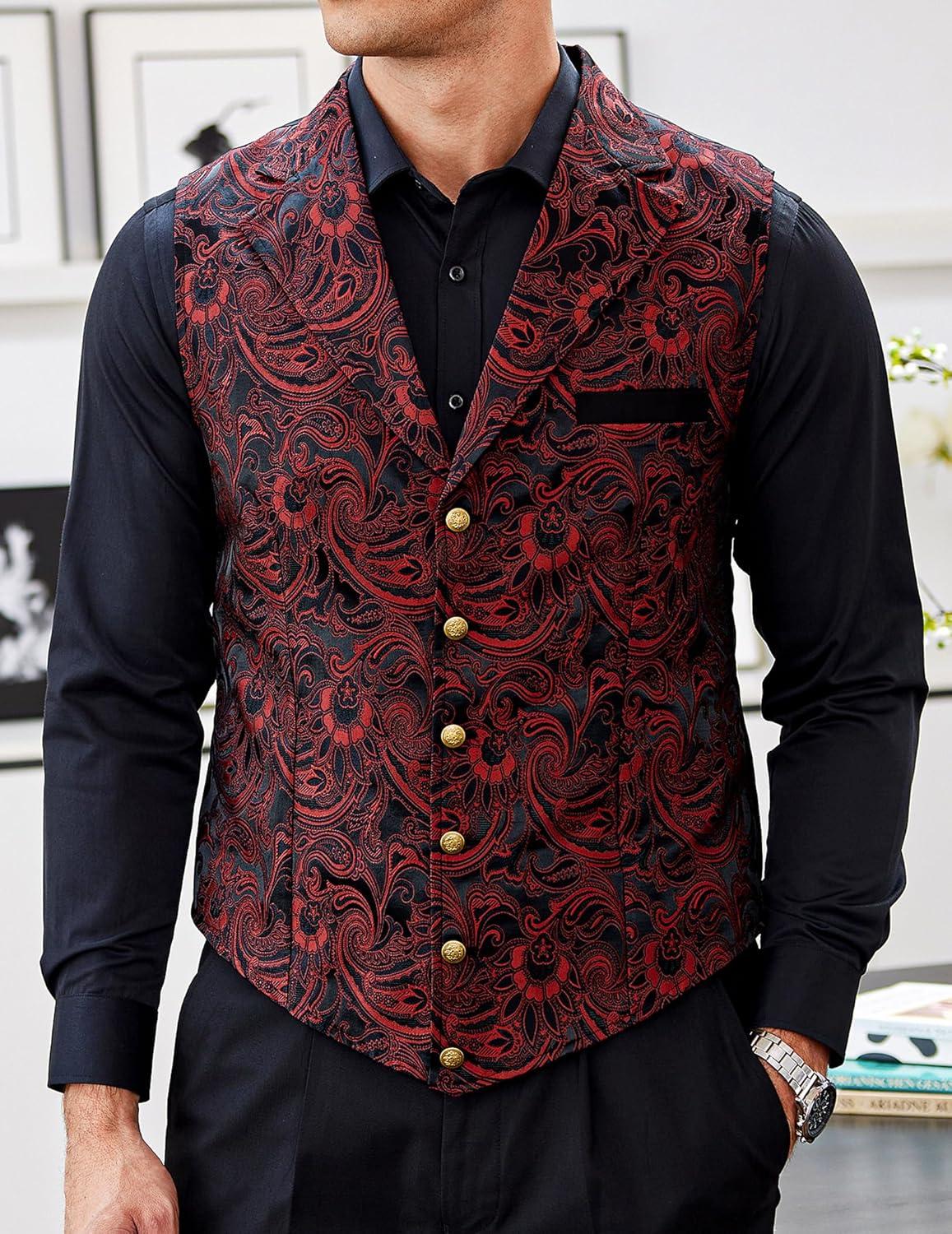 COOFANDY Mens Suit Vest Paisley Floral Victorian Vests Gothic Steampunk Formal Waistcoat Tuxedo Vests with Notched Lapels(Wine Red)
