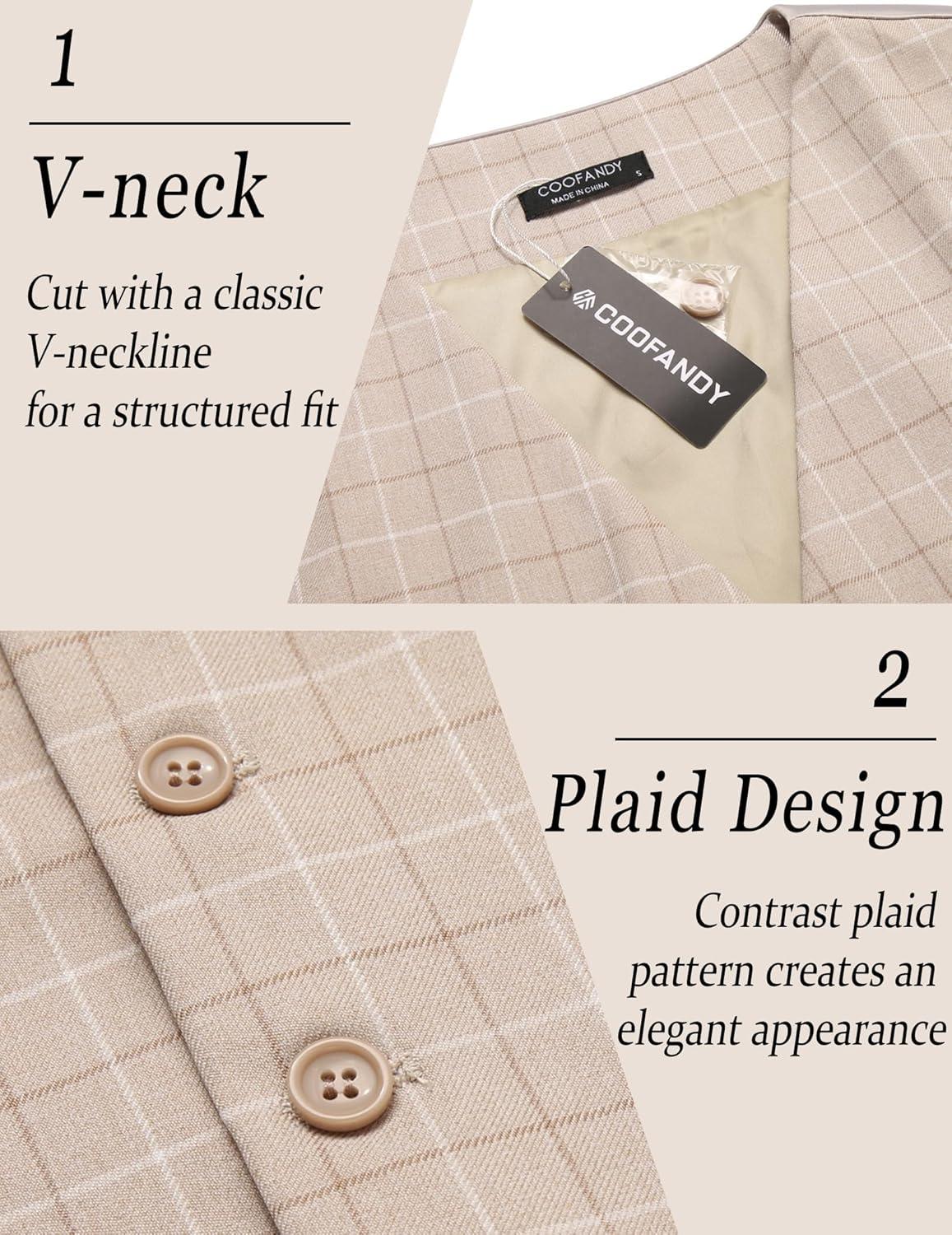 COOFANDY Men’s Suit Vest Slim Fit Business Formal Waistcoat Casual Dress Vest(Plaid Khaki)