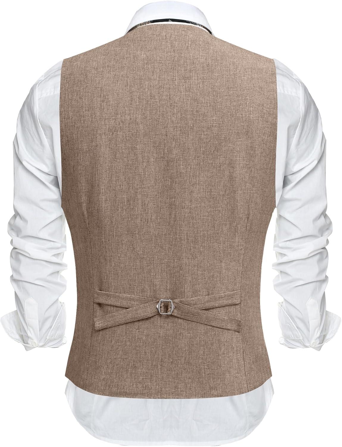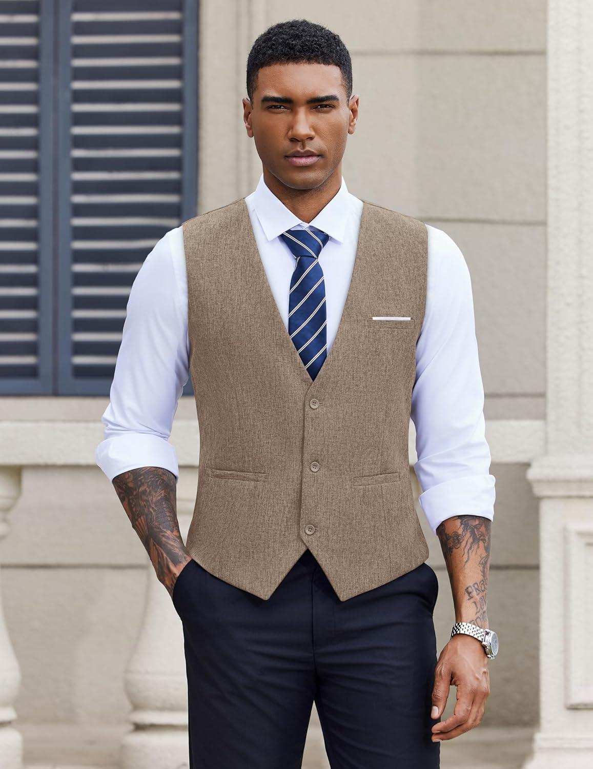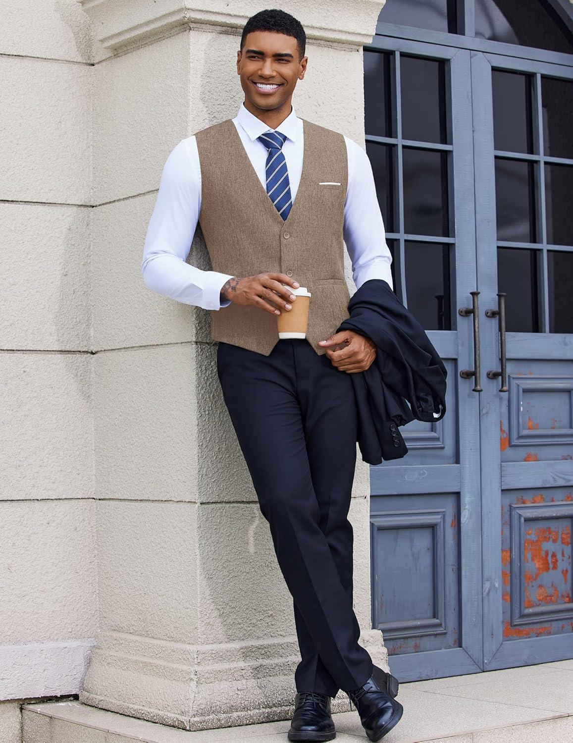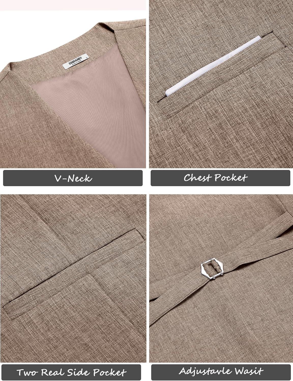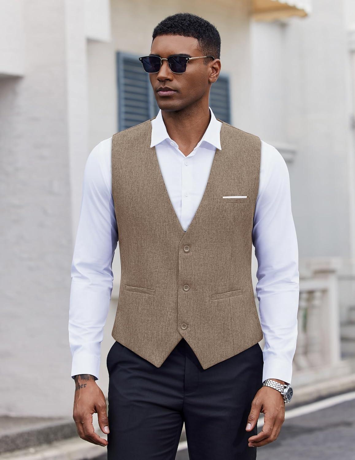 COOFANDY Men's Suit Vest Slim Fit Casual Business Vests Lightweight V-Neck Formal Dress Waistcoat for Wedding Prom(Khaki)