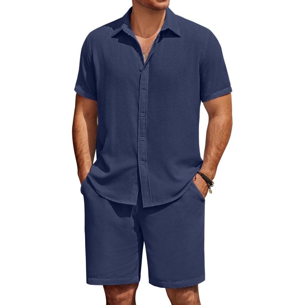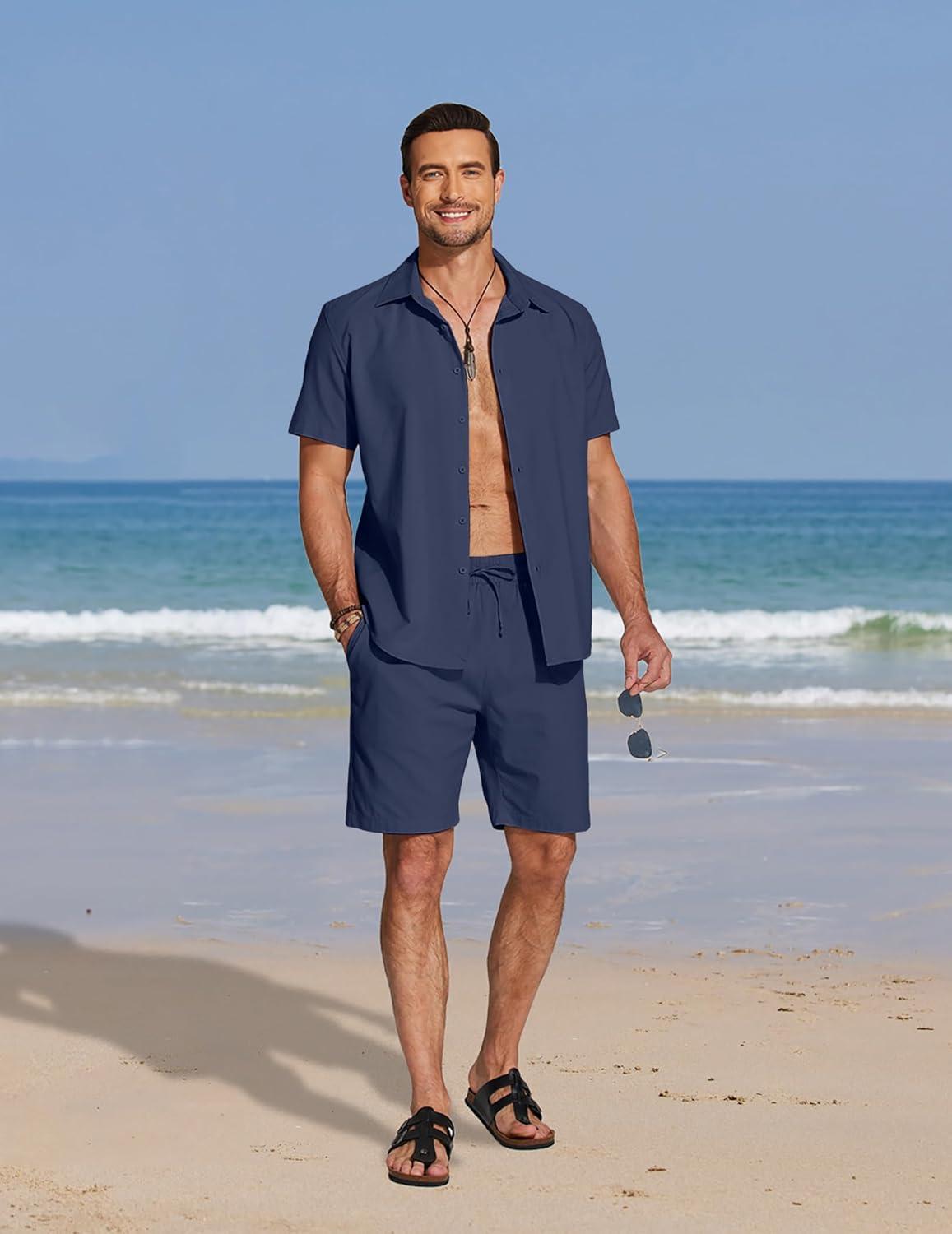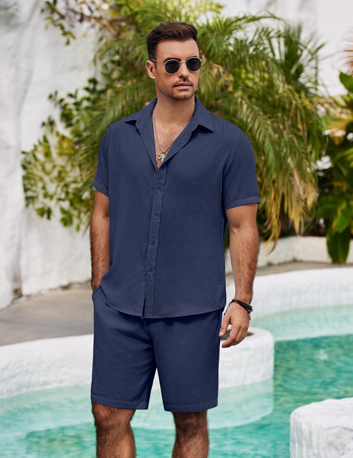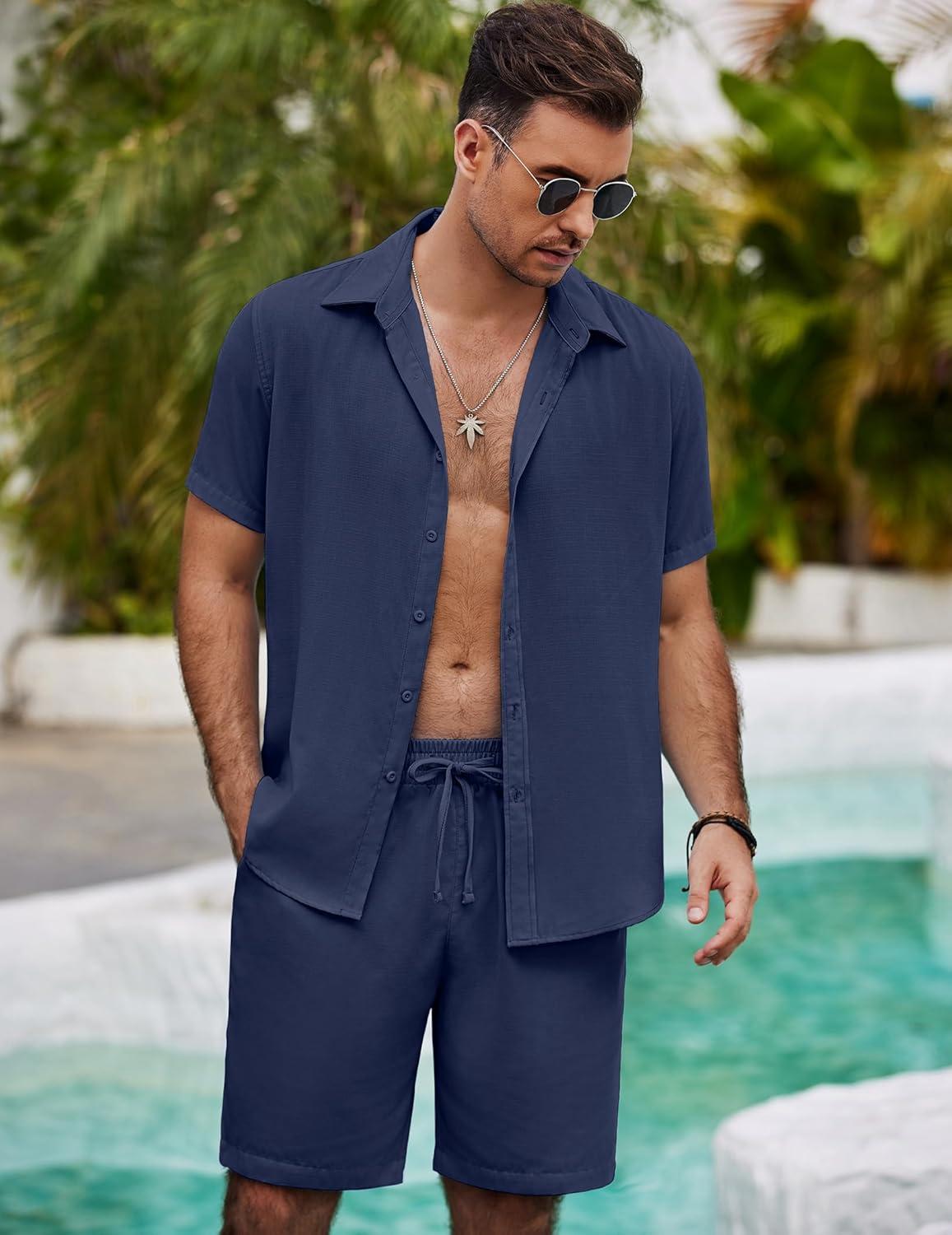 COOFANDY Men's Casual Swimming set: Summer Beach Regular Fit Sets. Crafted from a soft and breathable linen blend fabric, providing cool, lightness, and all-day comfort. It's skin-friendly and requires no ironing. This summer shirts and shorts set from COOFANDY offers a relaxed, vacation-ready and vacation trip vibe, keeping you cool even in hot summer weather. Linen feature provide the perfect light and airy texture for warm days, and you can wear it loose, open, or rolled up to match your summer style. It's the most essential outfit for your wardrobe.
