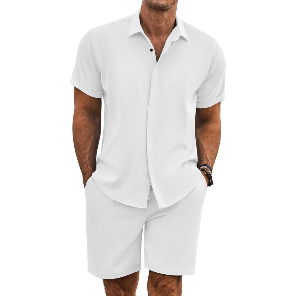 COOFANDY Men’s Summer Beach Outfits 2 Piece Short Sleeve Shirts and Shorts Vacation Texture Linen Sets for Men(A White)