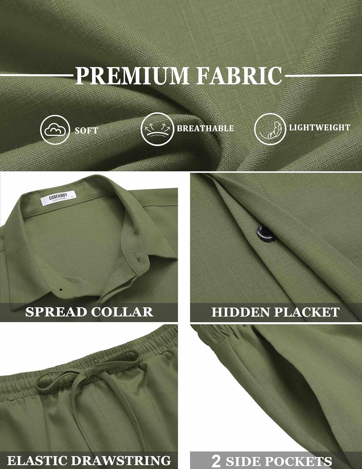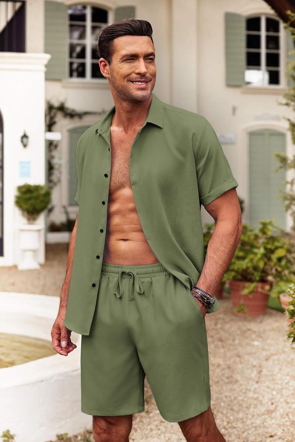 COOFANDY Men's Summer Beach Outfits 2 Piece Short Sleeve Shirts and Shorts Vacation Texture Linen Sets for Men(Army Green)