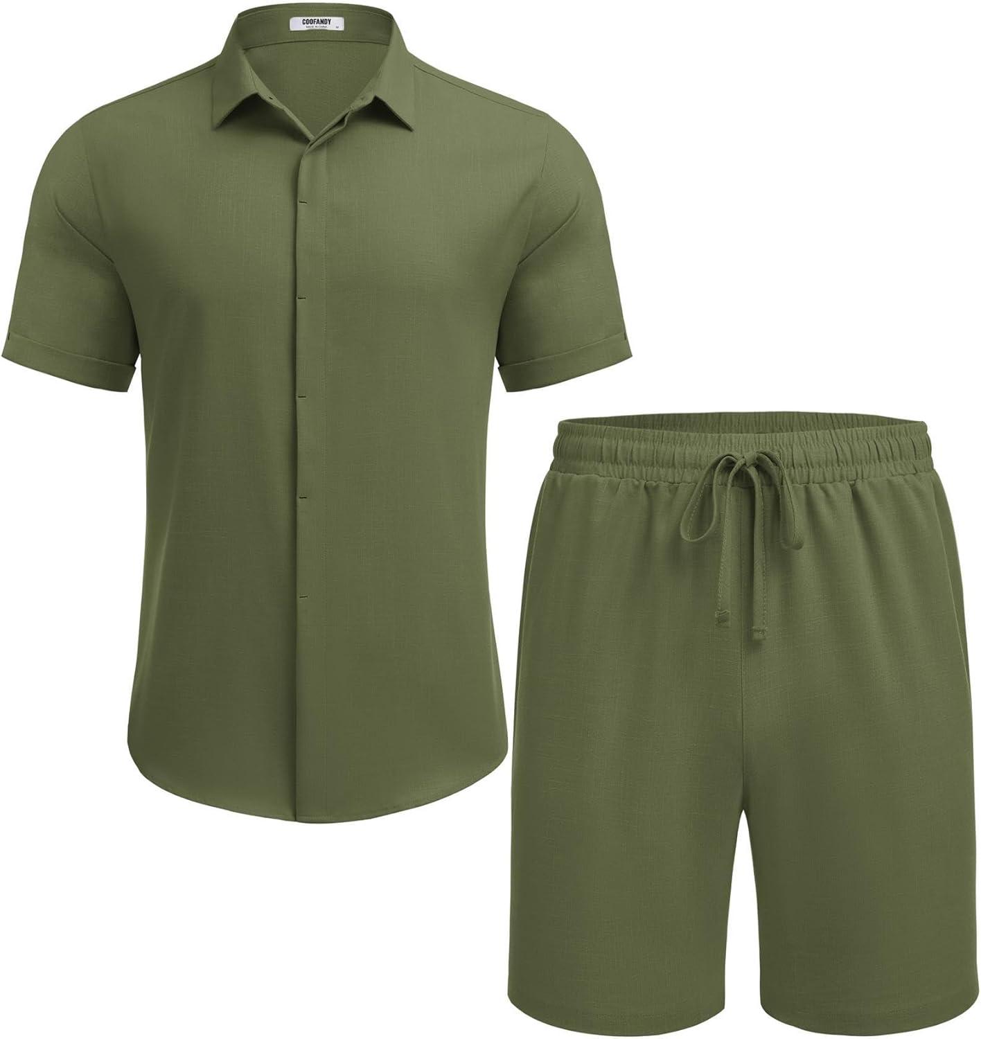 COOFANDY Men’s Summer Beach Outfits 2 Piece Short Sleeve Shirts and Shorts Vacation Texture Linen Sets for Men(Army Green)