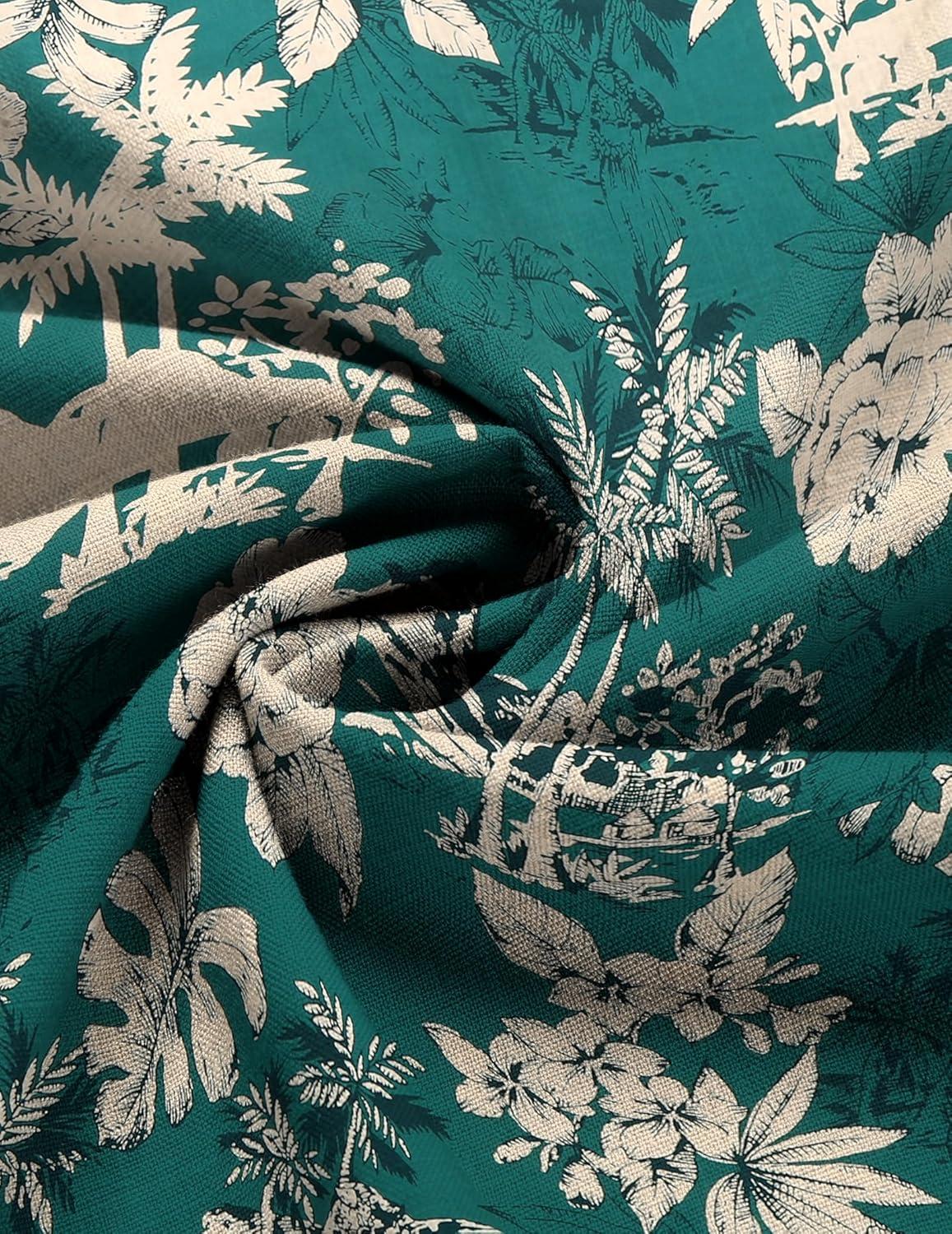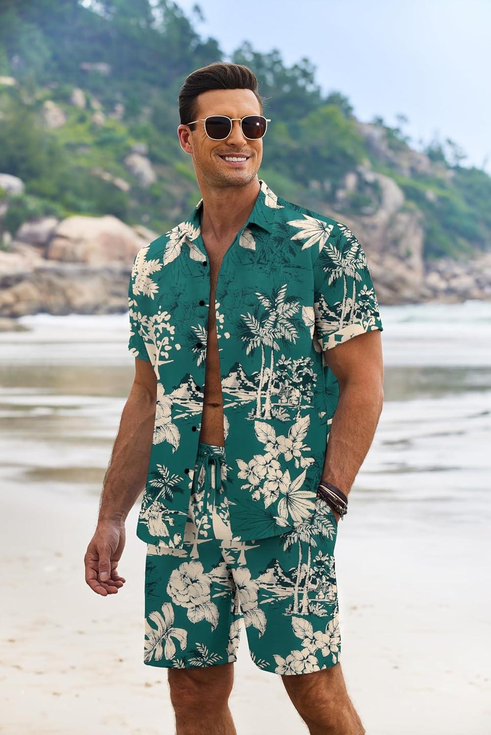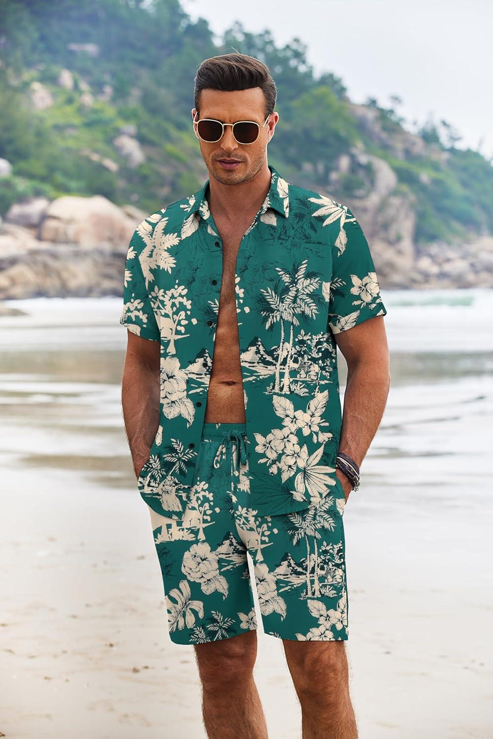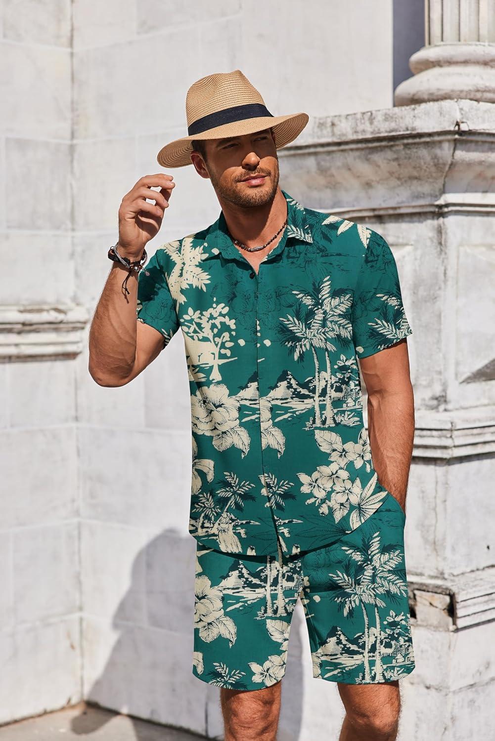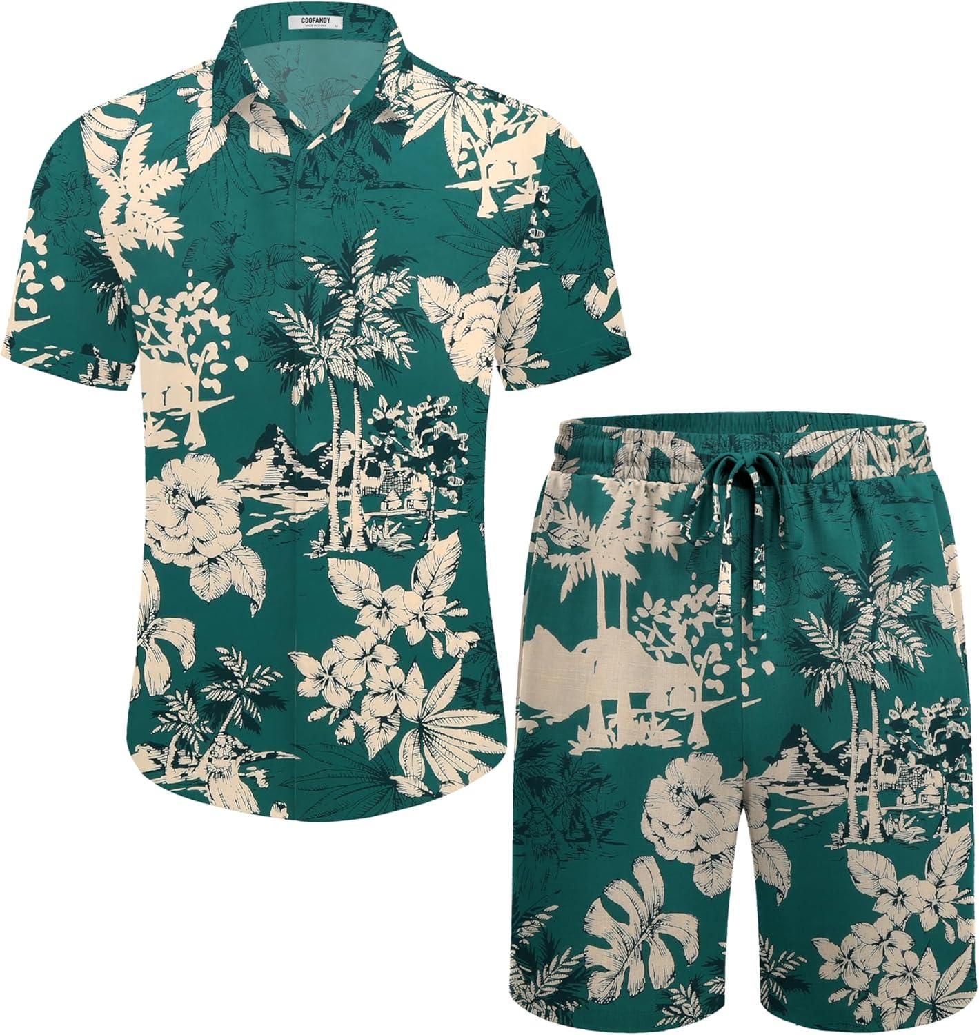 COOFANDY Men’s Summer Beach Outfits 2 Piece Short Sleeve Shirts and Shorts Vacation Texture Linen Sets for Men(Coconut Tree-green)