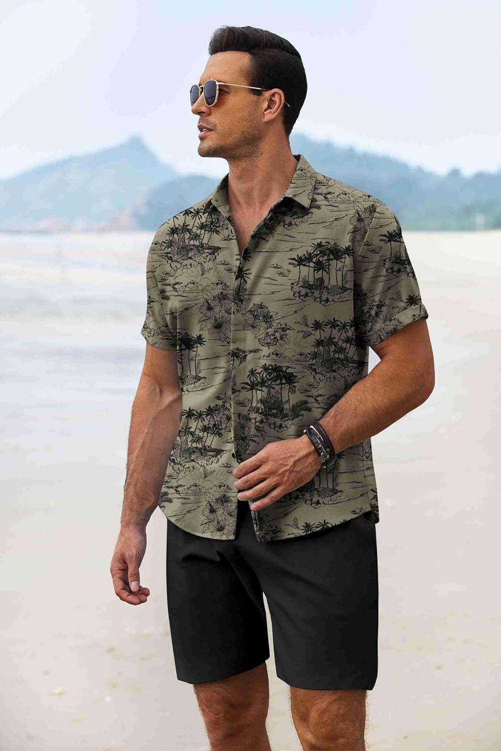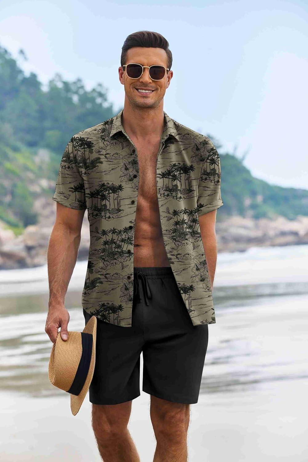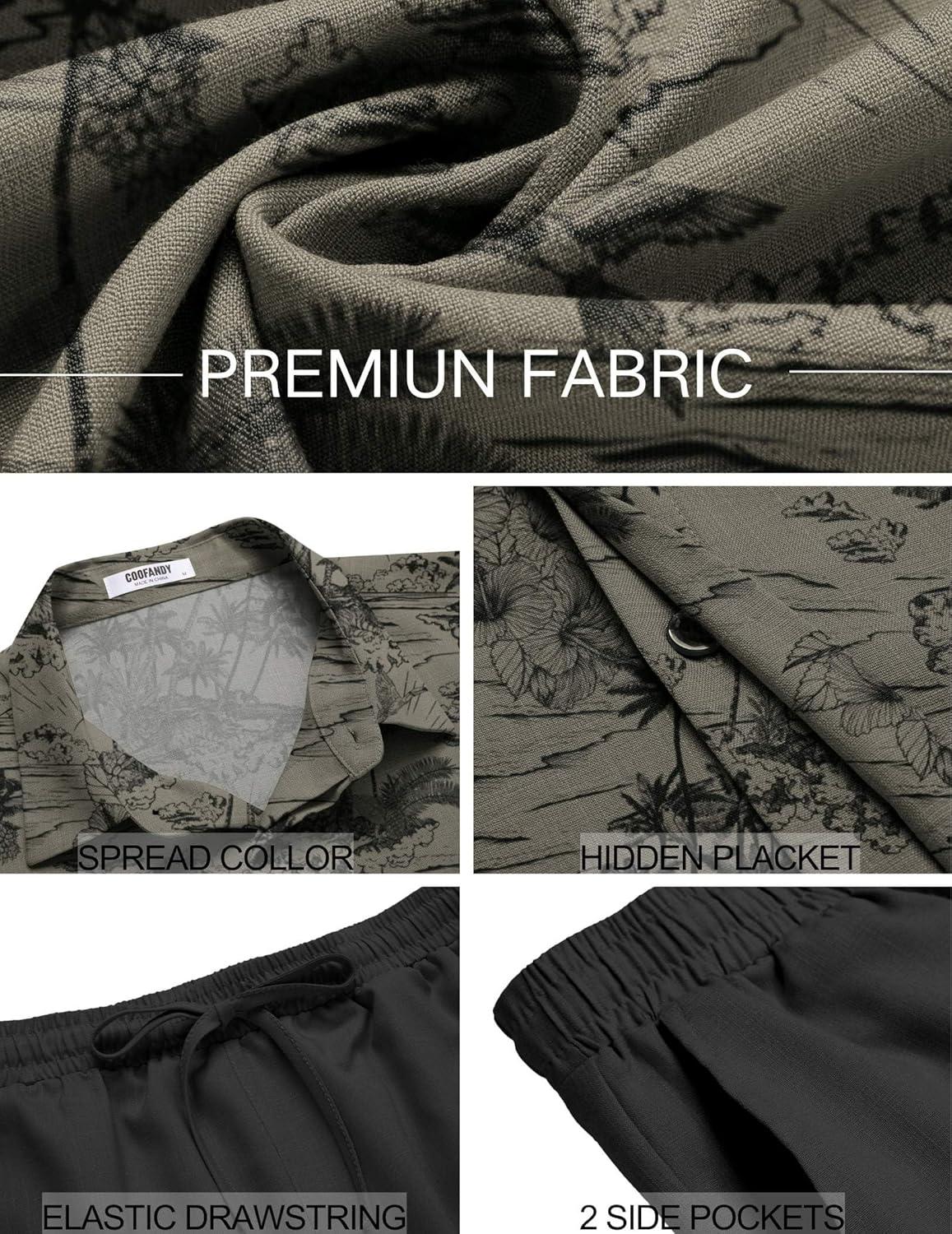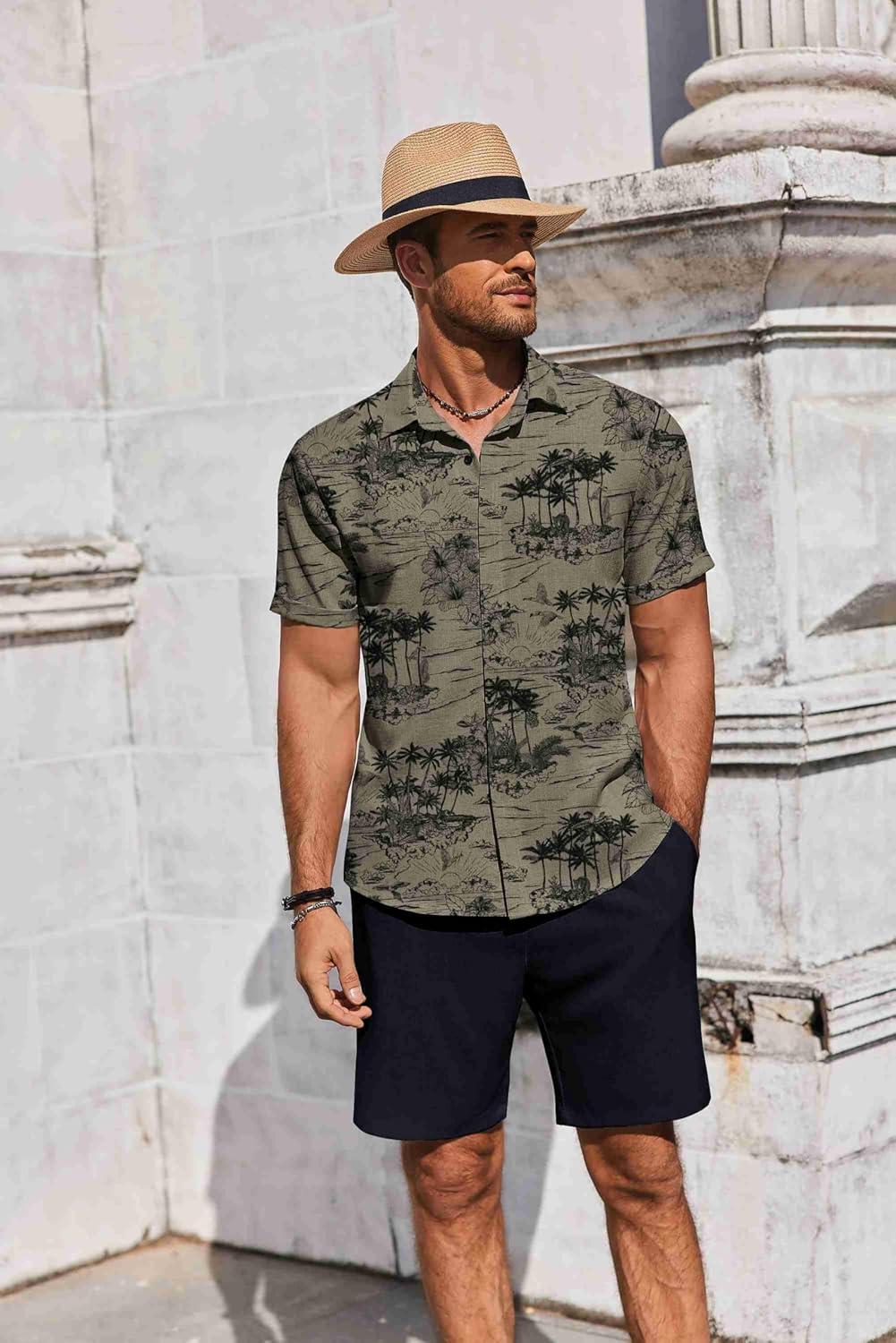 COOFANDY Men’s Summer Beach Outfits 2 Piece Short Sleeve Shirts and Shorts Vacation Texture Linen Sets for Men(Coconut Tree-green)