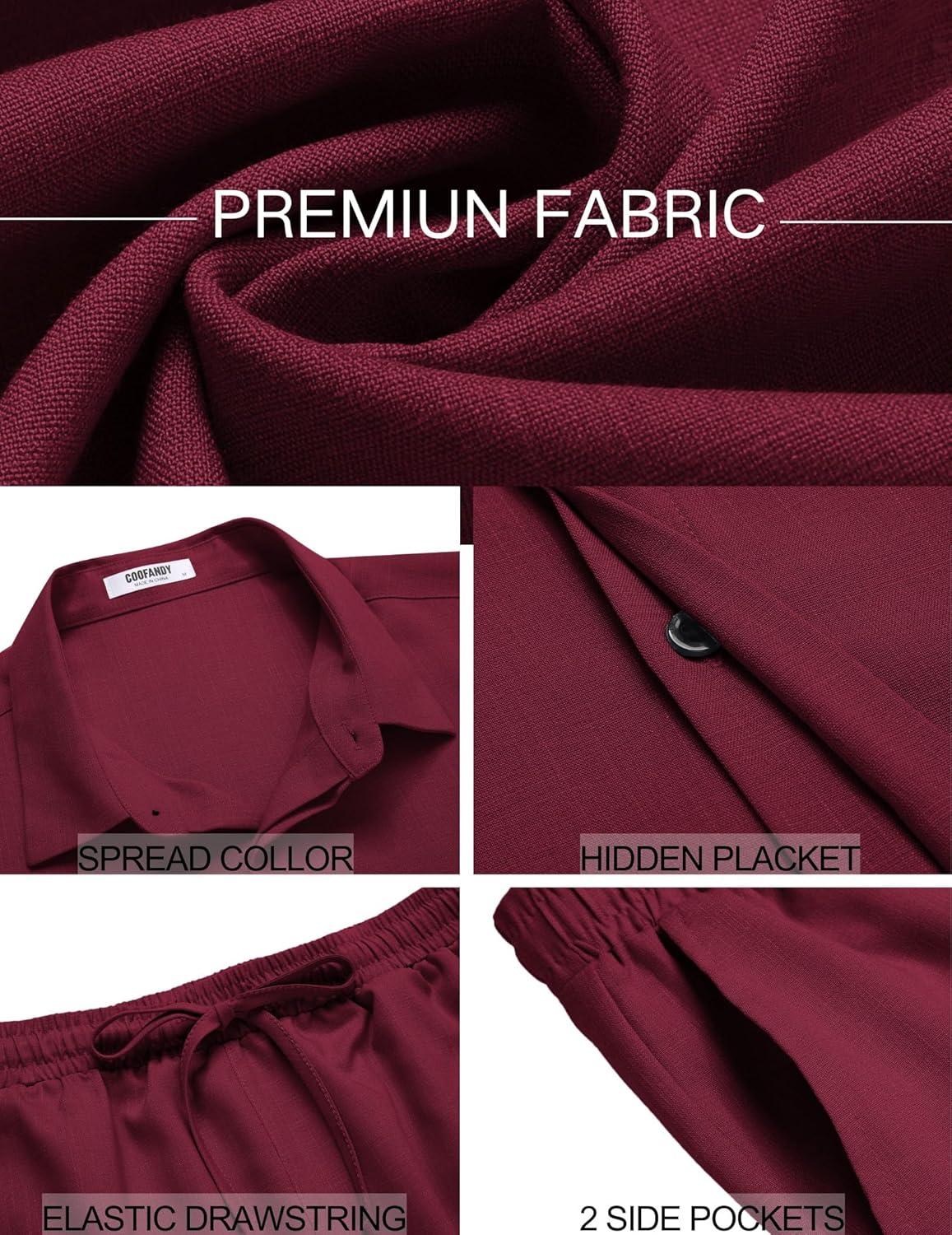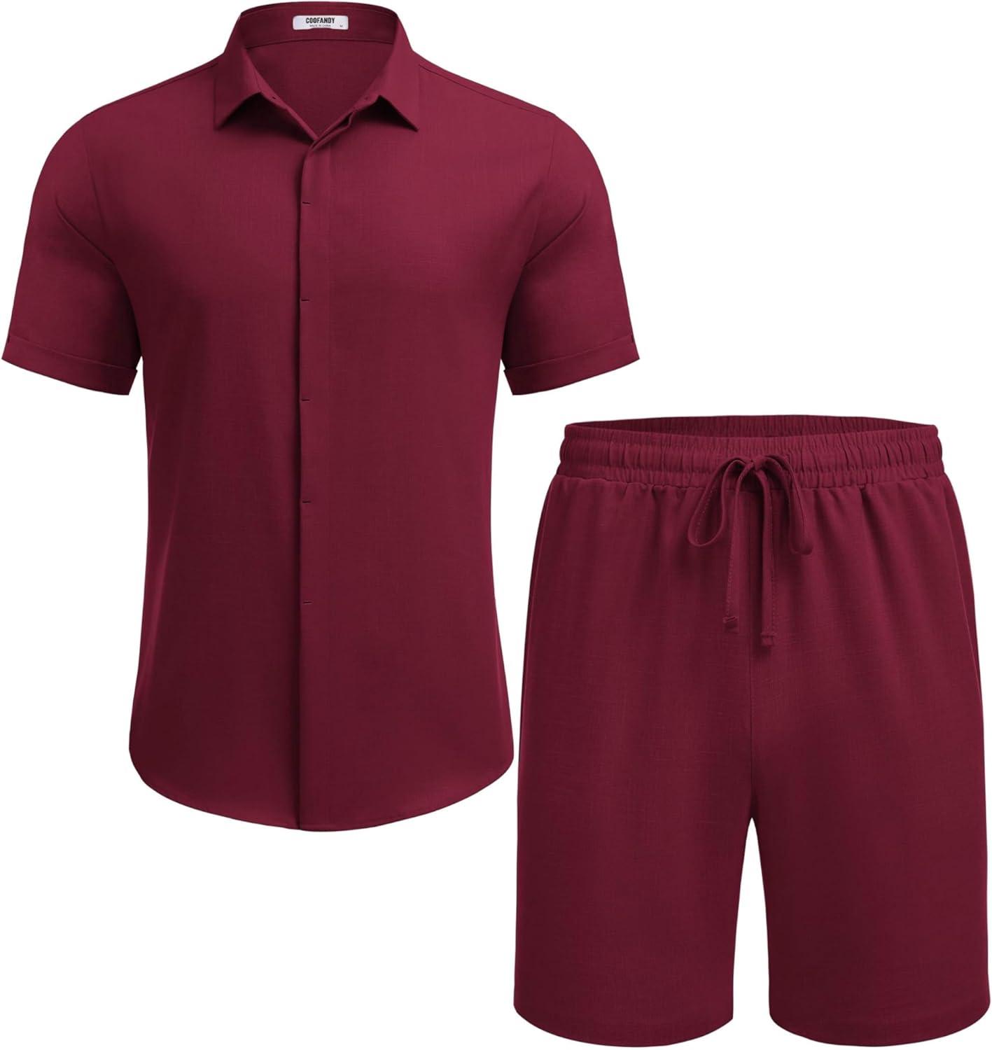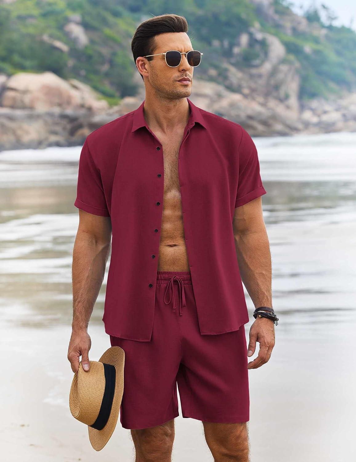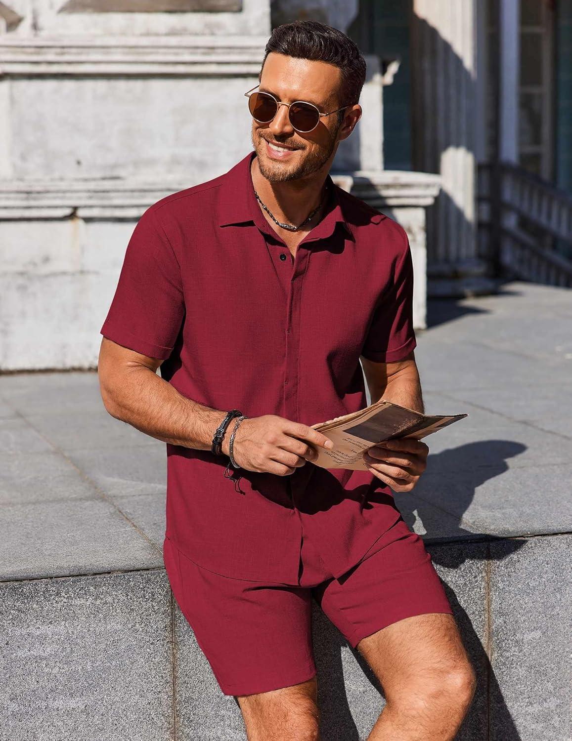 COOFANDY Men’s Summer Beach Outfits 2 Piece Short Sleeve Shirts and Shorts Vacation Texture Linen Sets for Men(Wine Red)