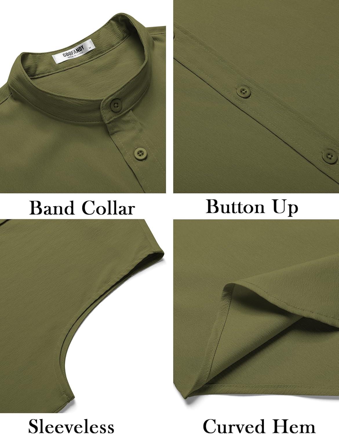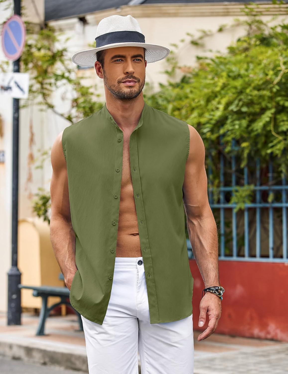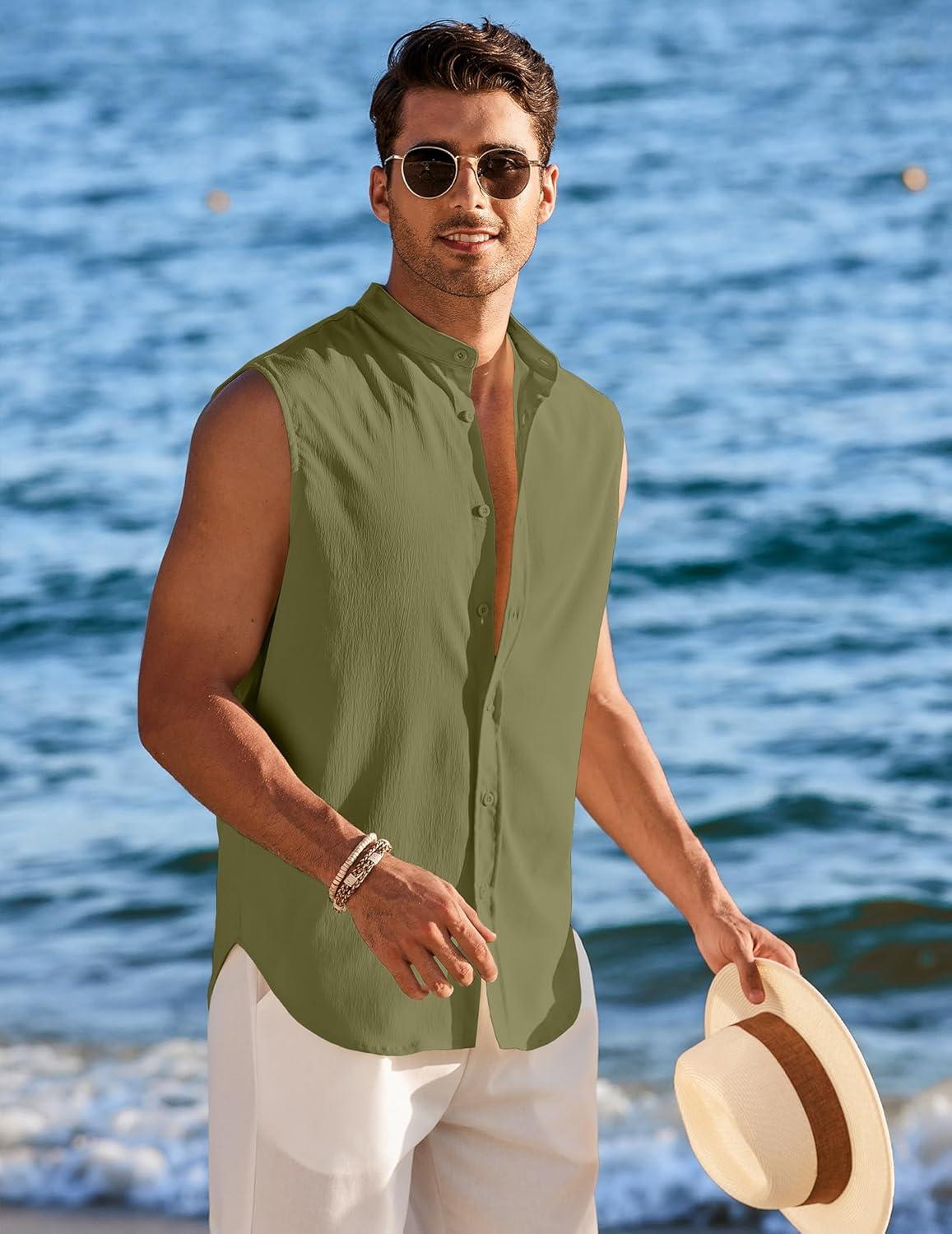 COOFANDY Men's Summer Beach Tank Tops Sleeveless Button Up Shirt Casual Textured Tank Shirts(Army Green)