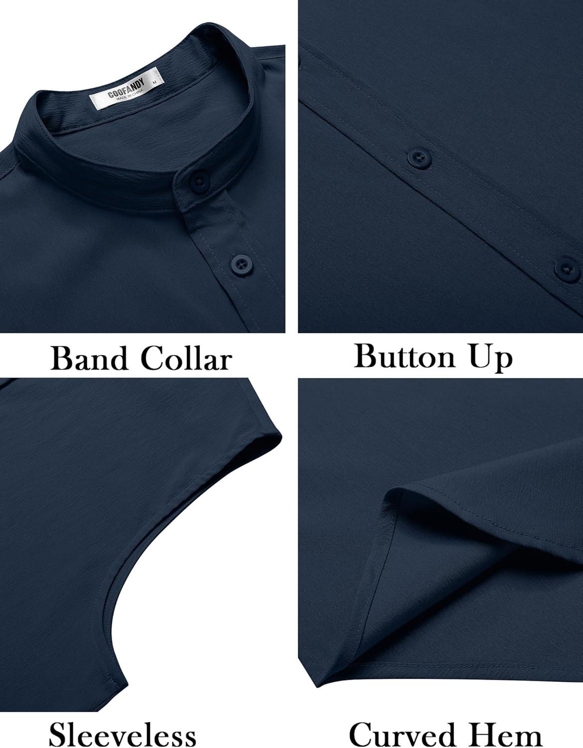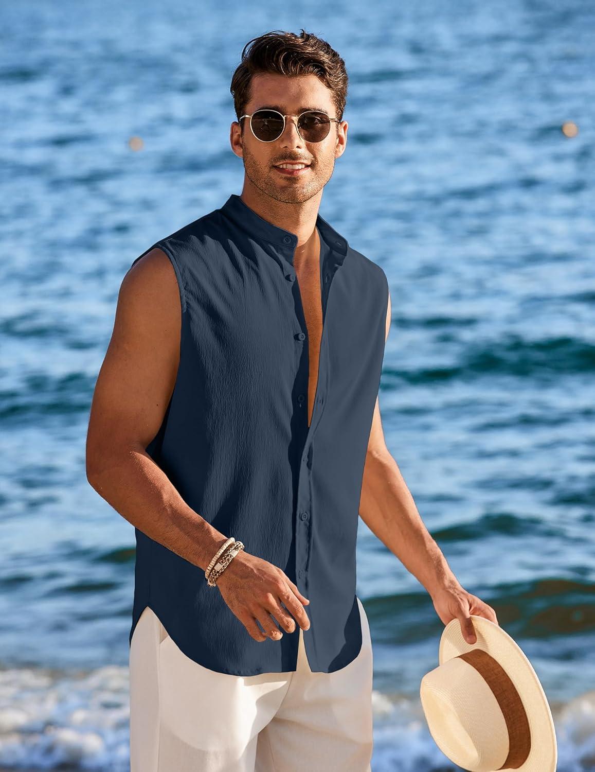 COOFANDY Men's Summer Beach Tank Tops Sleeveless Button Up Shirt Casual Textured Tank Shirts(Deep Blue)
