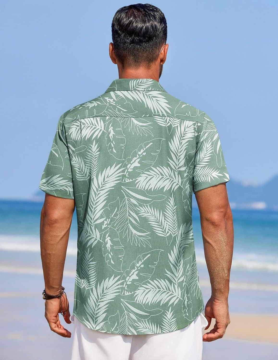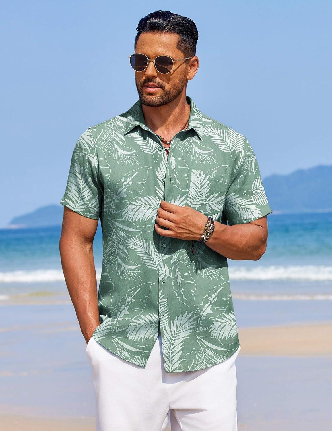 COOFANDY Men's Summer Beach Vacation Shirt Casual Button Down Short Sleeve Shirt Hawaiian Tropical Resort Wear(Silhouette Leaves-light Green)