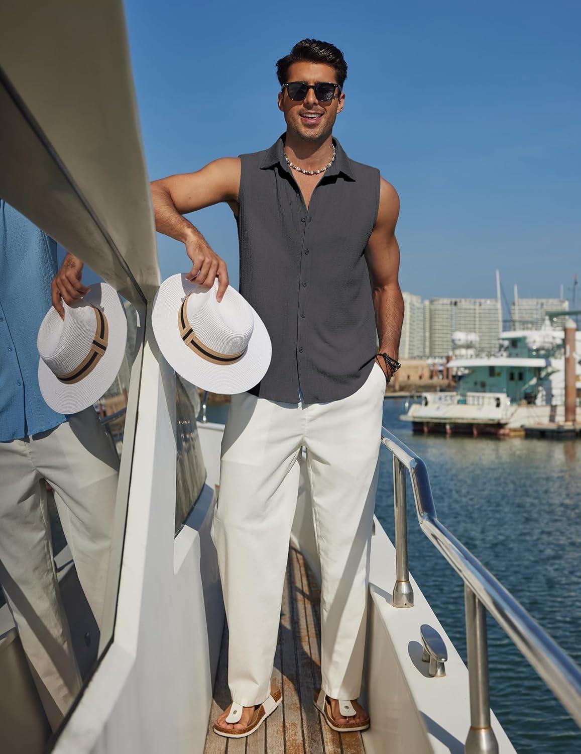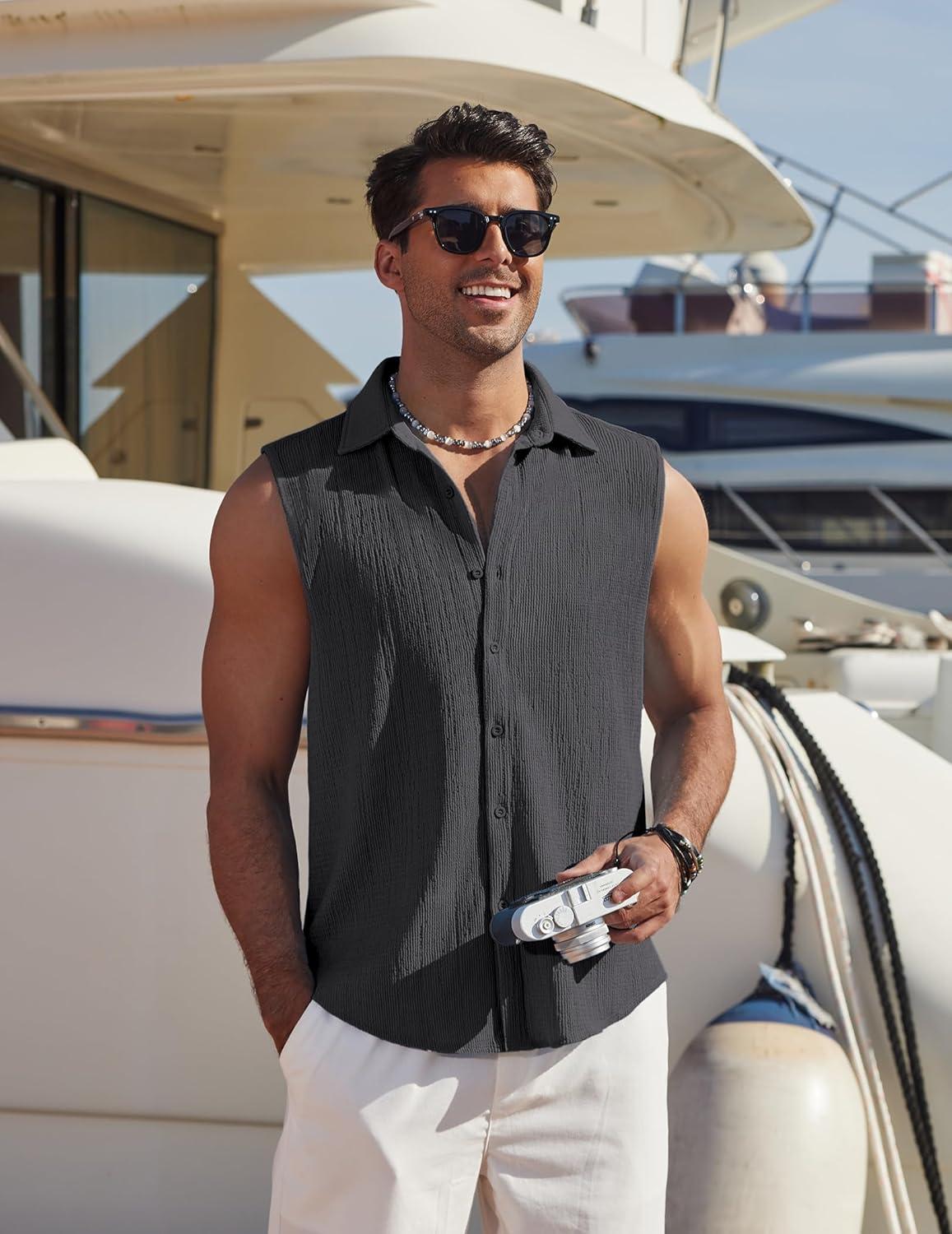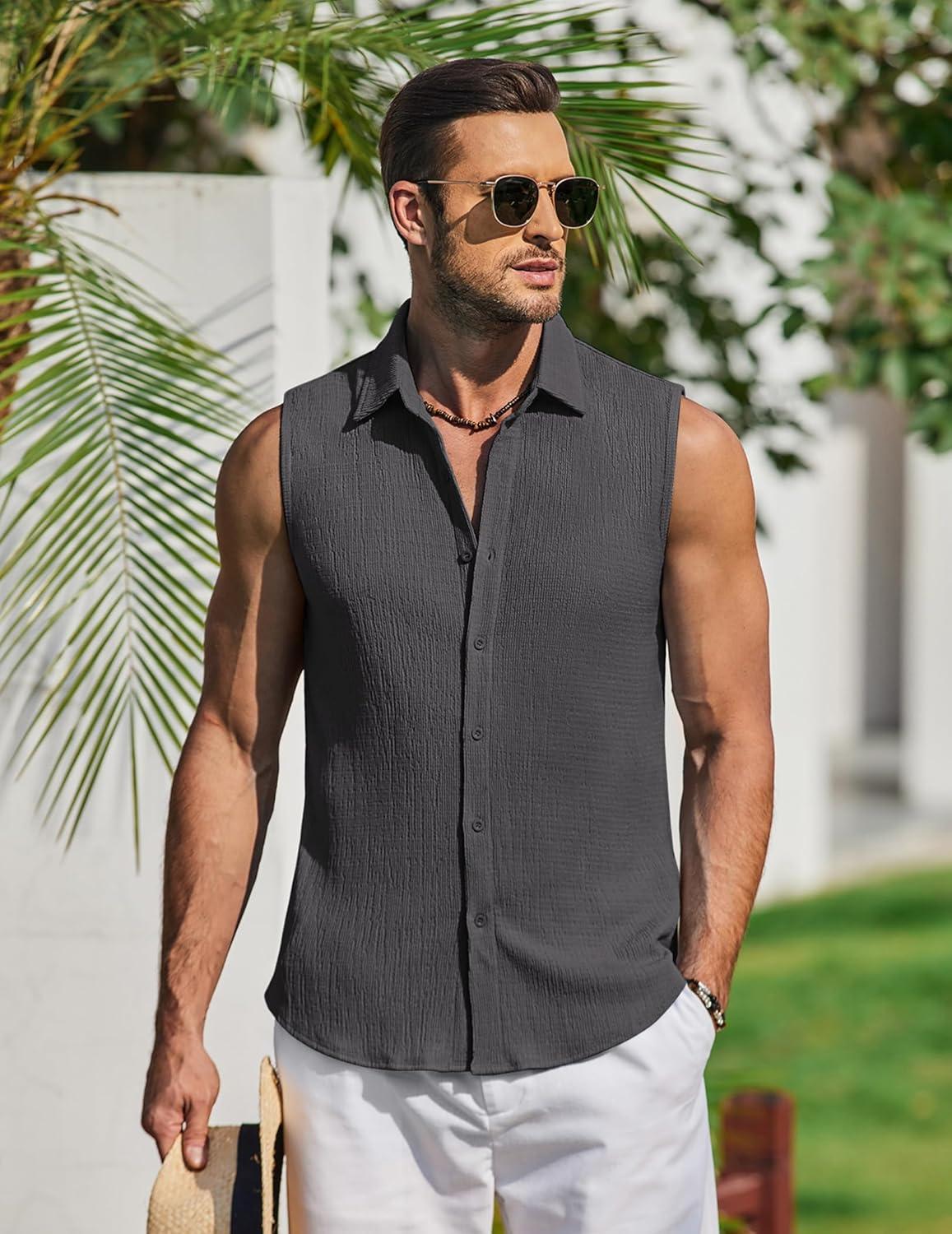 COOFANDY Men's Summer Sleeveless Shirts Beach Knit Tank Top Button Up Casual Tank Shirt Vacation Tops(Dark Gray)