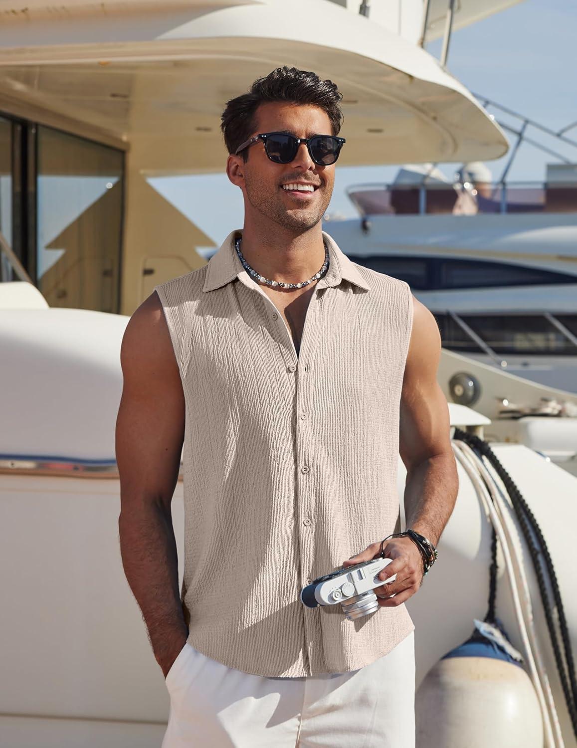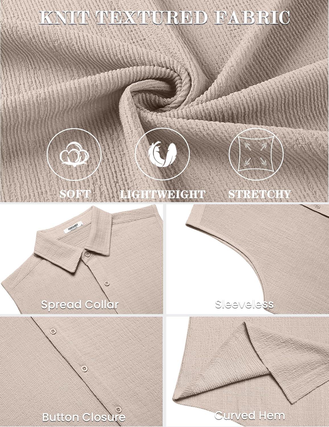 COOFANDY Men’s Summer Sleeveless Shirts Beach Knit Tank Top Button Up Casual Tank Shirt Vacation Tops(Khaki)