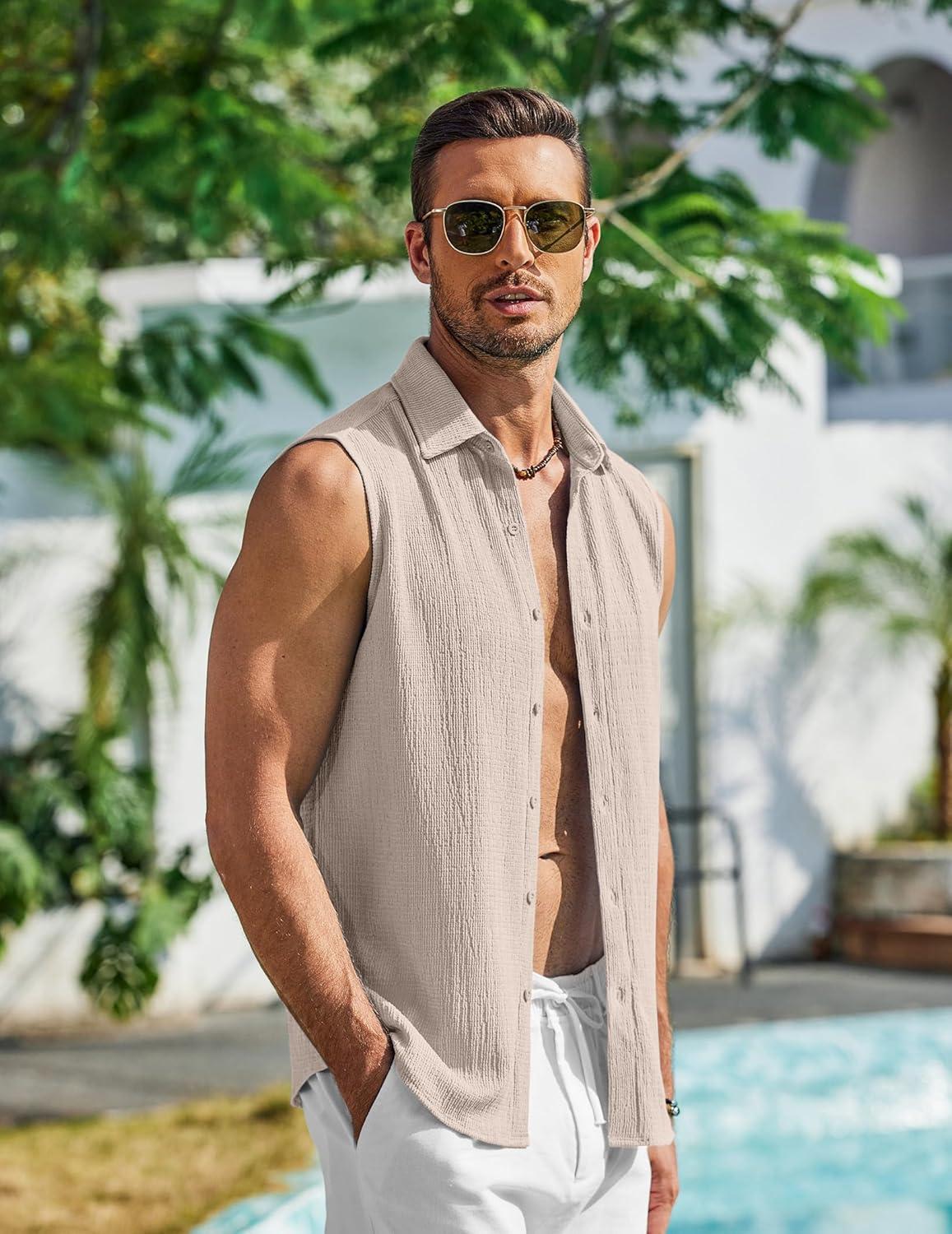 COOFANDY Men's Summer Sleeveless Shirts Beach Knit Tank Top Button Up Casual Tank Shirt Vacation Tops(Khaki)