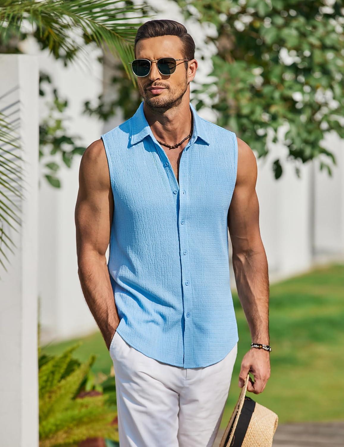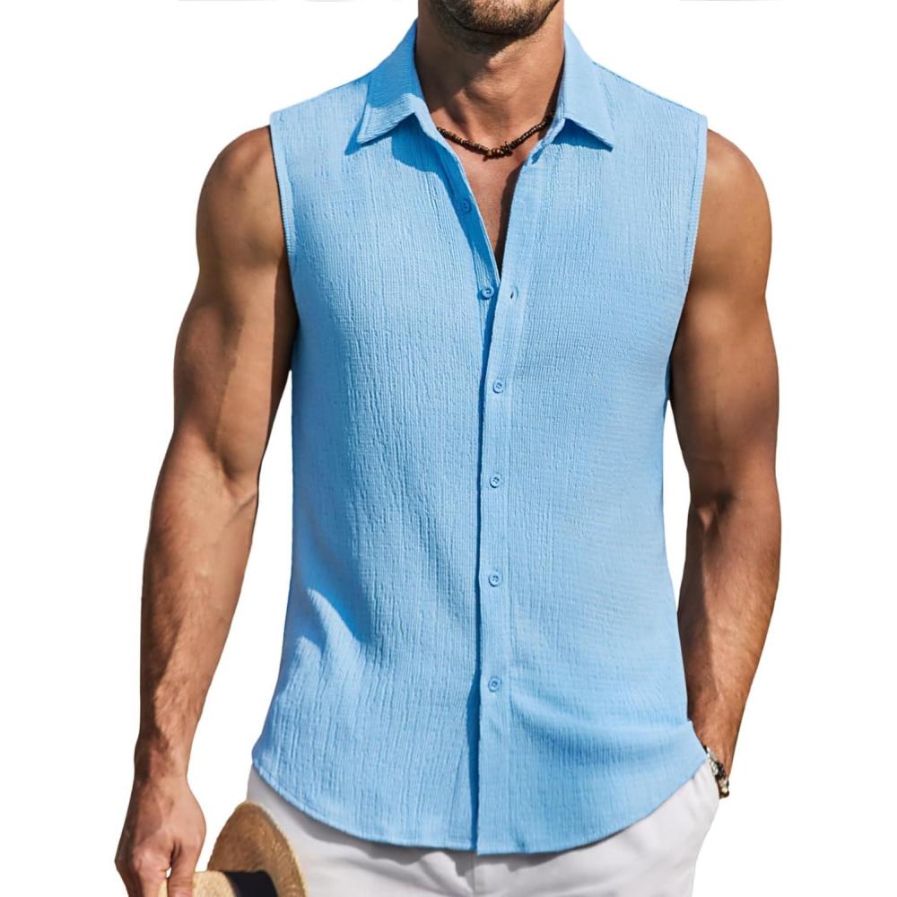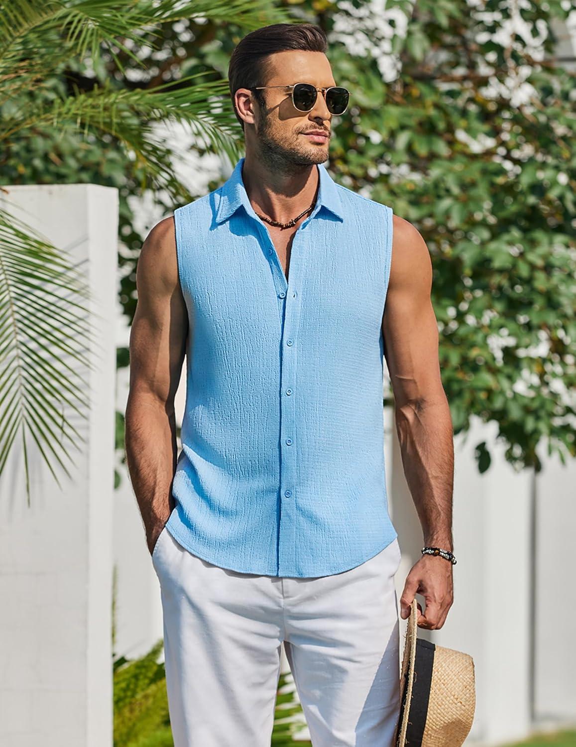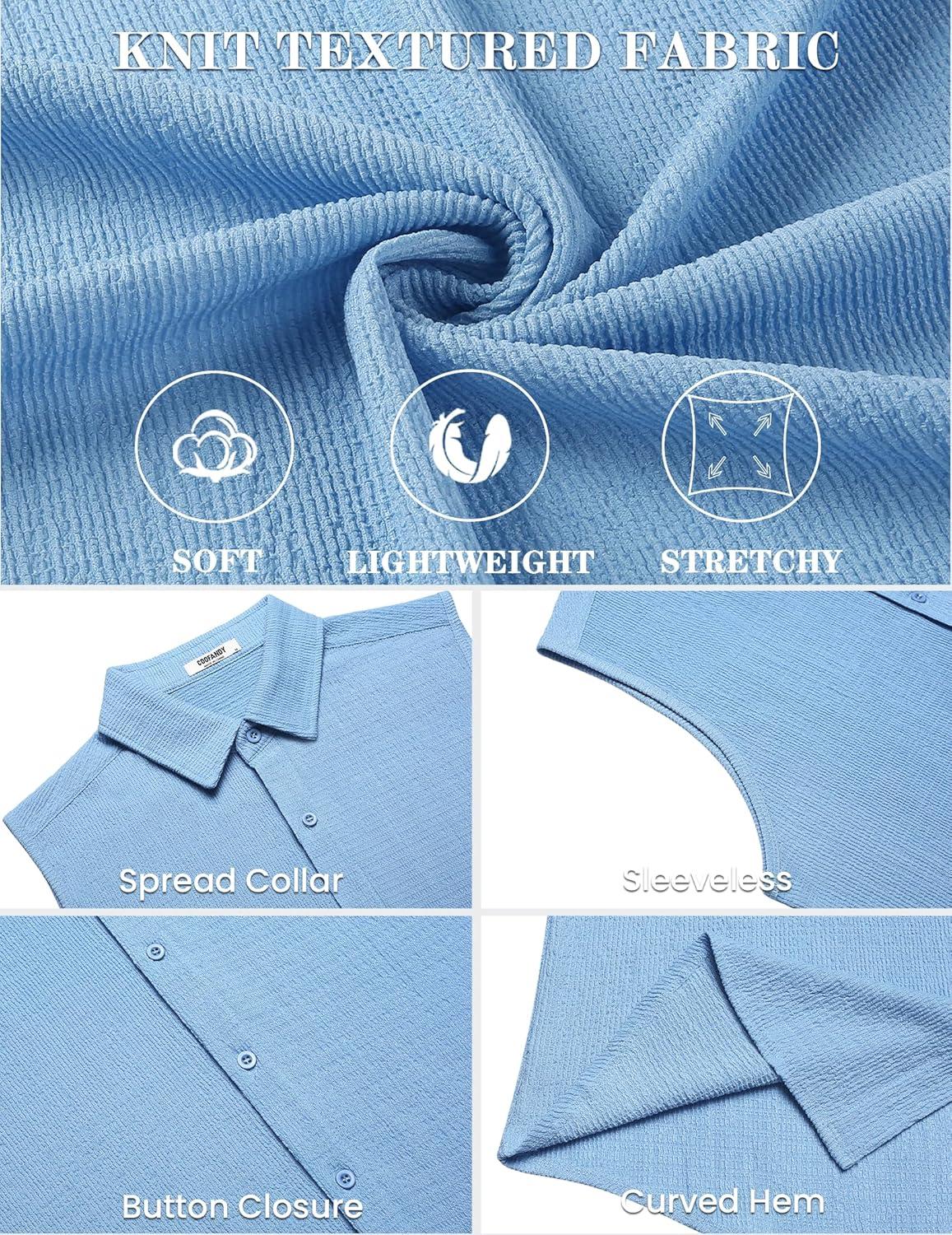 COOFANDY Men’s Summer Sleeveless Shirts Beach Knit Tank Top Button Up Casual Tank Shirt Vacation Tops(Light Blue)
