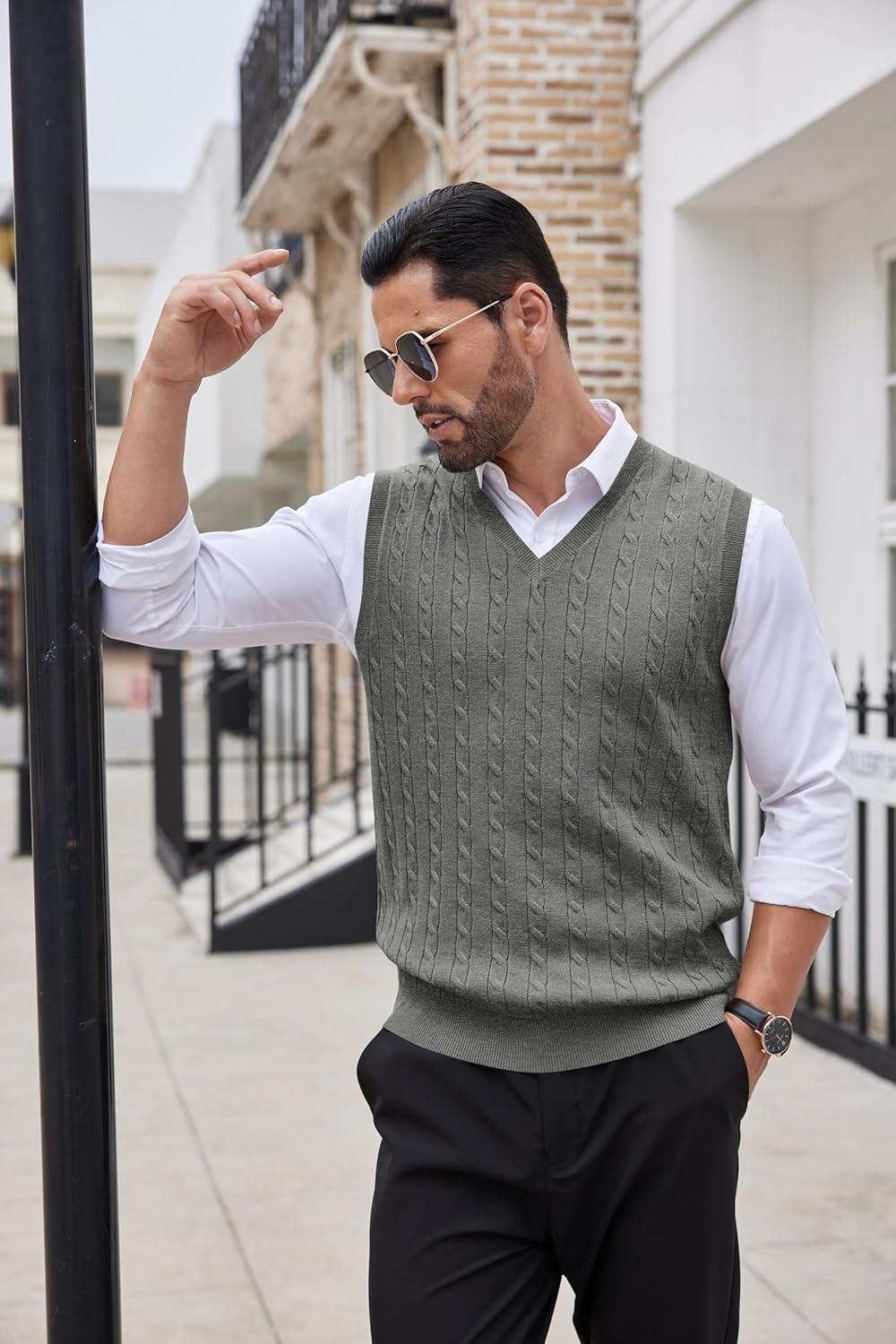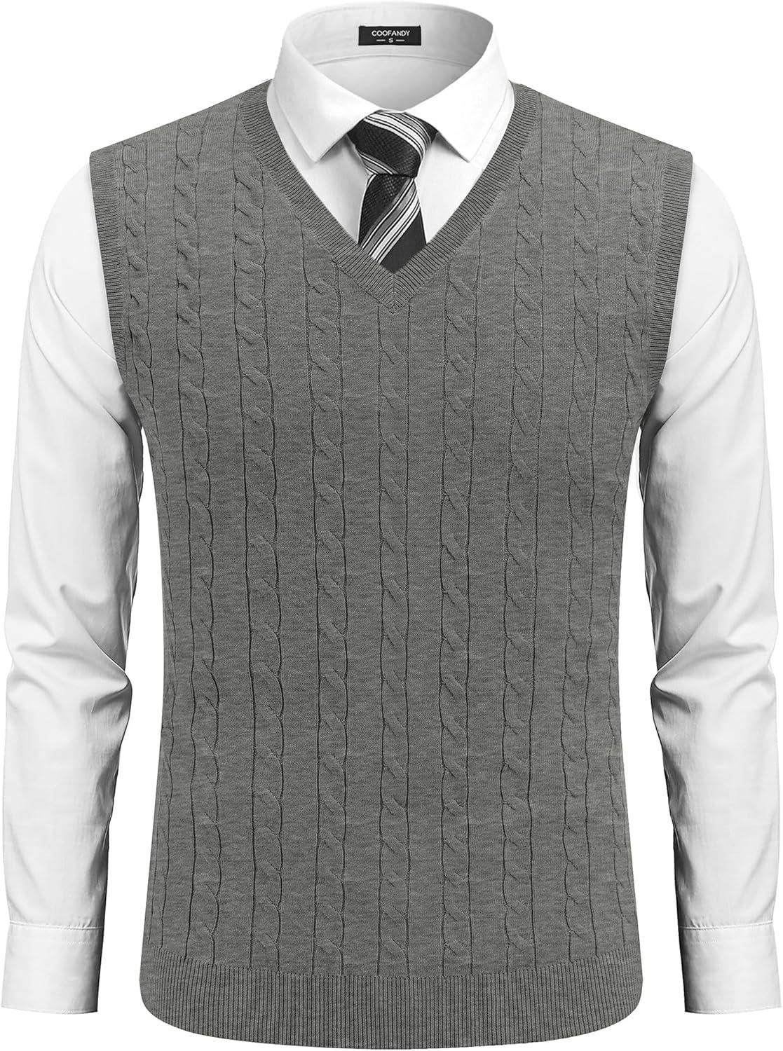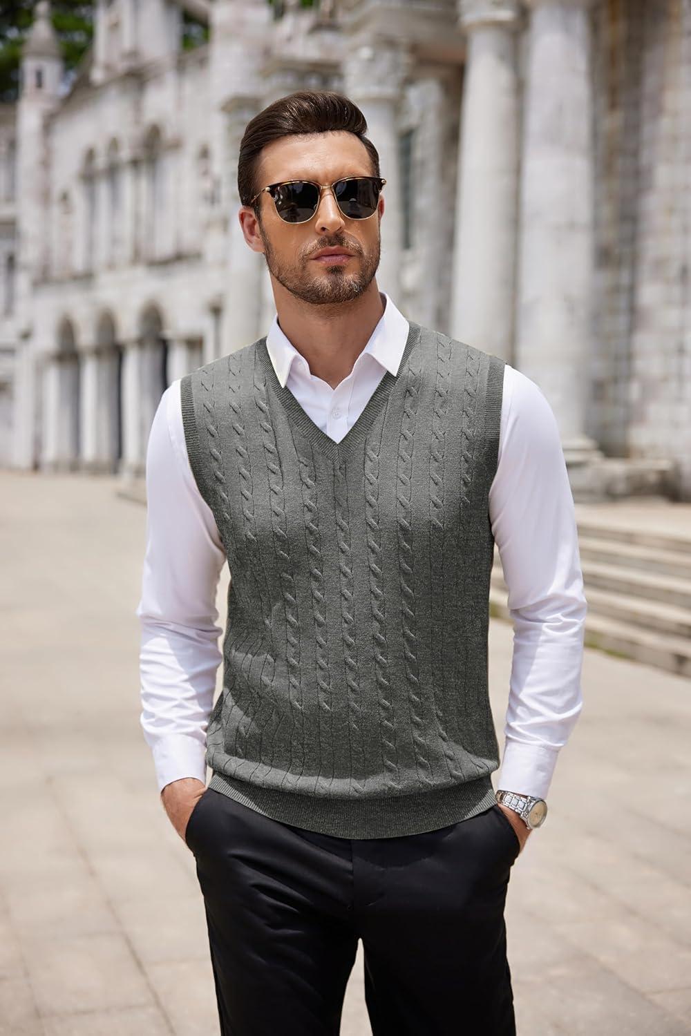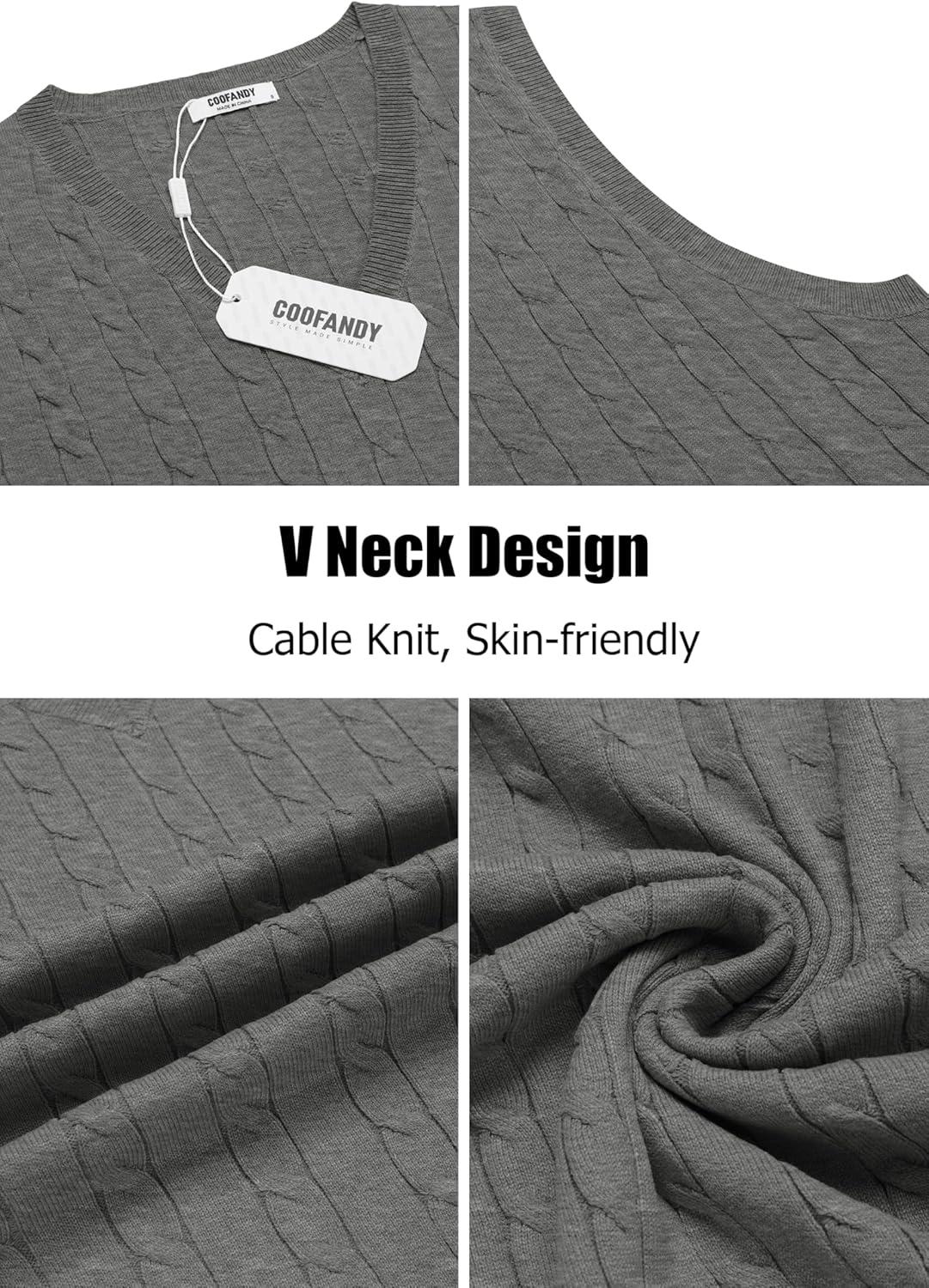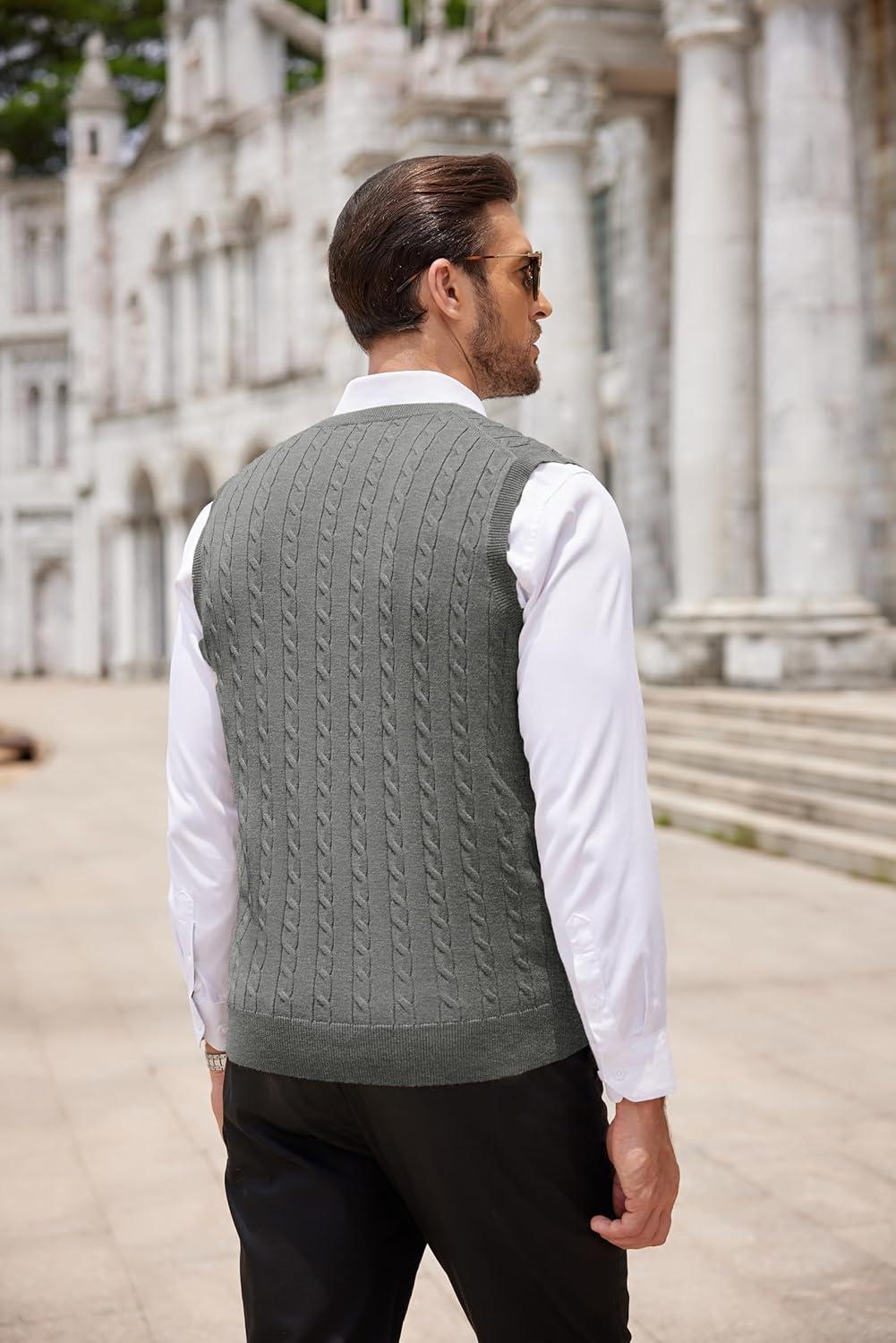 COOFANDY Men's Sweater Vest Cable Knitted V Neck Slim Fit Sleeveless Pullover Sweater(Grey)