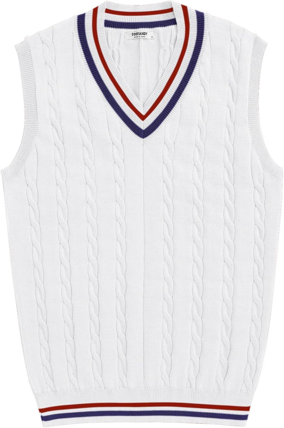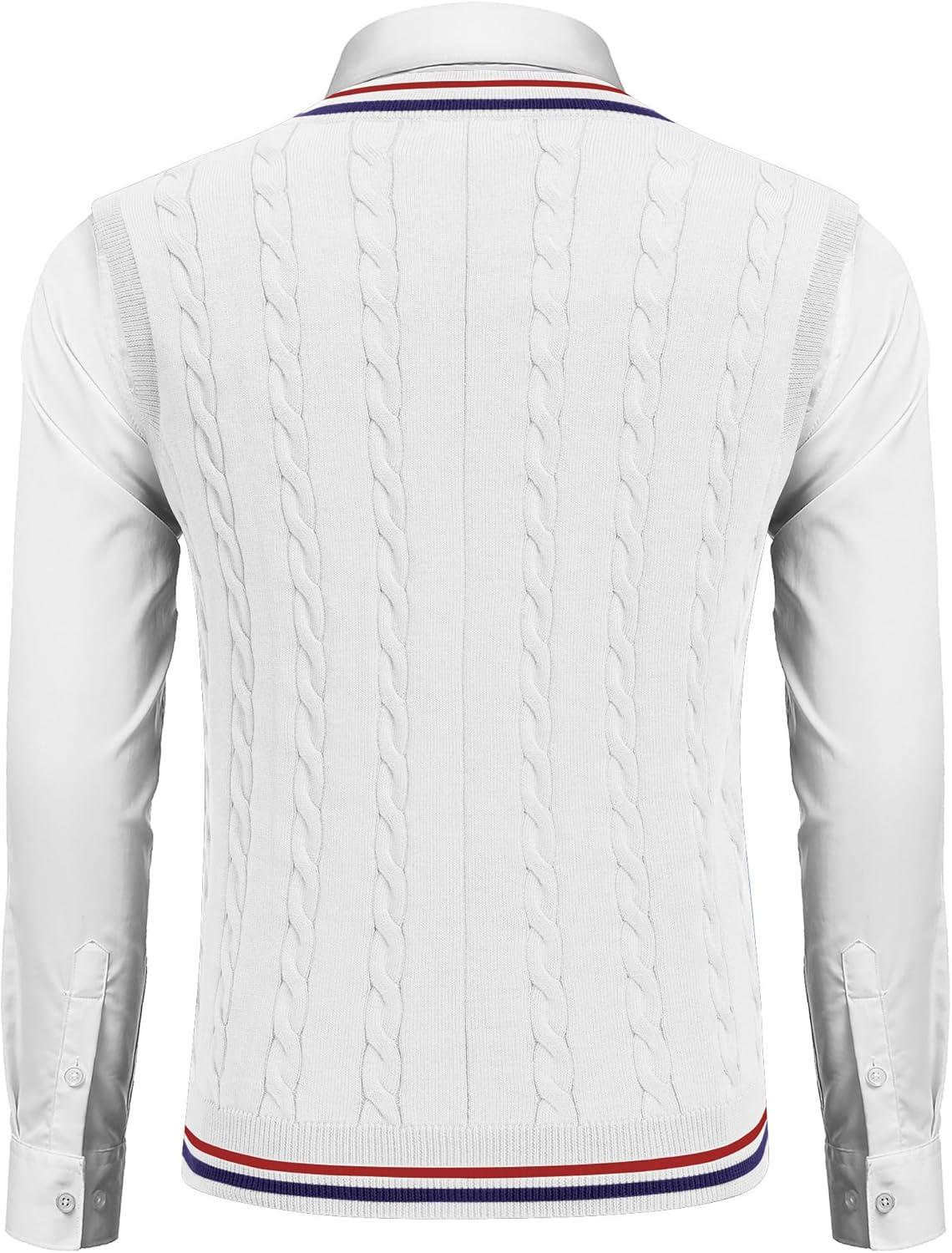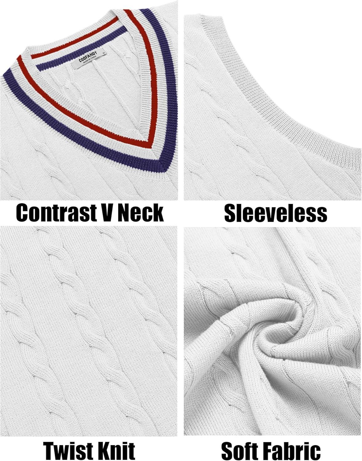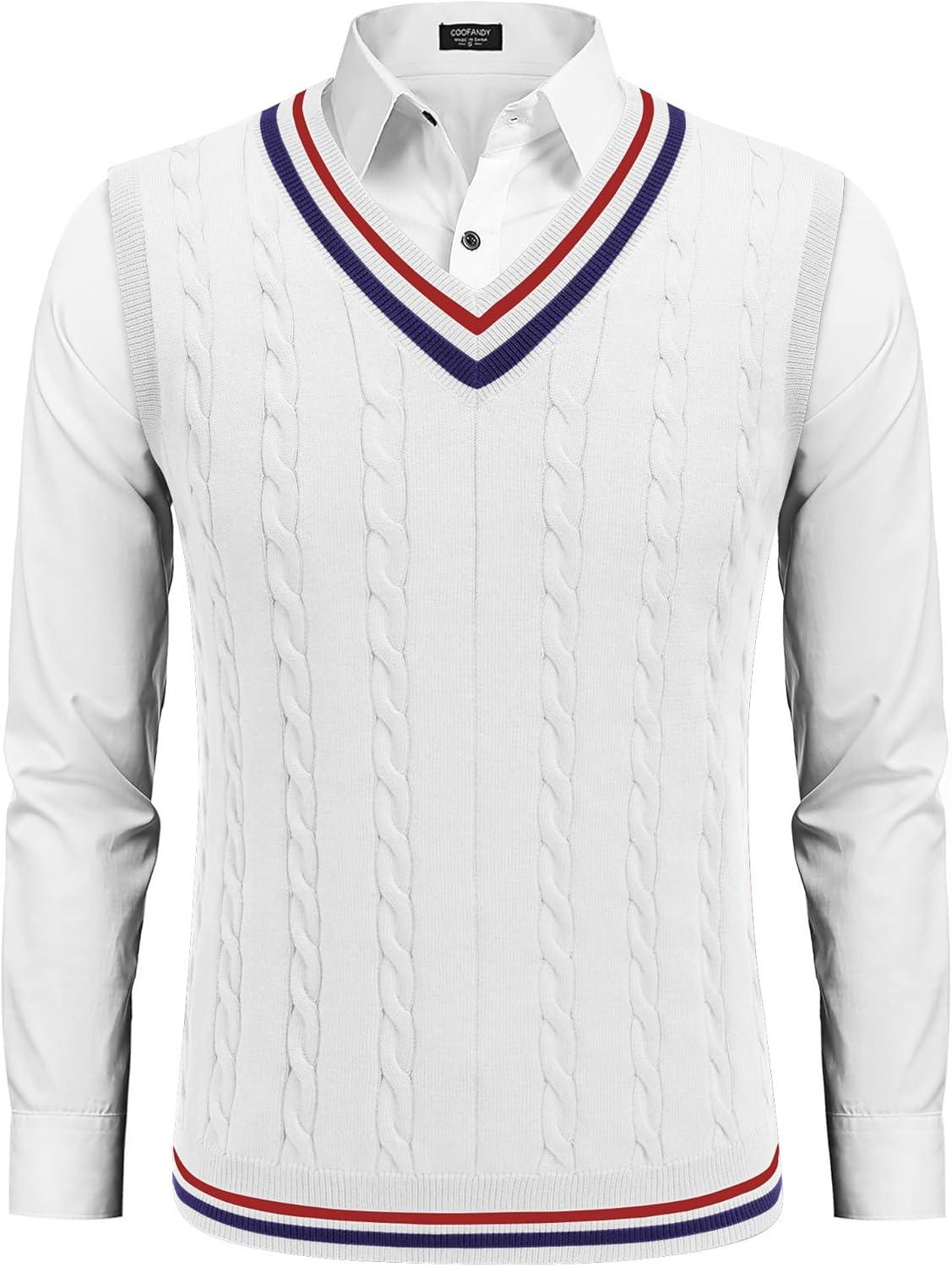 COOFANDY Men's Sweater Vest V Neck Casual Sleeveless Pullover Striped Cable Knit Sweater Vest(All White)
