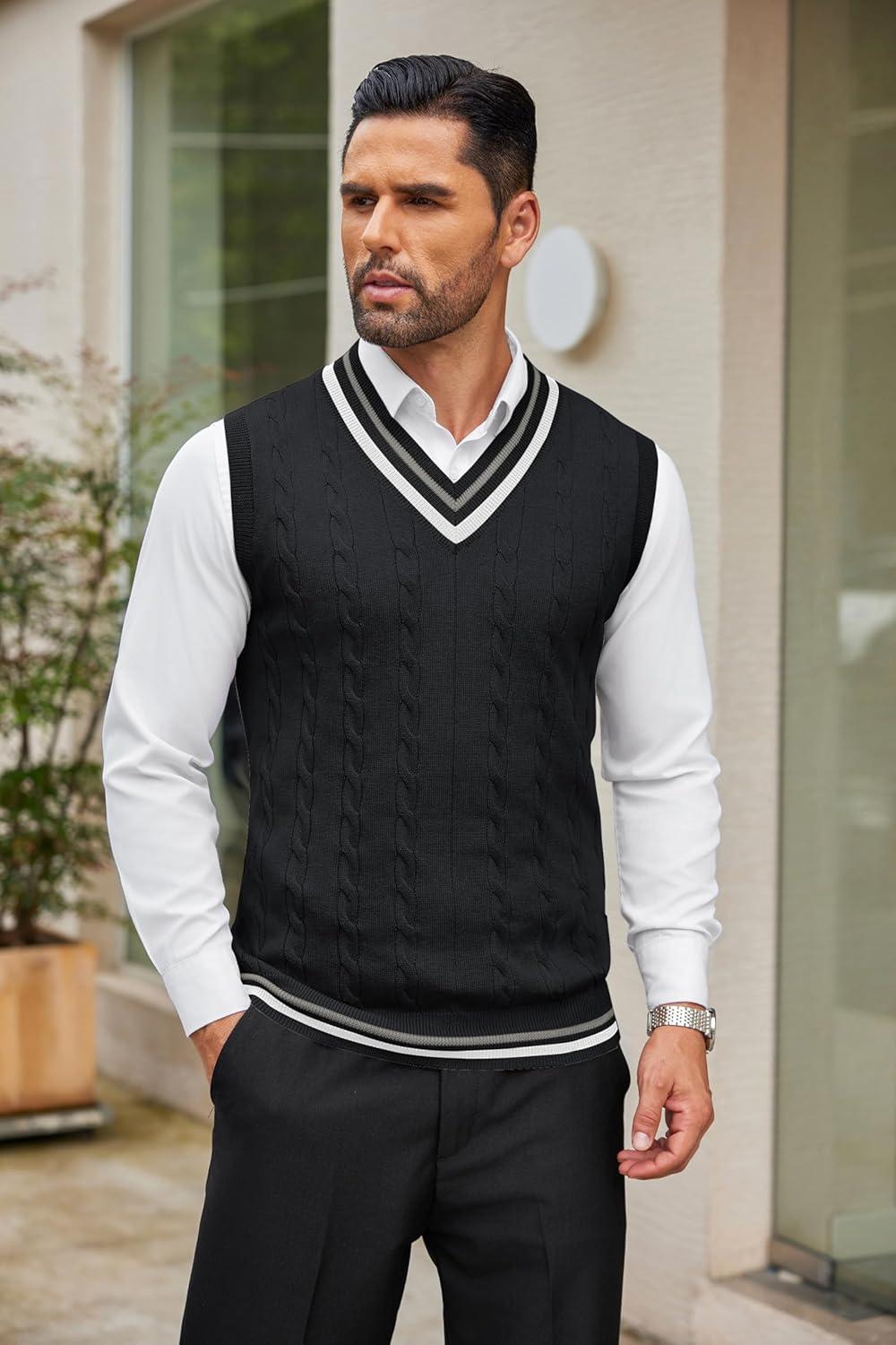 COOFANDY Men’s Sweater Vest V Neck Casual Sleeveless Pullover Striped Cable Knit Sweater Vest(Black)