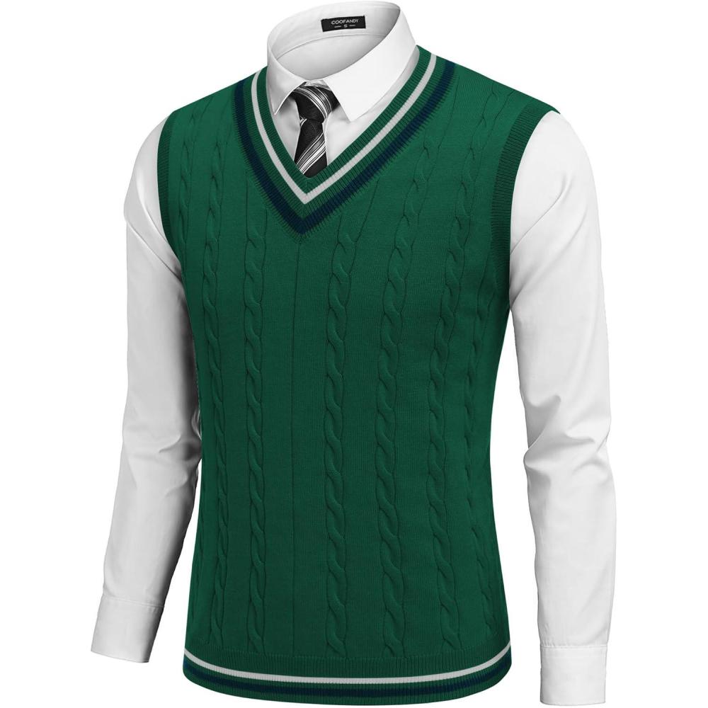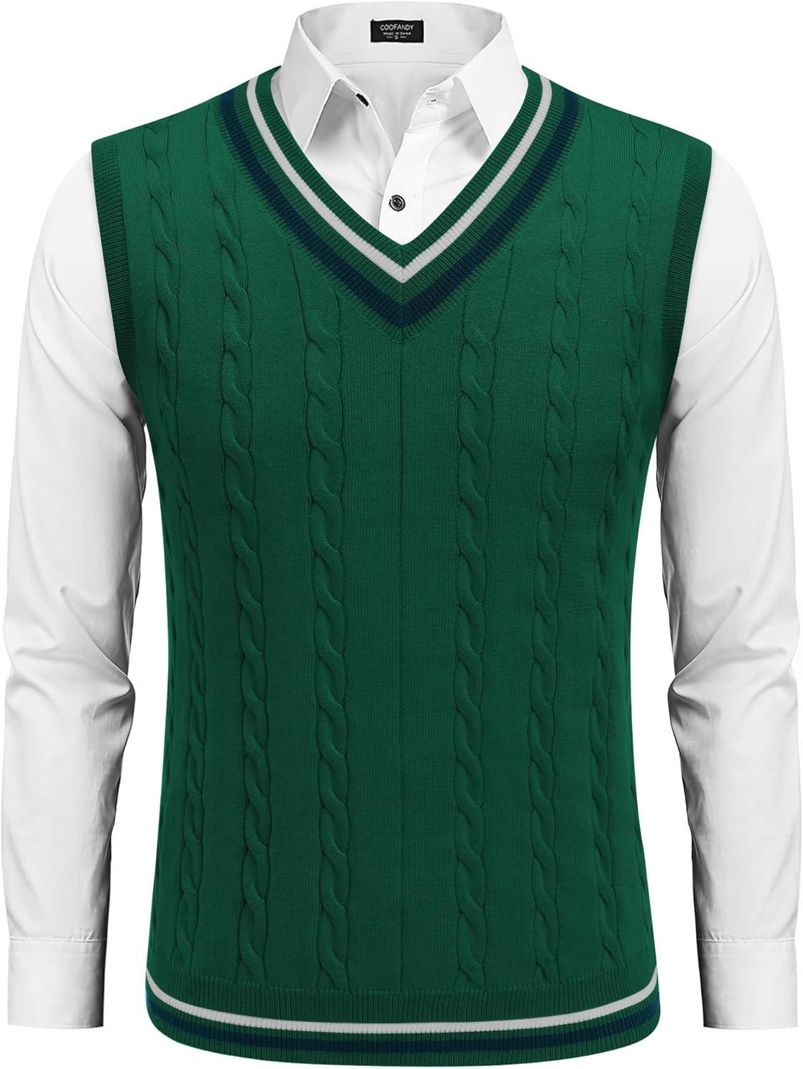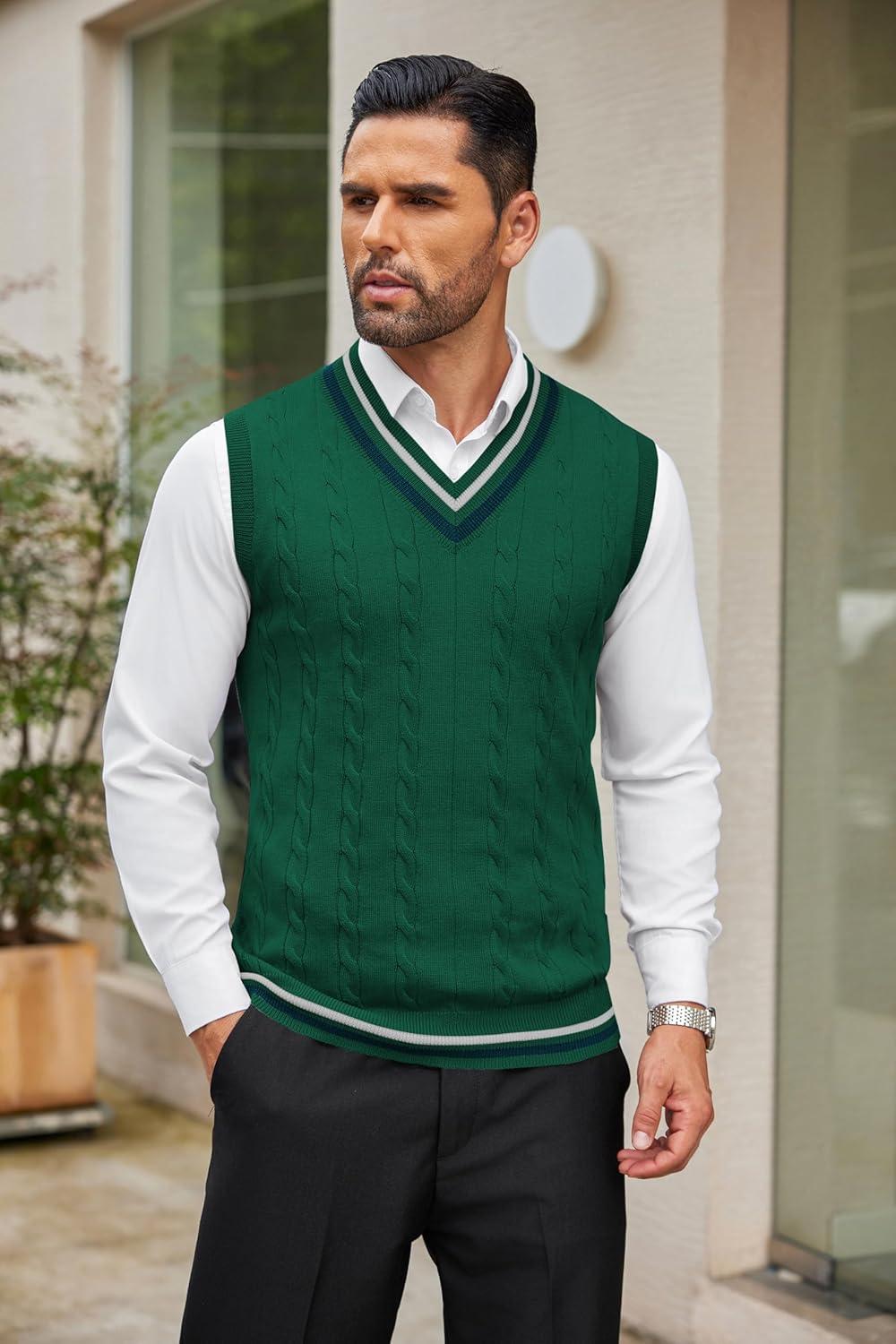 COOFANDY Men's Sweater Vest V Neck Casual Sleeveless Pullover Striped Cable Knit Sweater Vest(Green)