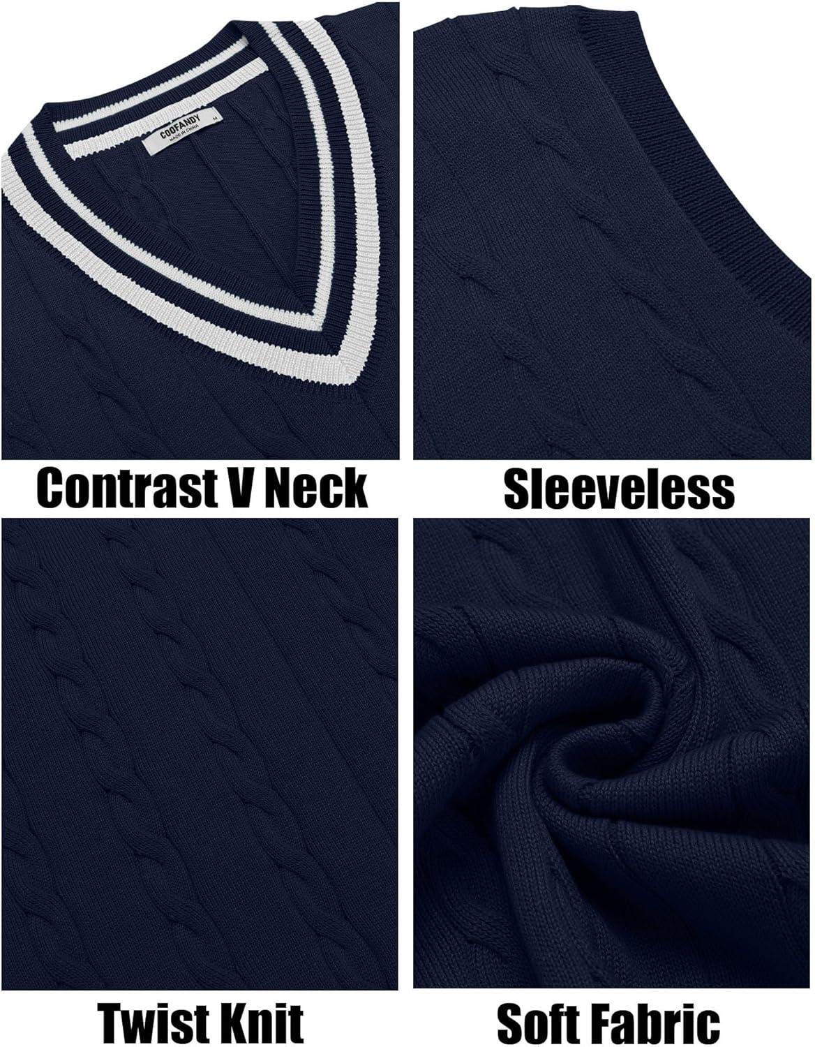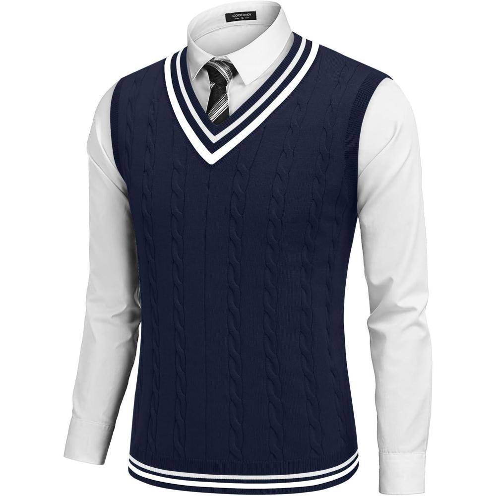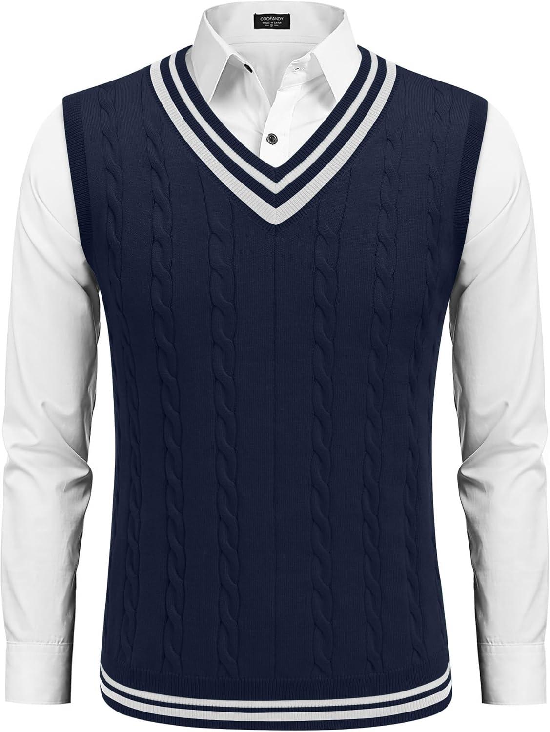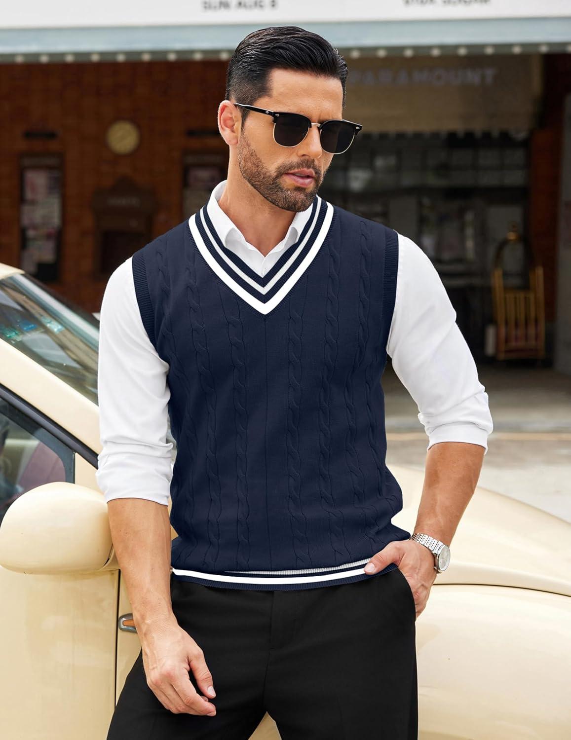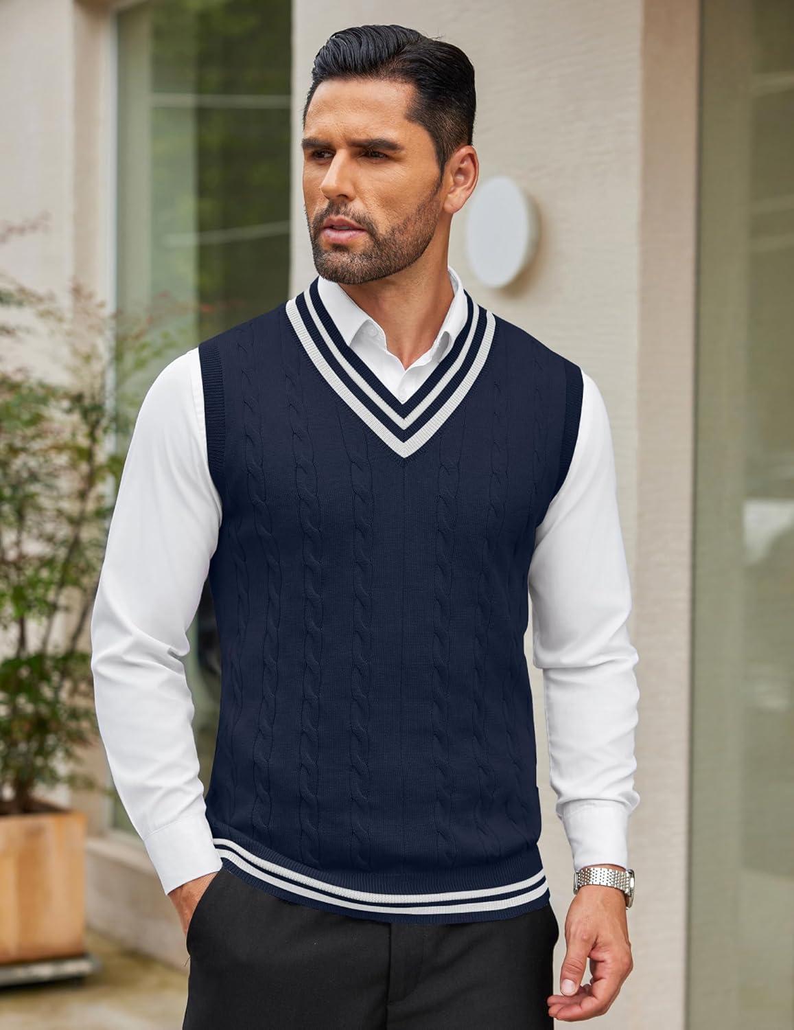 COOFANDY Men’s Sweater Vest V Neck Casual Sleeveless Pullover Striped Cable Knit Sweater Vest(Navy Blue)