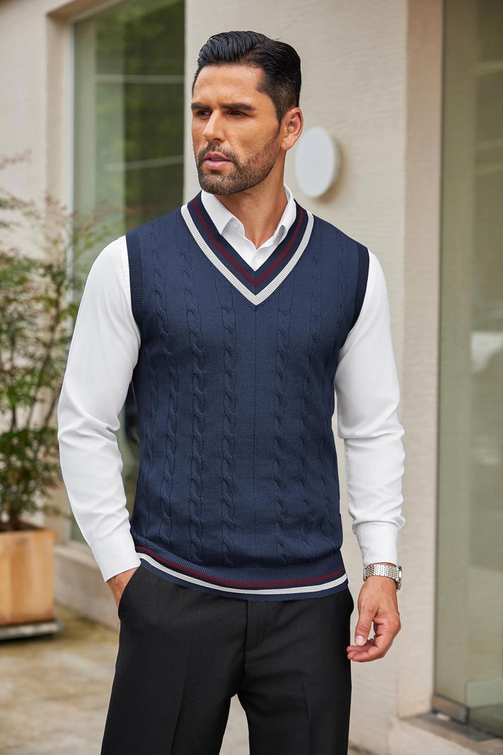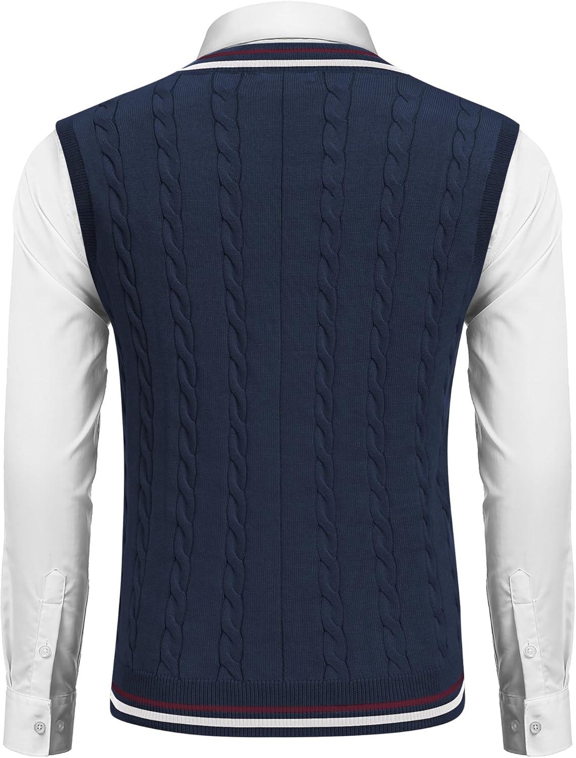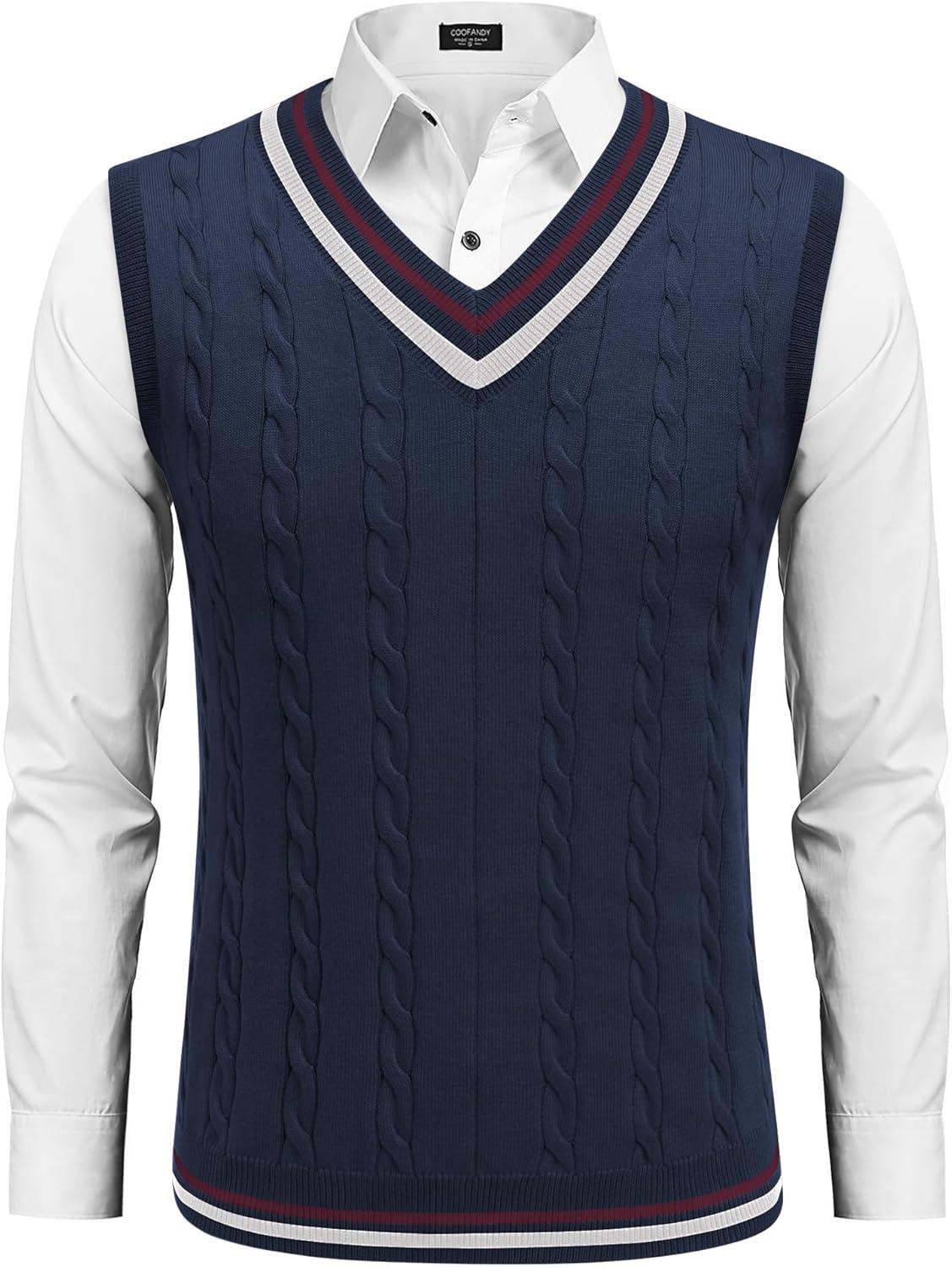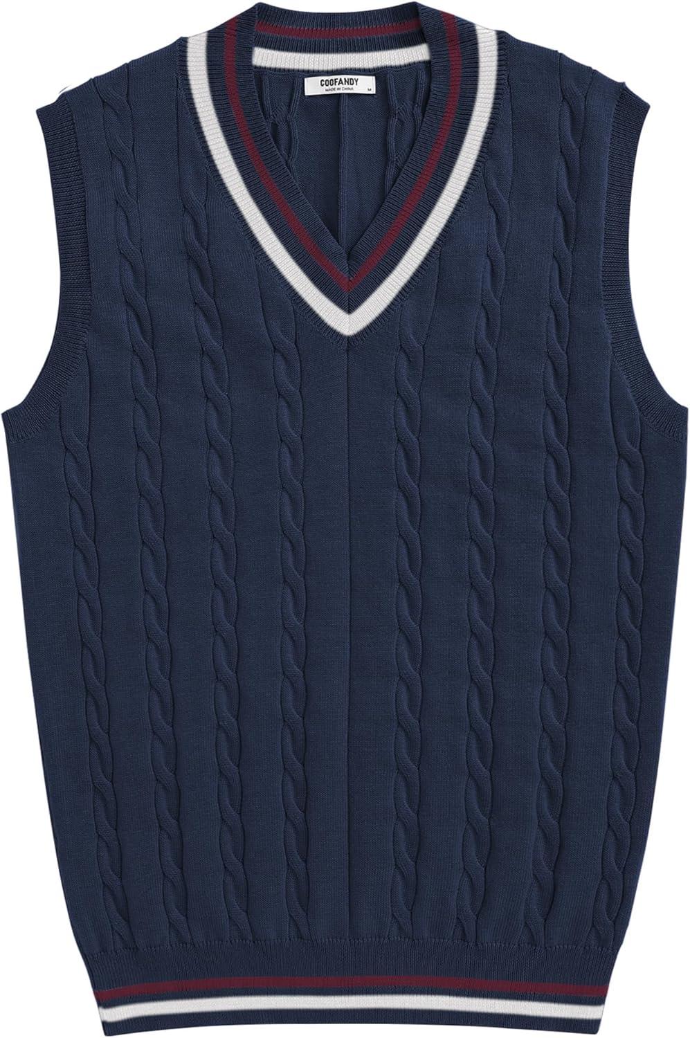 COOFANDY Men’s Sweater Vest V Neck Casual Sleeveless Pullover Striped Cable Knit Sweater Vest(White & Navy Blue Red Stripe)