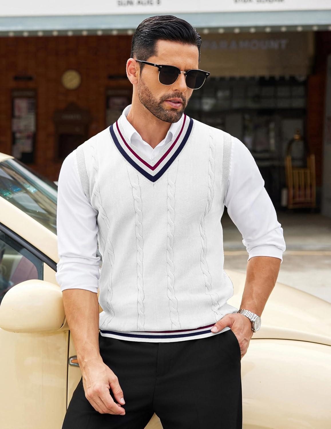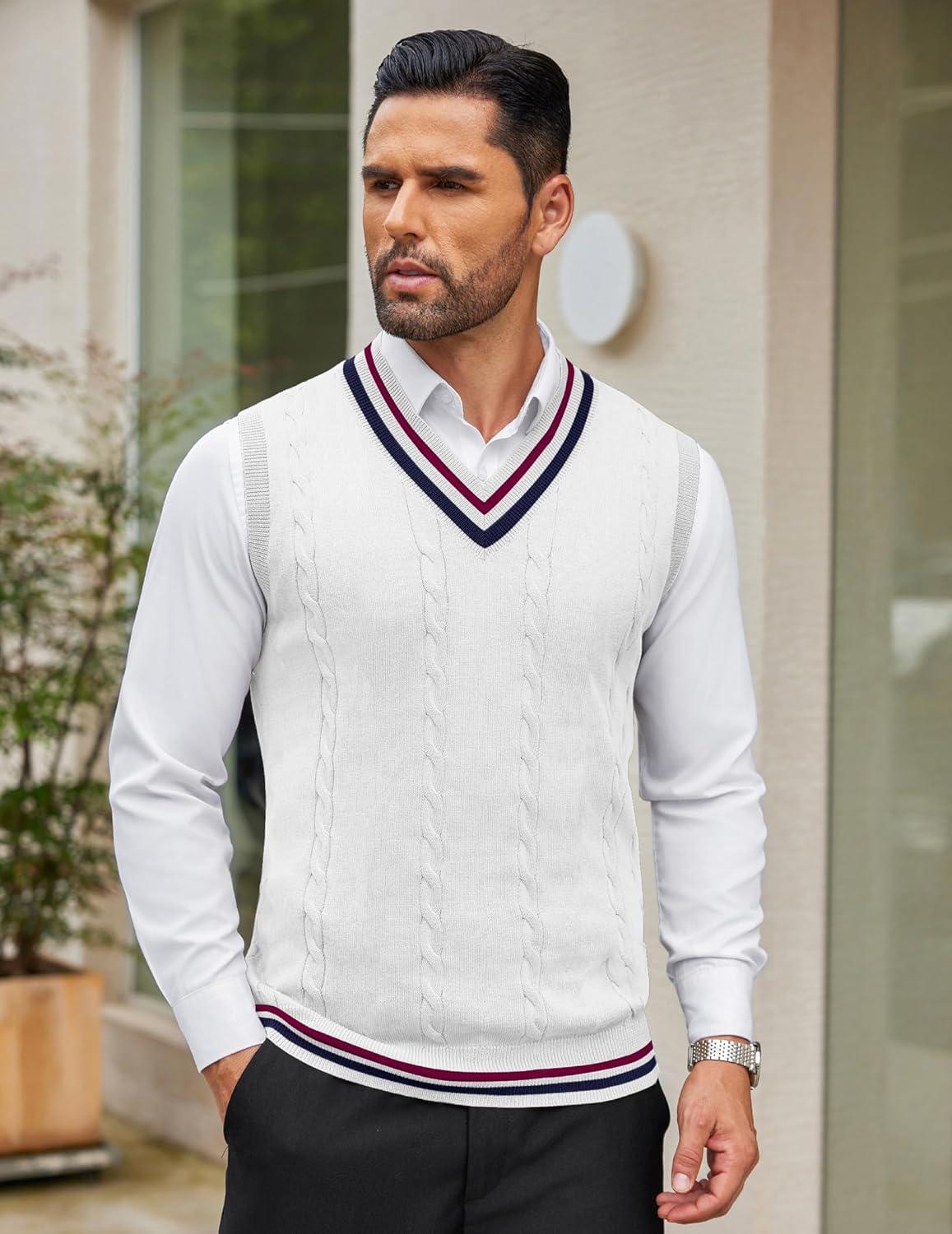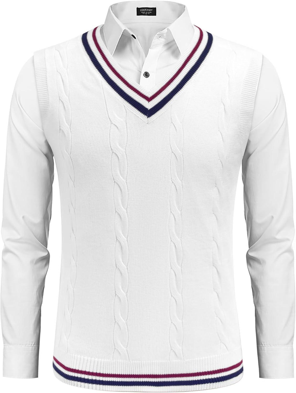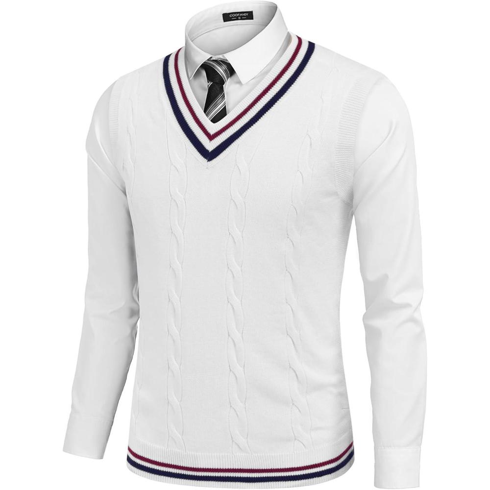 Get up to 70% off on COOFANDY Men’s Sweater Vest V Neck Casual Sleeveless Pullover Striped Cable Knit Sweater Vest(White & Navy Blue Red Stripe) styles during our end-of-season clearance event.