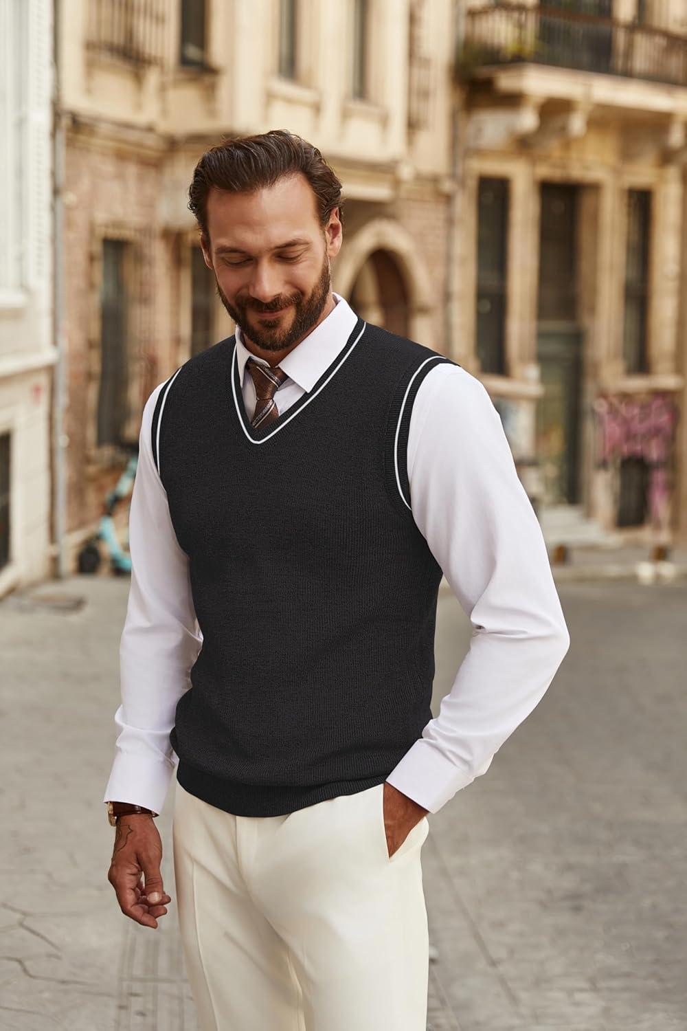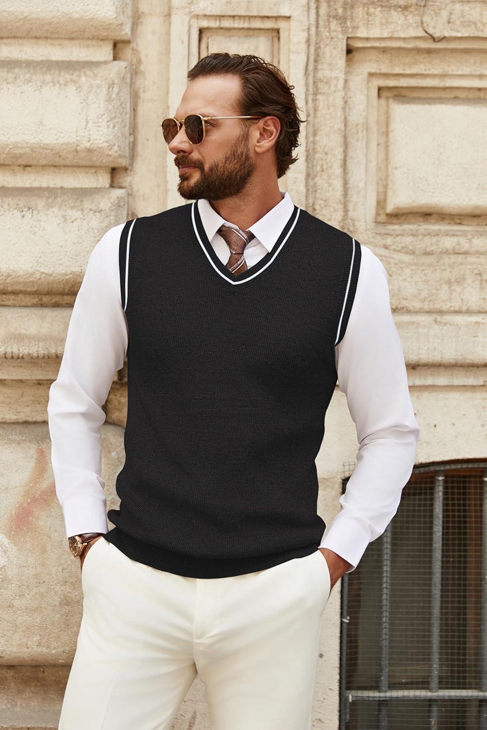 COOFANDY Men's Sweater Vest V Neck Sleeveless Sweater Slim Fit Casual Knitted Pullover Sweater(Black and White Stripe)