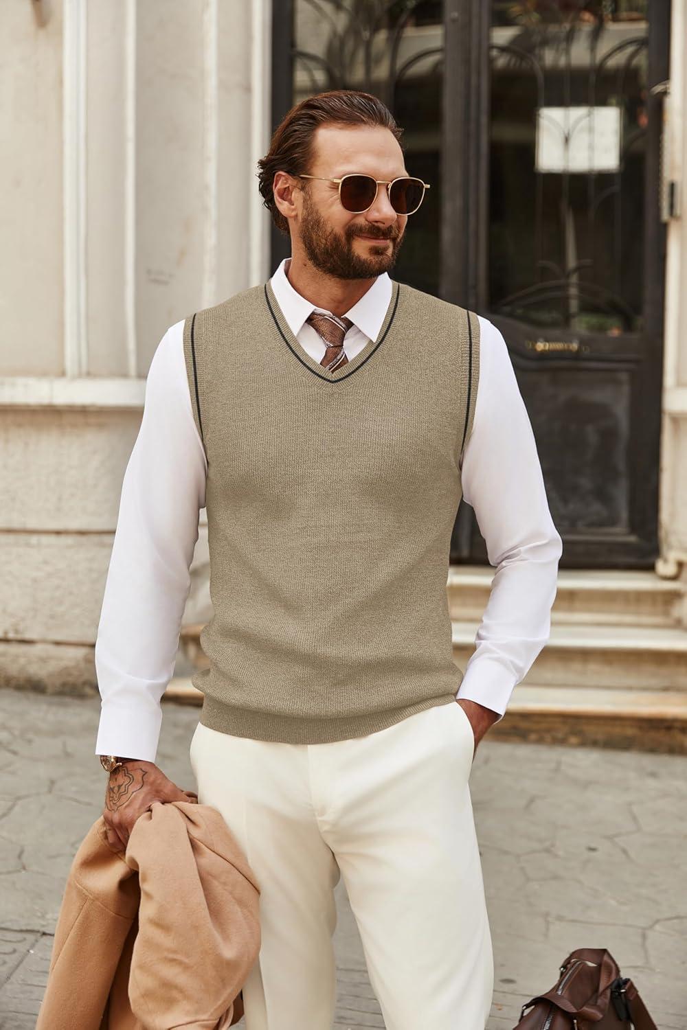 COOFANDY Men’s Sweater Vest V Neck Sleeveless Sweater Slim Fit Casual Knitted Pullover Sweater(Light Khaki)