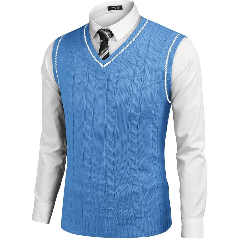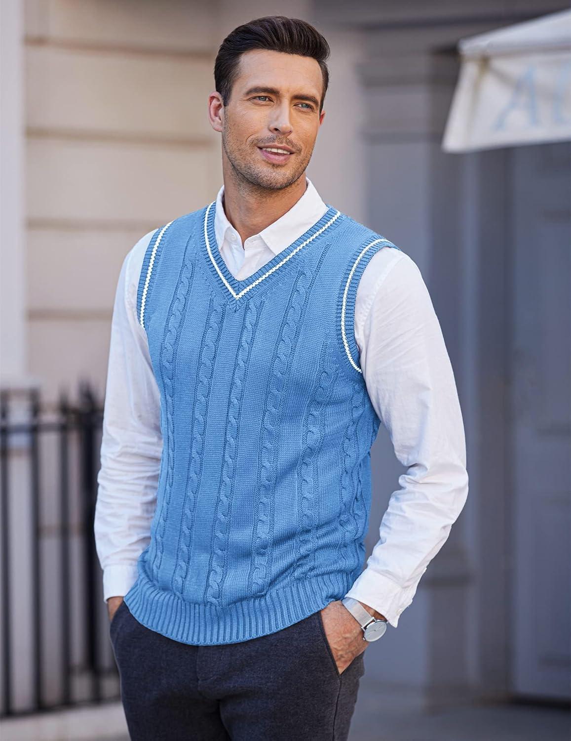COOFANDY Men’s Sweater Vest V Neck Slim Fit Casual Sleeveless Twisted Knitted Pullover Sweater(Blue)