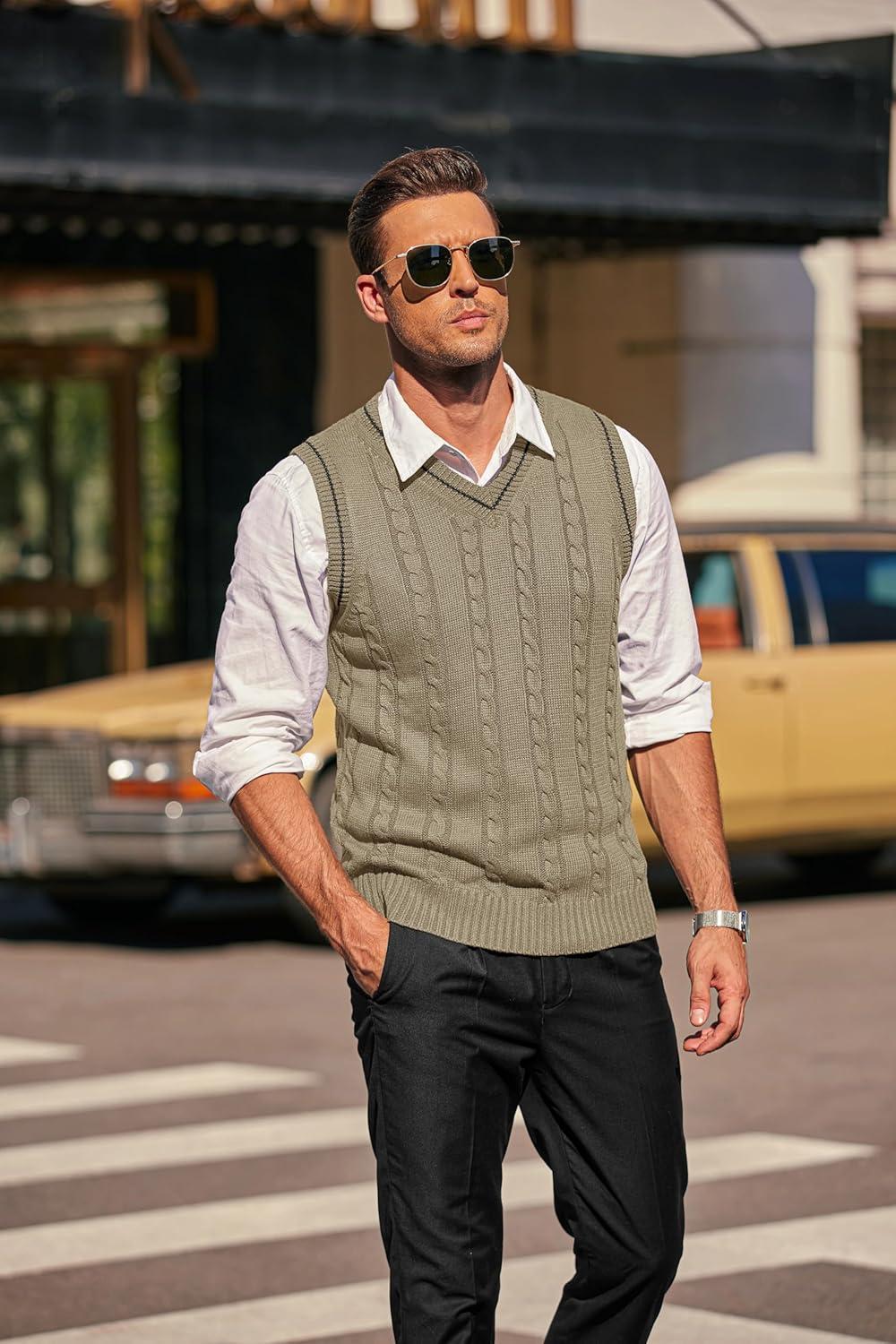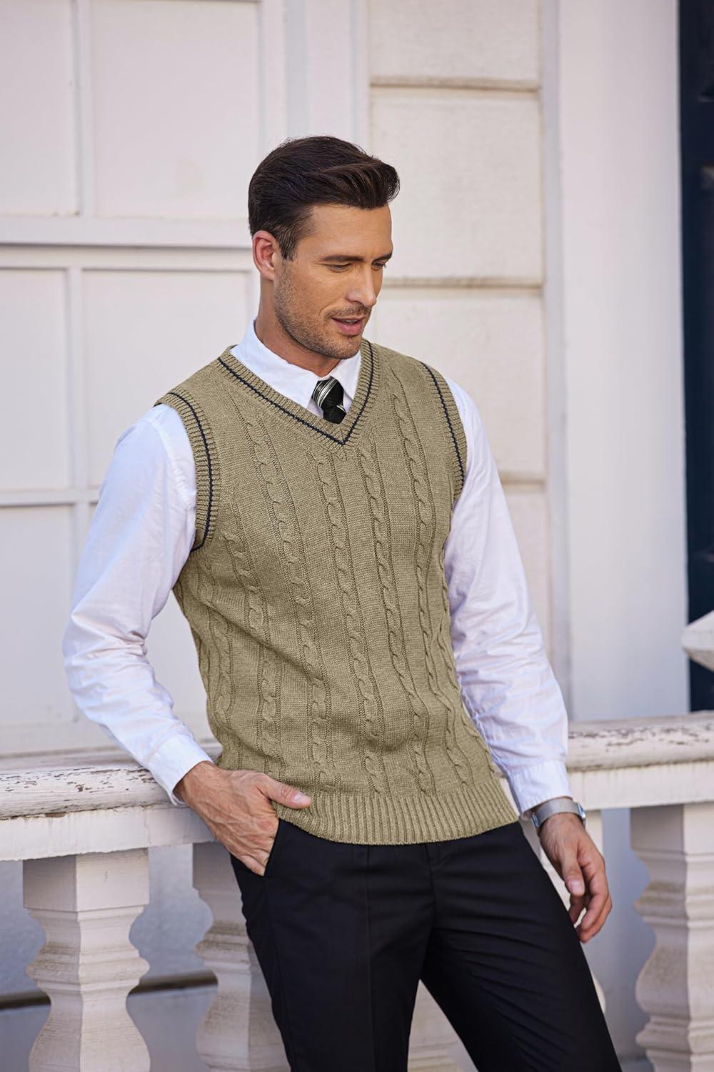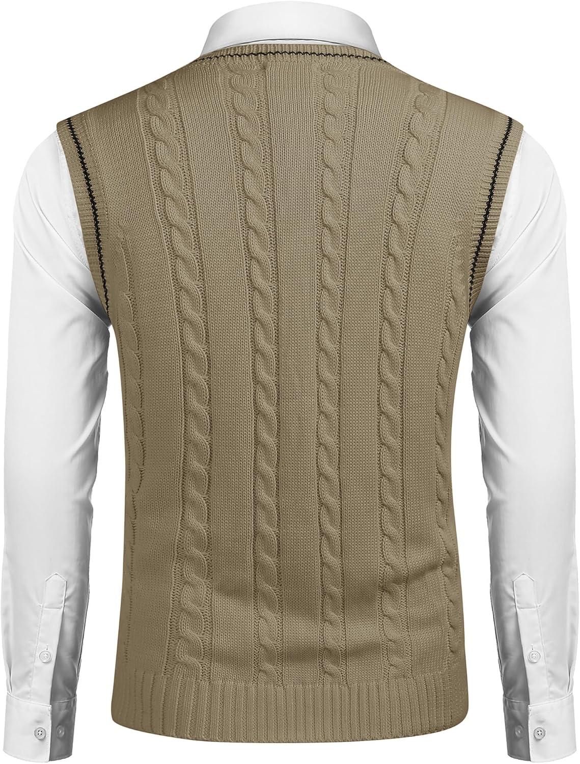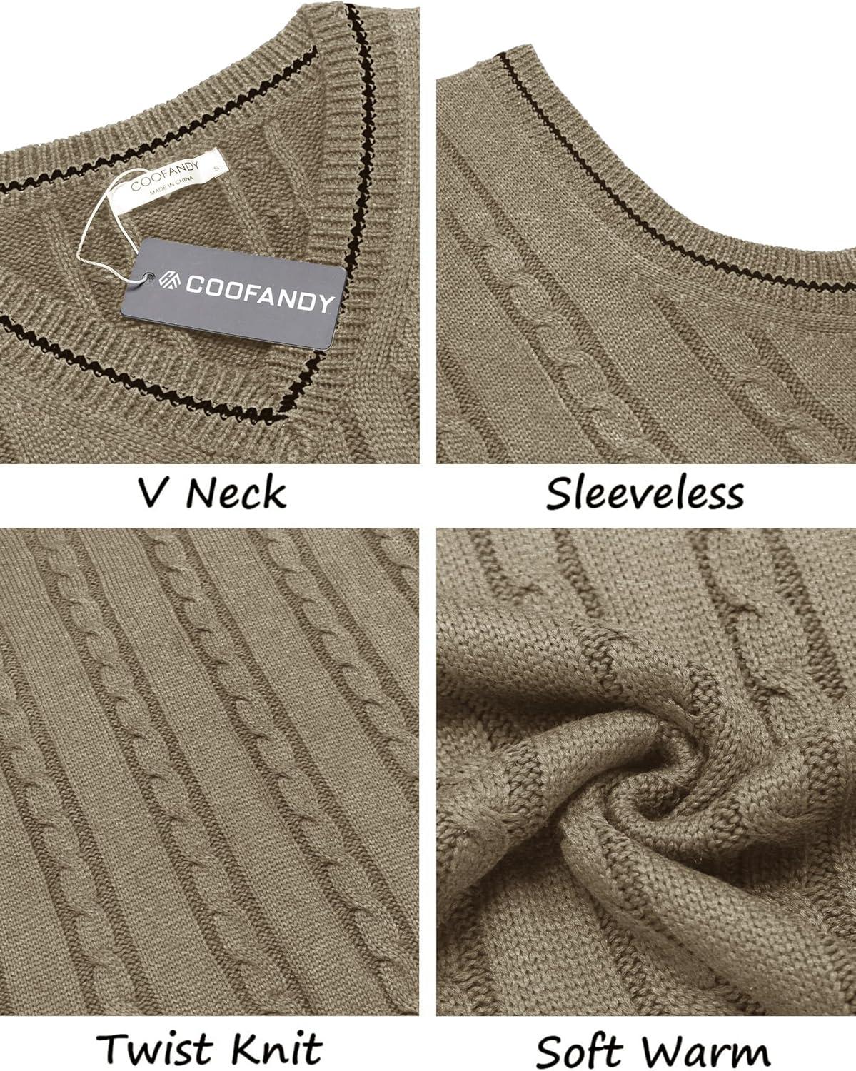COOFANDY Men's Sweater Vest V Neck Slim Fit Casual Sleeveless Twisted Knitted Pullover Sweater(Khaki)