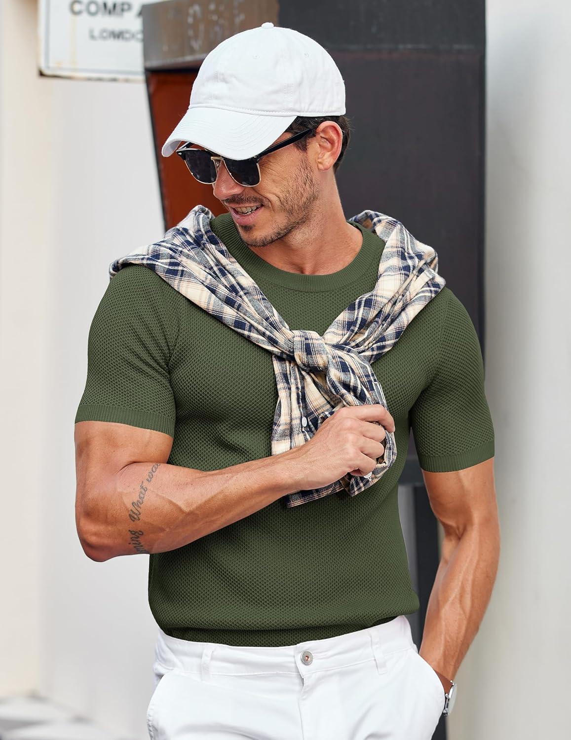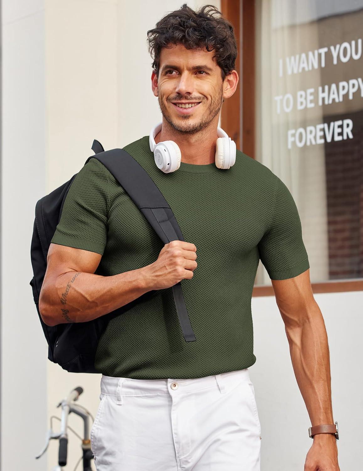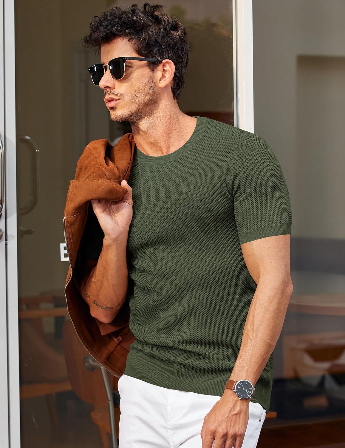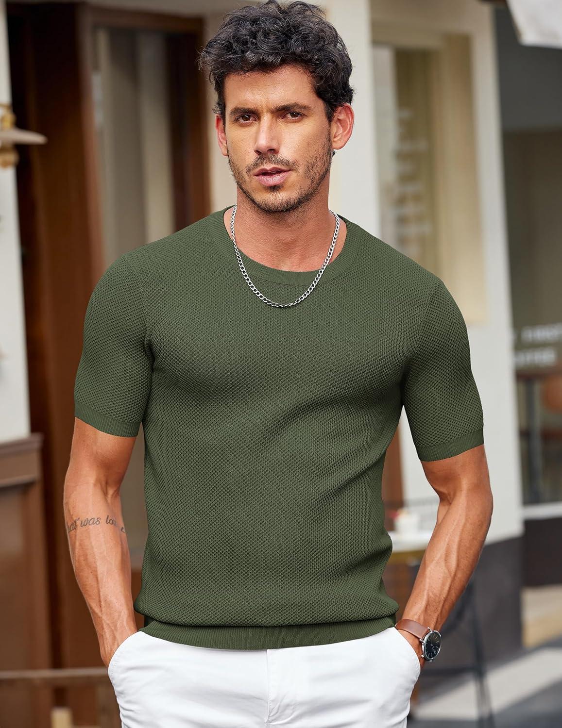 COOFANDY Men's T- Shirts Casual Short Sleeve Crewneck Shirts Solid Textured Knit Pullover Tees(Army Green)