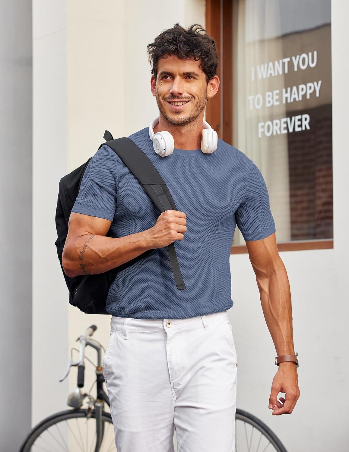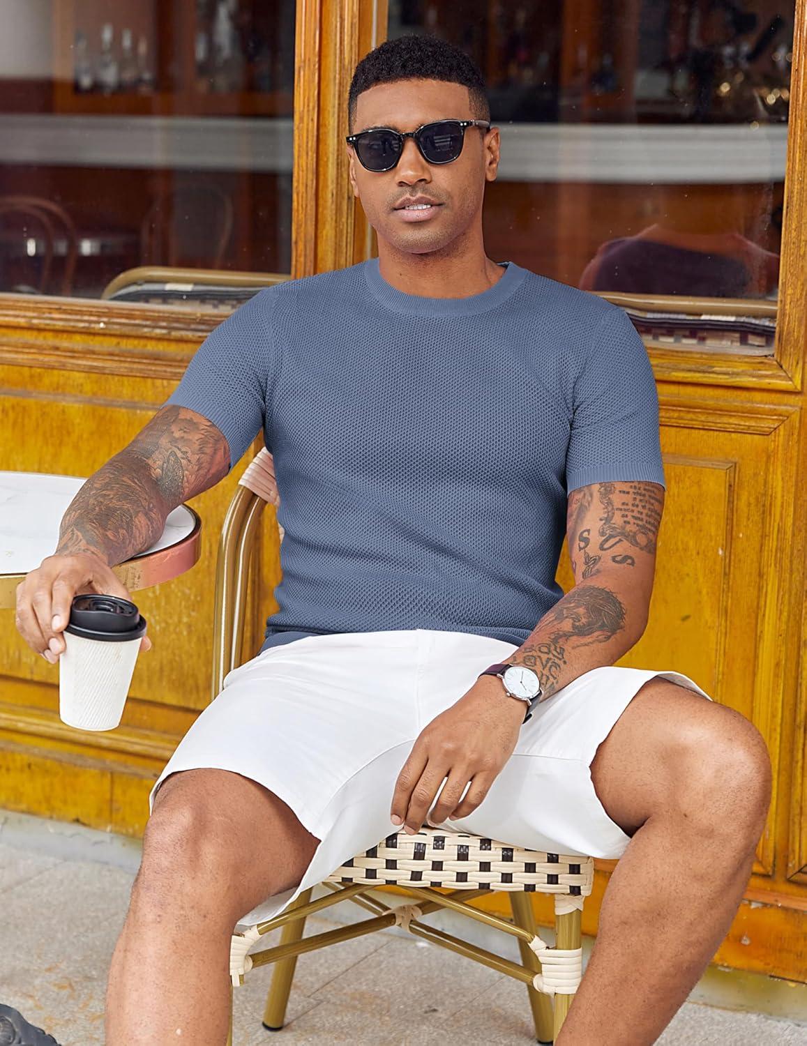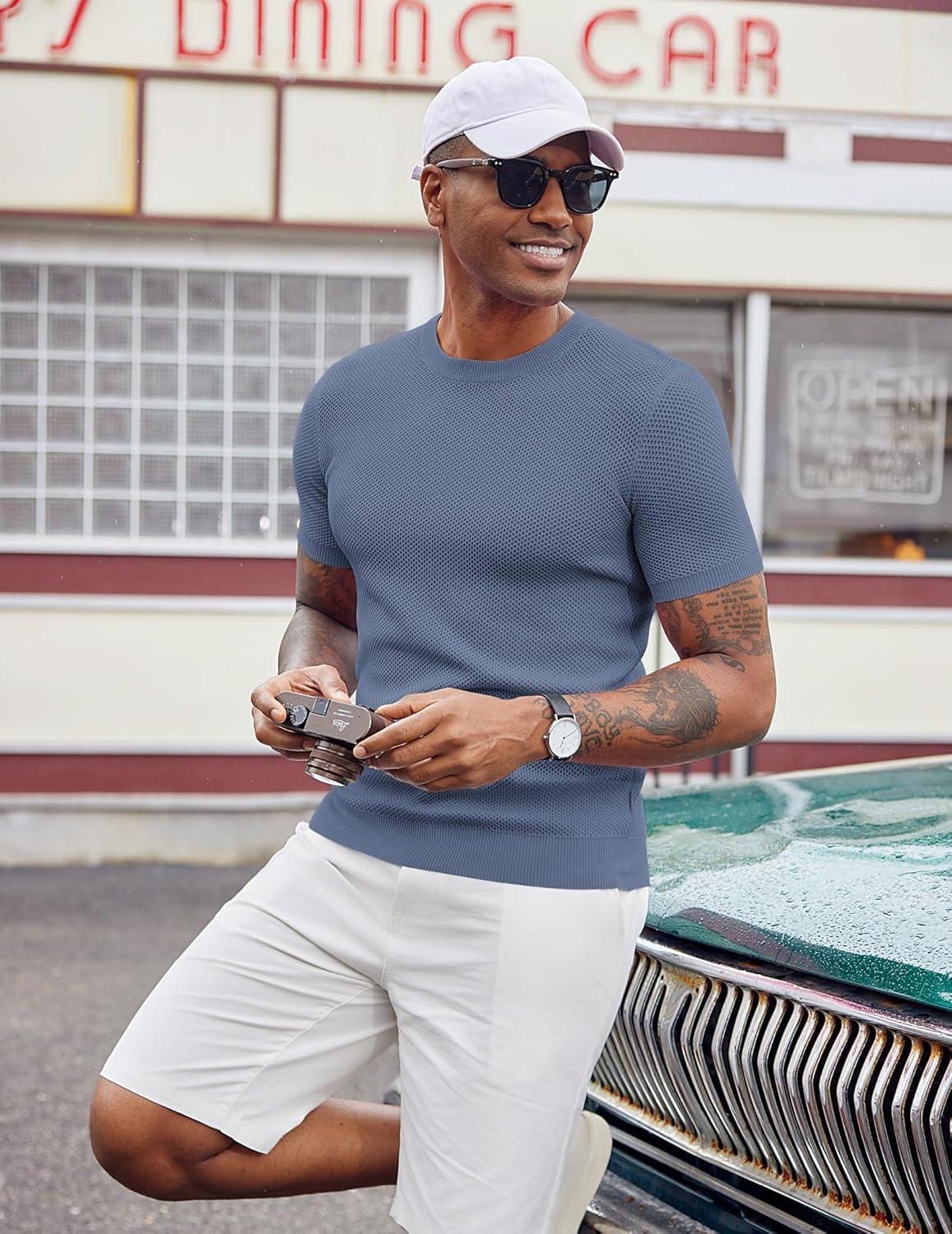 COOFANDY Men’s T- Shirts Casual Short Sleeve Crewneck Shirts Solid Textured Knit Pullover Tees(Grey Blue)