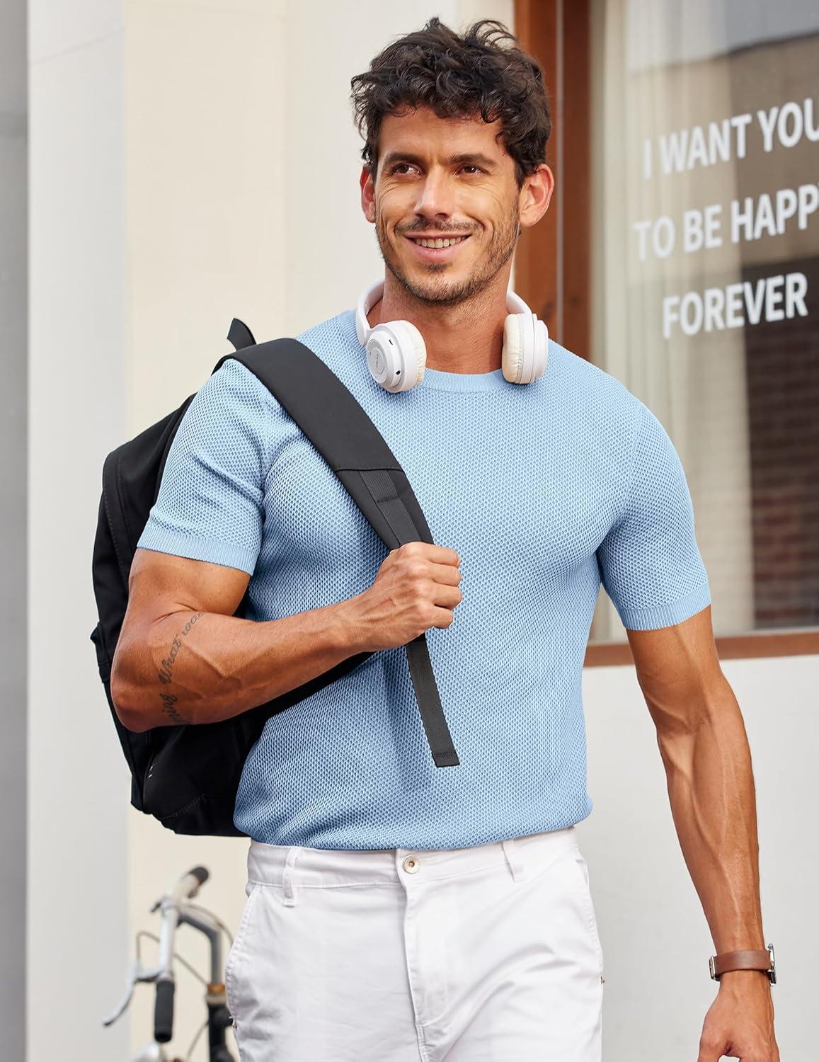 COOFANDY Men’s T- Shirts Casual Short Sleeve Crewneck Shirts Solid Textured Knit Pullover Tees(Light Blue)