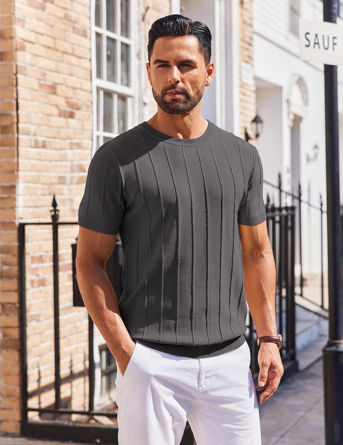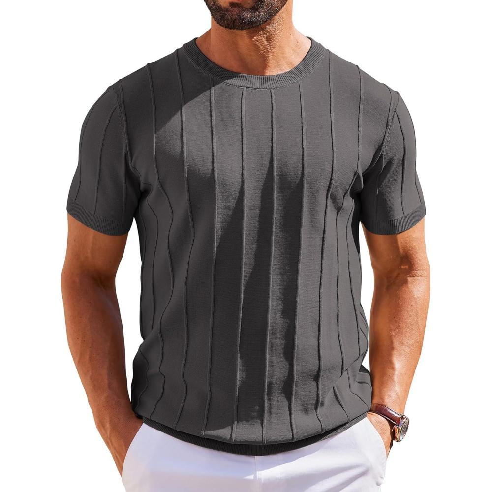 COOFANDY Men’s T- Shirts Short Sleeve Knit Sweater Shirt Casual Crewneck Ribbed Pullover Tees(Dark Grey)