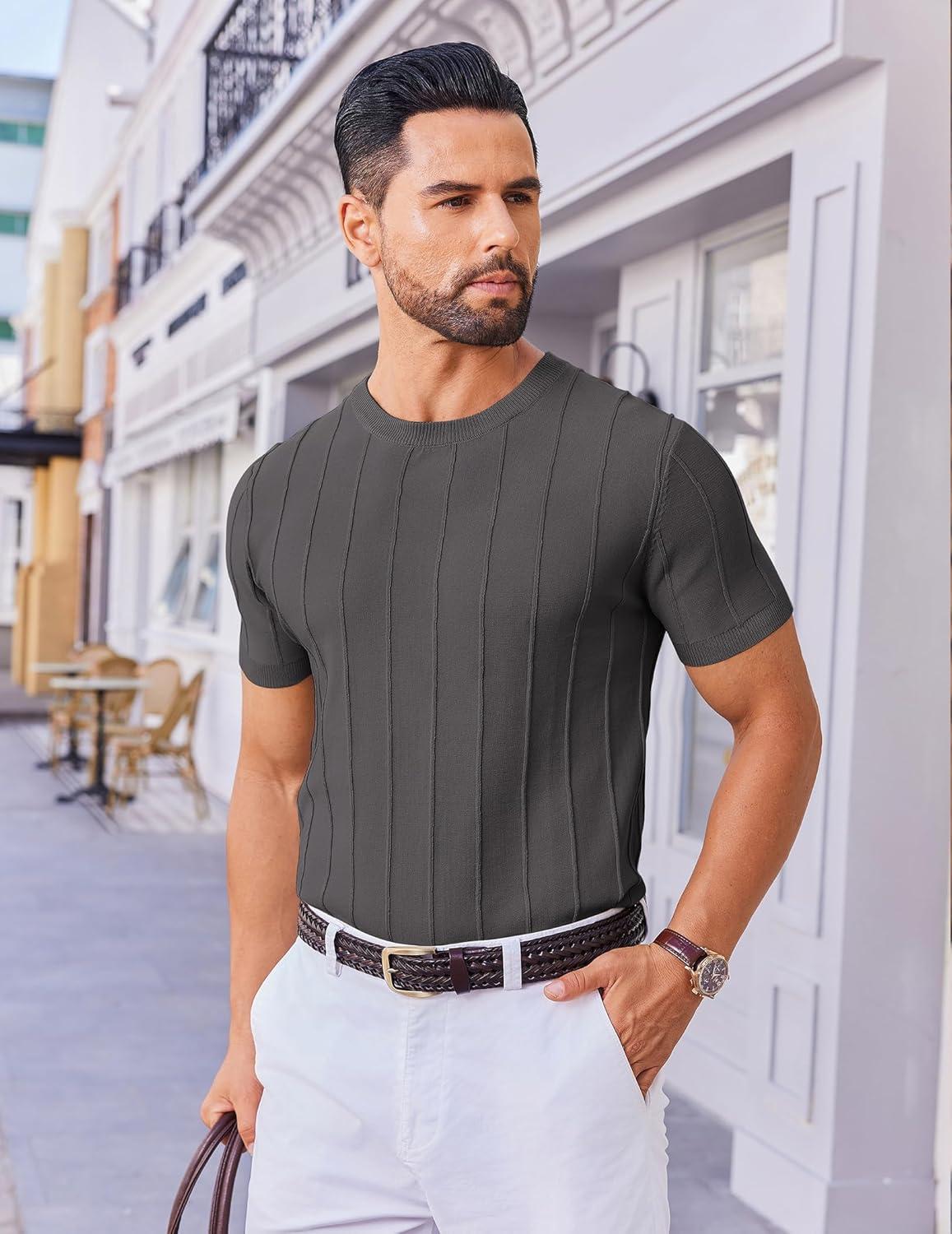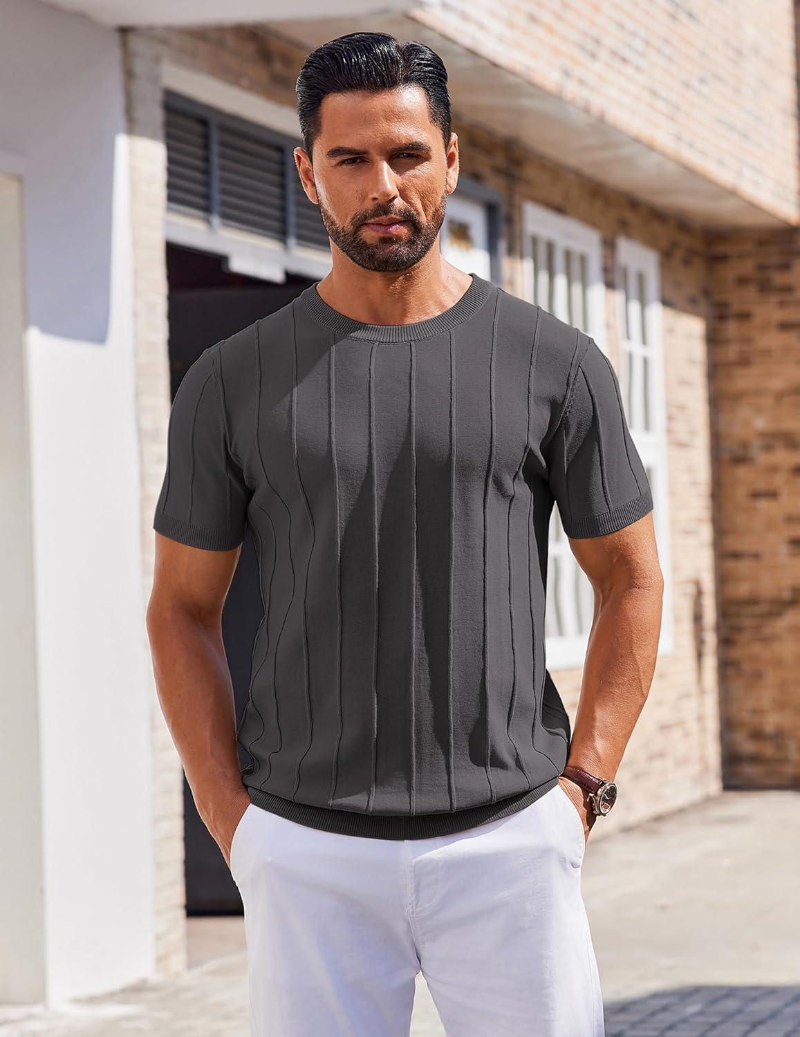 COOFANDY Men's T- Shirts Short Sleeve Knit Sweater Shirt Casual Crewneck Ribbed Pullover Tees(Dark Grey)
