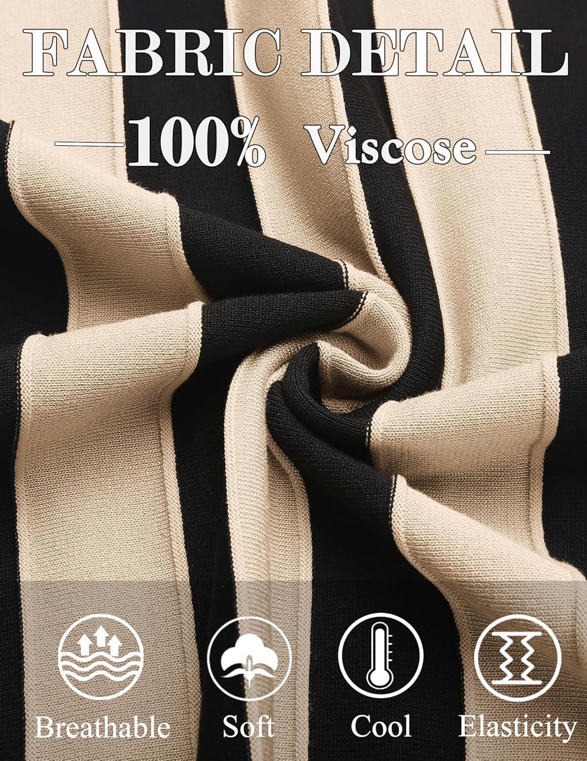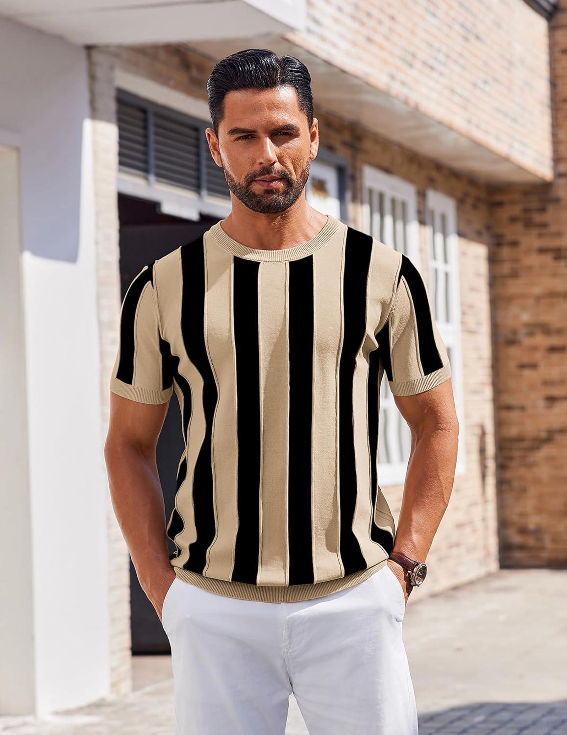 COOFANDY Men’s T- Shirts Short Sleeve Knit Sweater Shirt Casual Crewneck Ribbed Pullover Tees(Khaki – Black Stripes)