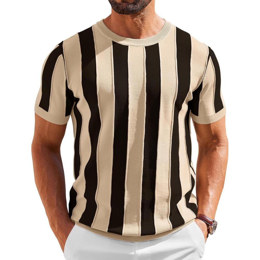 COOFANDY Men's T- Shirts Short Sleeve Knit Sweater Shirt Casual Crewneck Ribbed Pullover Tees(Khaki - Black Stripes)