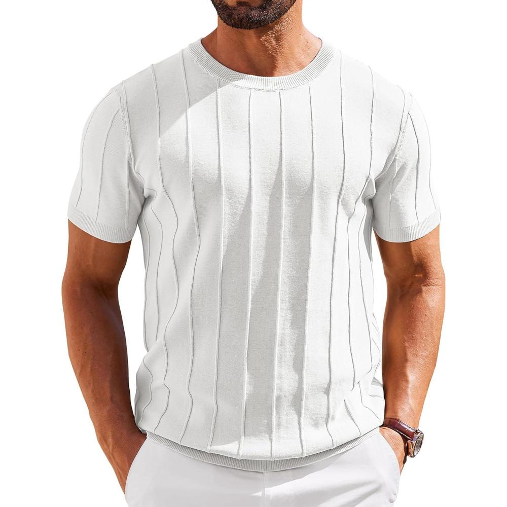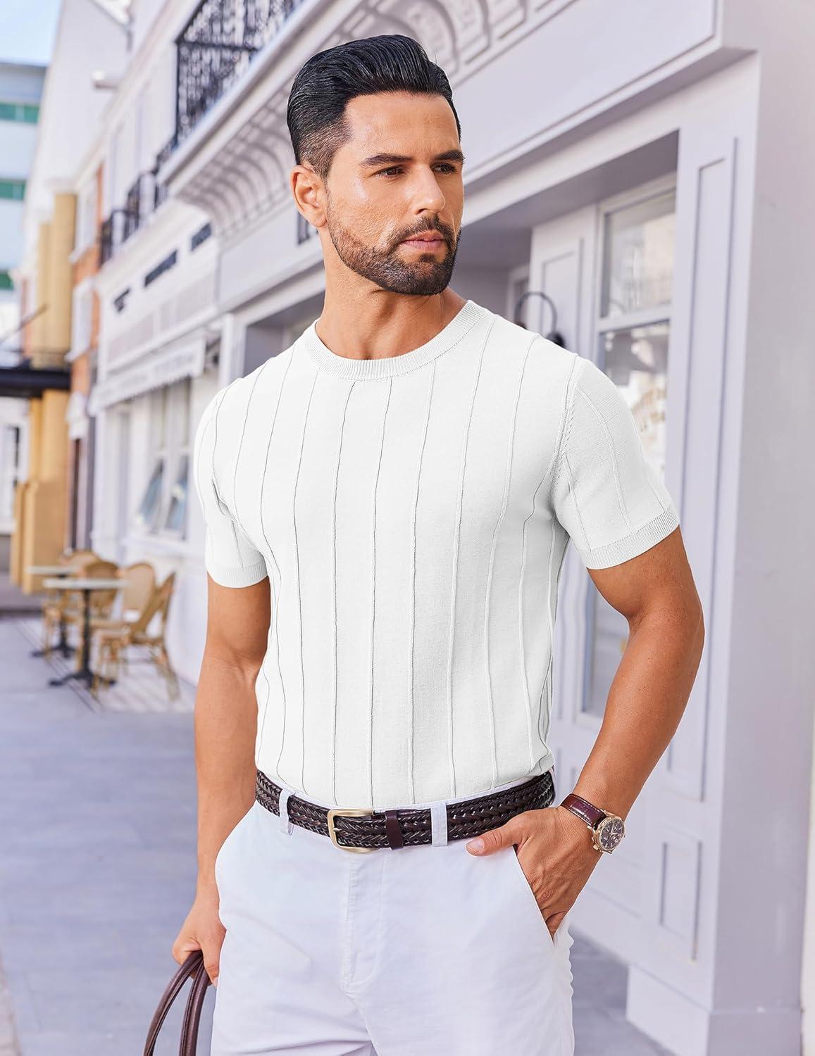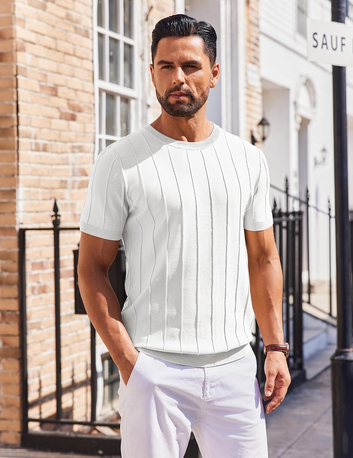 COOFANDY Men’s T- Shirts Short Sleeve Knit Sweater Shirt Casual Crewneck Ribbed Pullover Tees(White – Black Stripes)