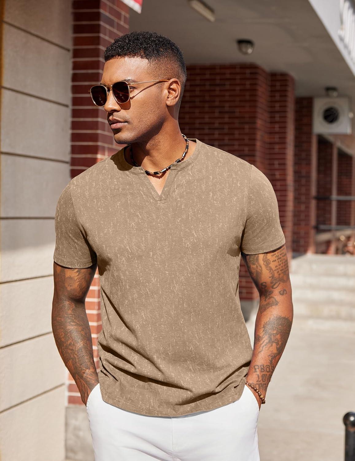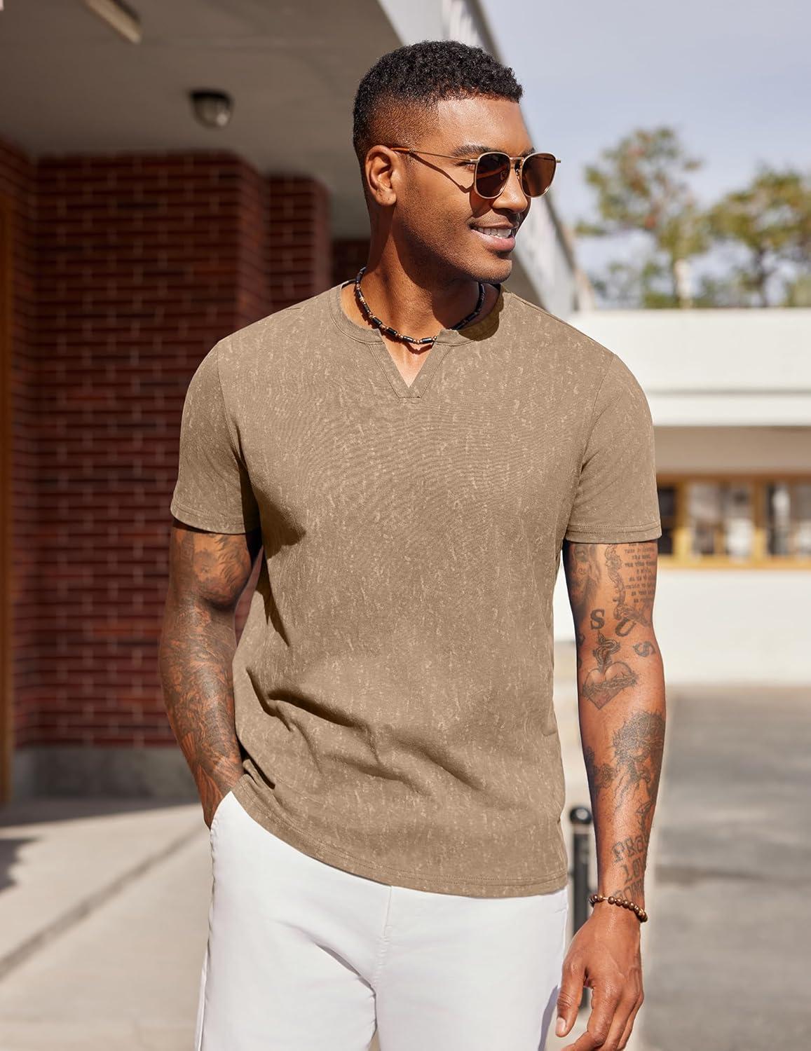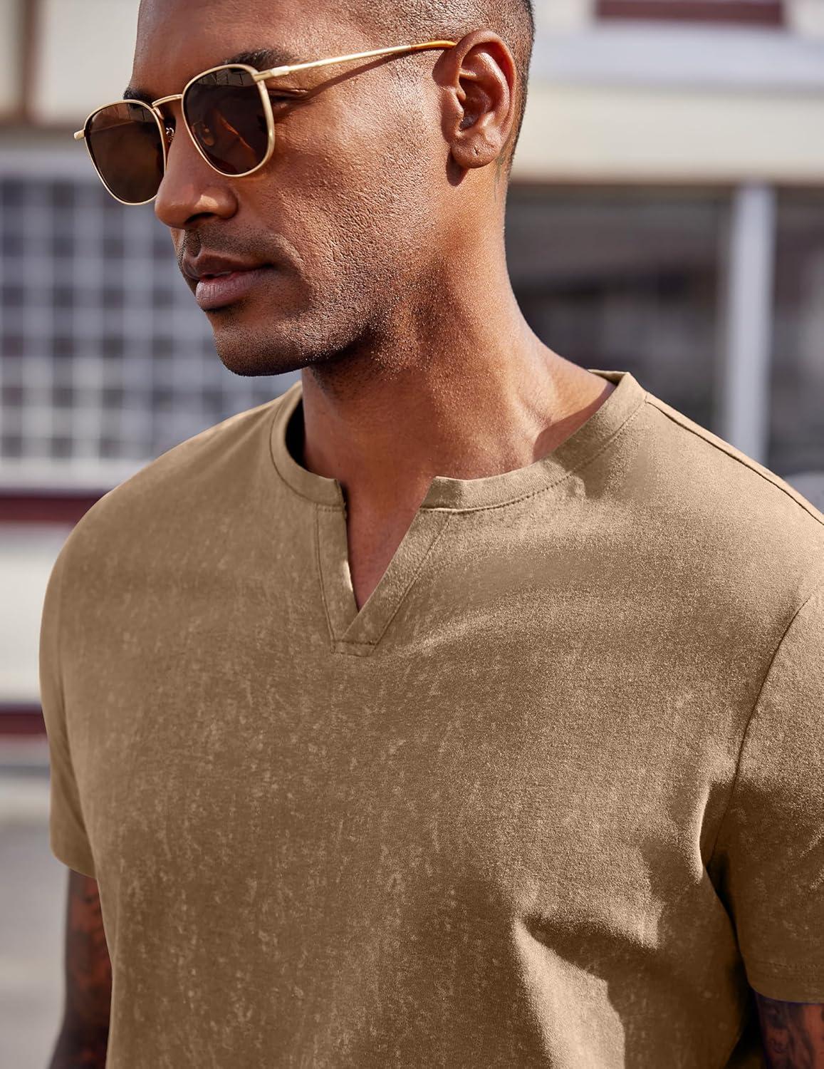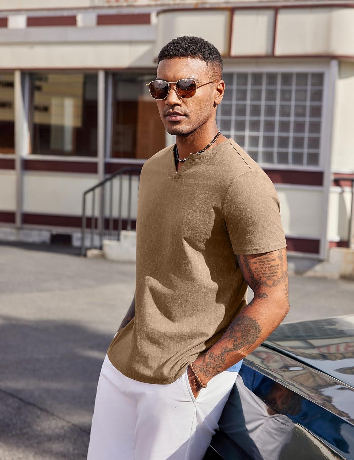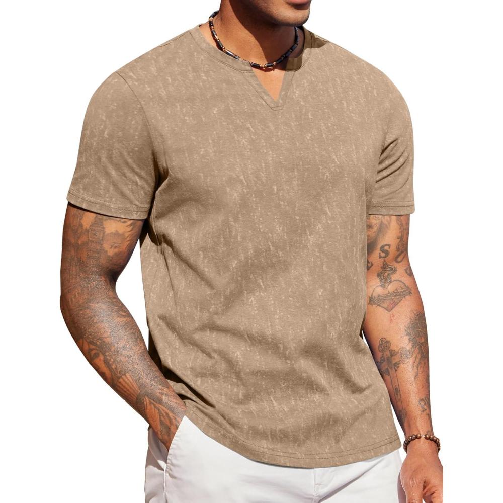 COOFANDY Mens T Shirts V Neck 100% Cotton Short Sleeve Casual Summer Vintage Tee Shirt(Khaki)