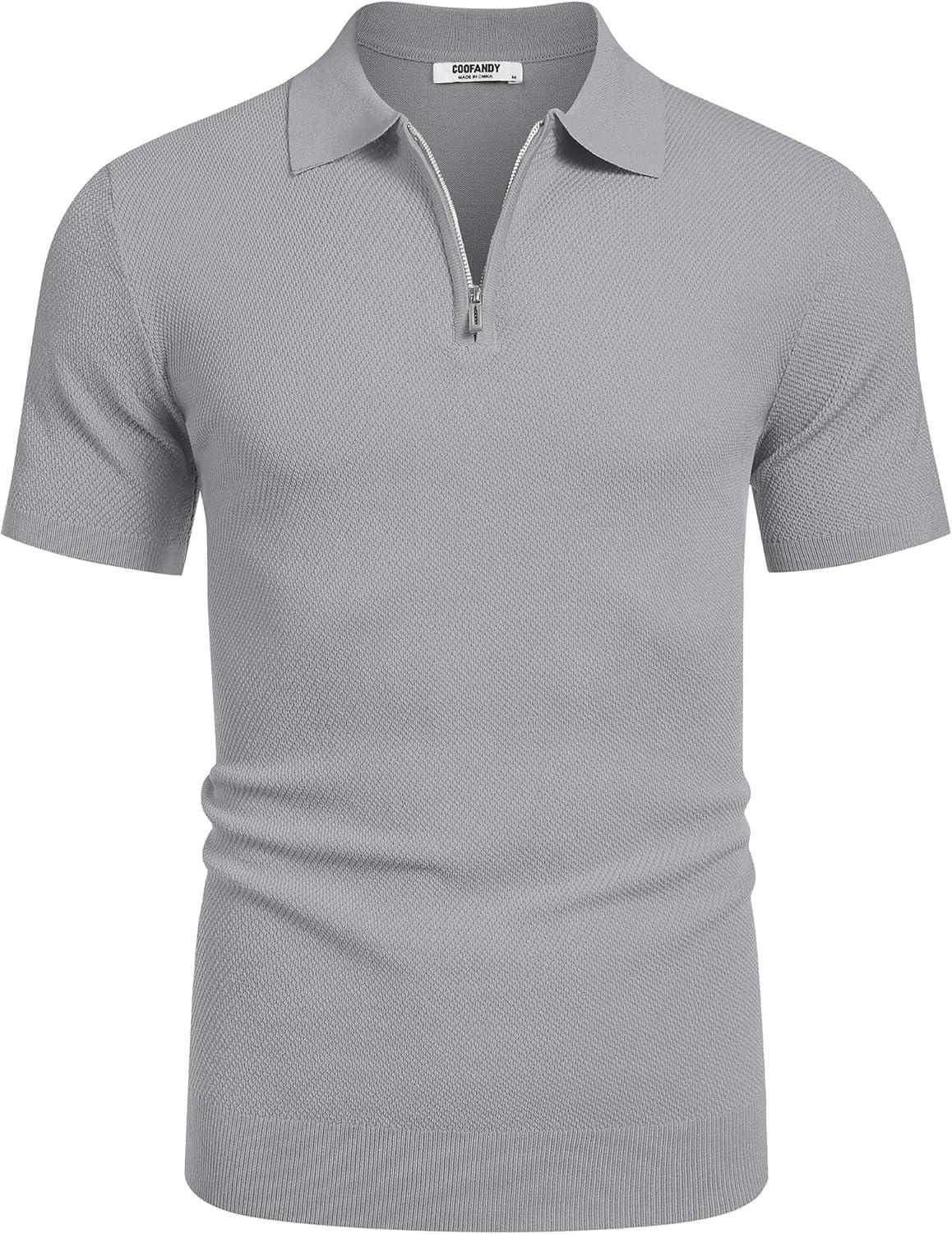 COOFANDY Mens Textured Knit Polo Shirts Zipper Polo Shirts Short Sleeve Casual Lightweight Golf Shirt(Light Grey)